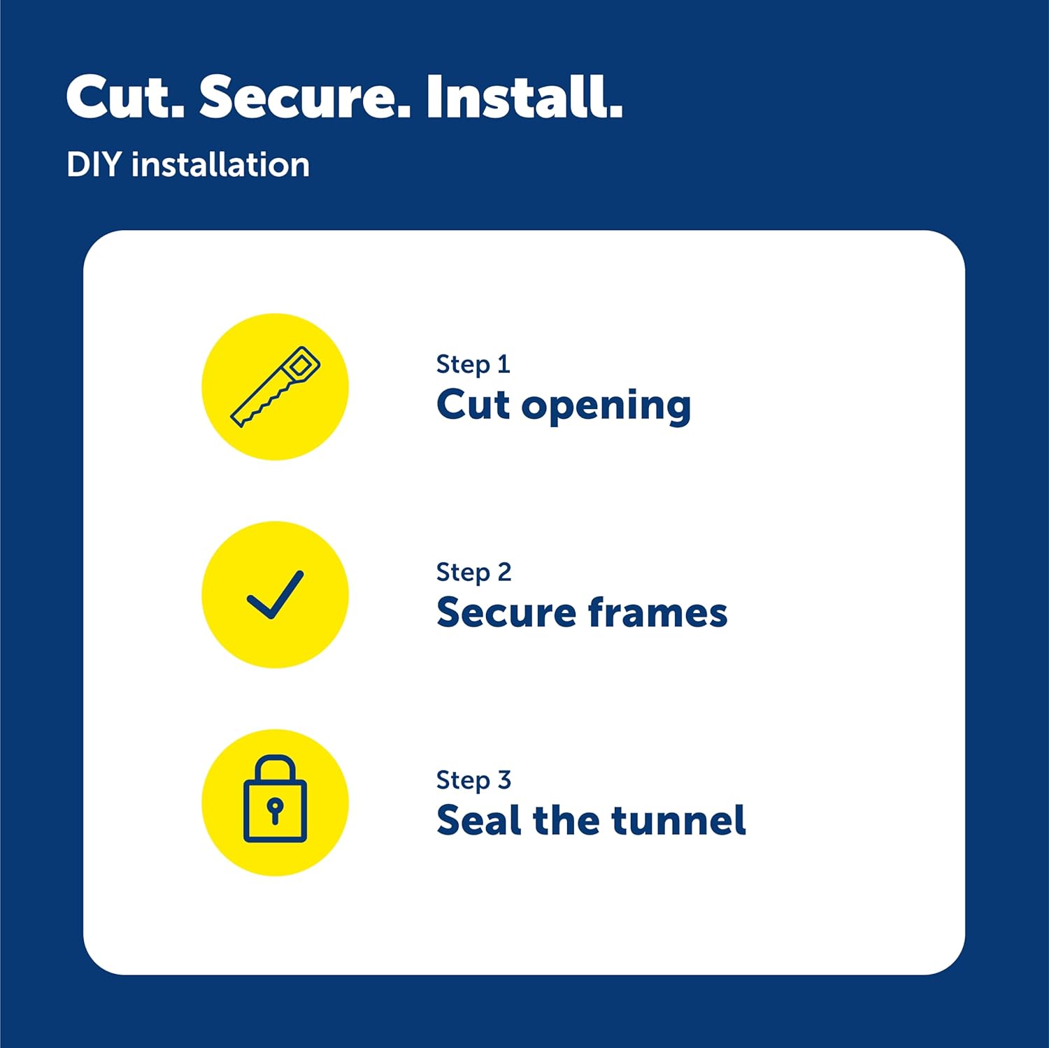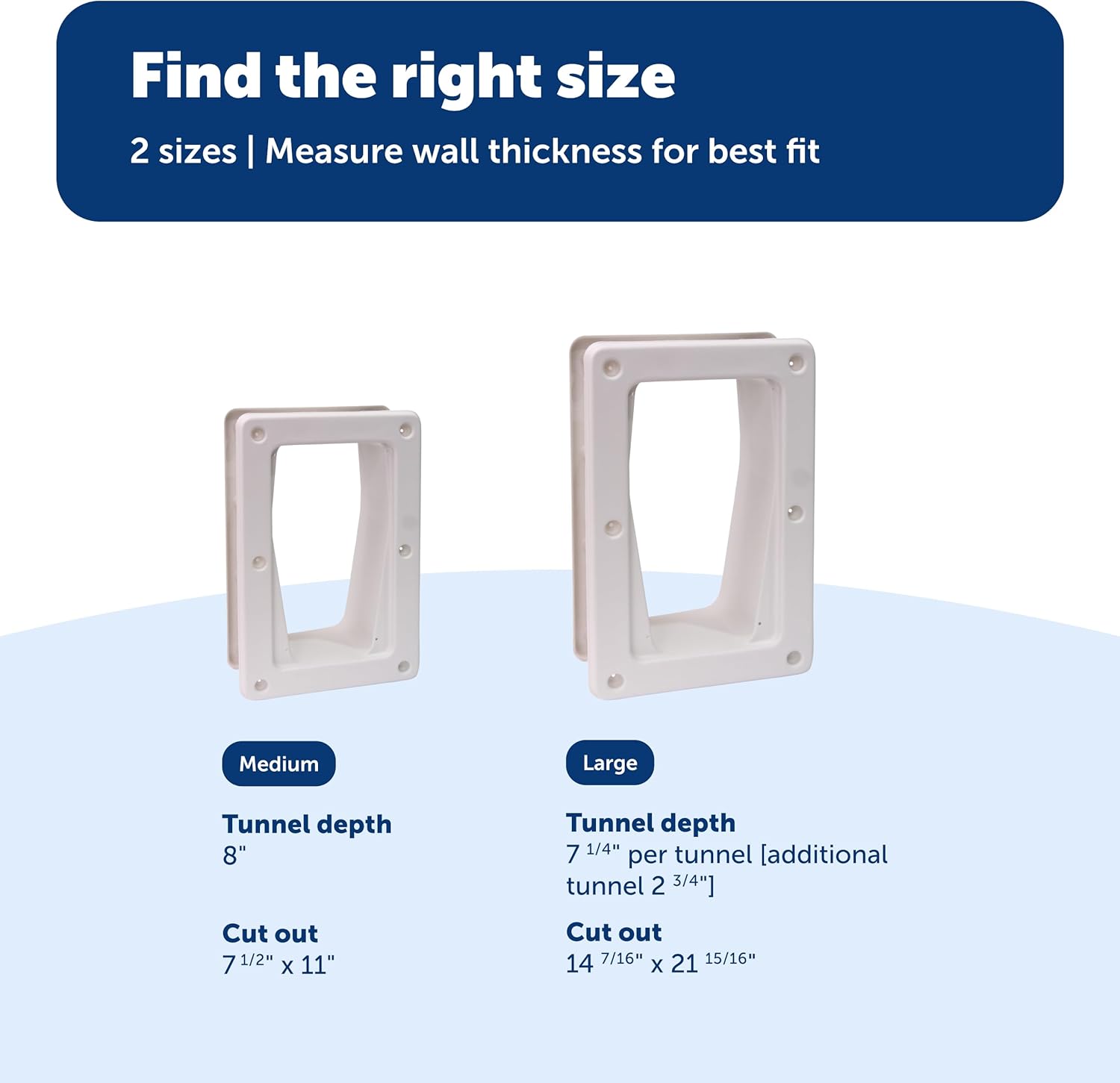 The PetSafe Electronic Pet Door Wall Conversion Kit offers pet parents an easy way to expand the placement of their electronic pet doors, allowing them to install in a variety of wall types while maintaining reliable performance and durability. This conversion kit is specifically designed for use in traditional framing and drywall construction, such as 2x4 or 2x6 walls, making it simple to add safe pet access in more locations throughout your home. For brick installations, the outdoor cutout is recessed to fit the frame securely, giving you more versatility for both indoor and outdoor placement. With this kit, small electronic pet doors can be installed in walls up to 8 inches thick, while large doors can fit walls up to 7 1/4 inches. For even thicker walls, extension tunnels are available separately, each adding 2 3/4 inches to the depth. The telescoping design makes adjustments quick and straightforward, giving you the ability to create a custom fit wall passage that matches the specific dimensions of your home. The durable construction ensures lasting performance while maintaining the security of your electronic pet door, so your furry family member can move freely between spaces while you enjoy peace of mind. Since 1988, PetSafe has been driven by a simple belief: safe, healthy pets lead to happier lives for pets and their families. For over 25 years, we've been dedicated to enhancing the lives of pets and the people who love them, treating every pet as a cherished family member and delivering life-changing innovations designed to enrich every moment. With U.S. roots and a global reach, our vet- and trainer-recommended products are built for every pet and backed by exceptional customer support. From backyards to dog parks, we're on a mission to create fields of joy for happy, healthy, and safe pets.