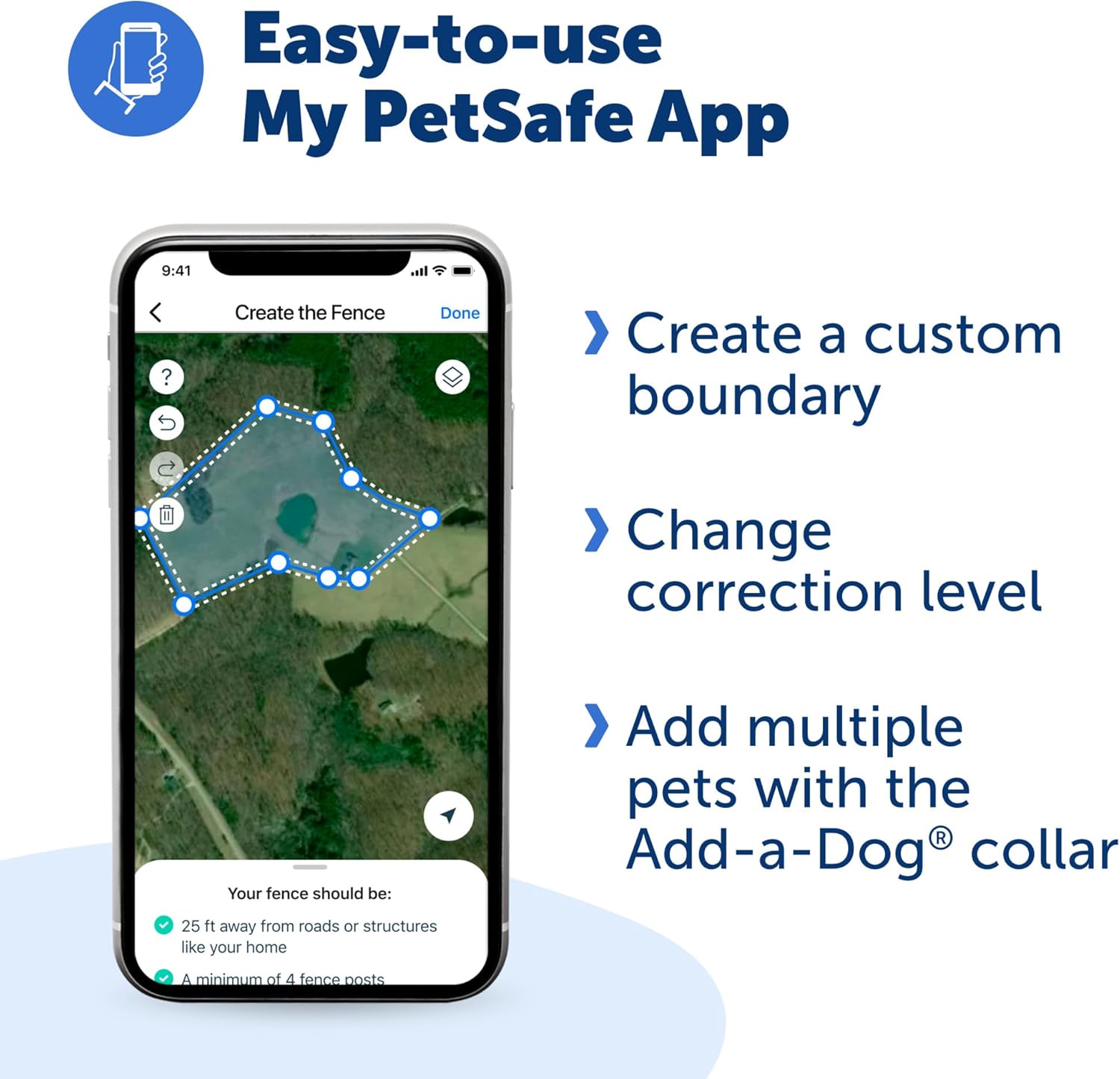 When it comes to your pet’s safety, accuracy matters most. The PetSafe Guardian GPS Dog Fence provides advanced containment powered by AccuGuard technology, combining GPS satellite data, real-time motion detection, and intelligent algorithms to deliver one of the most reliable virtual fences available. Unlike traditional invisible dog fence systems, this option requires no digging, no wires, and no subscription fees—giving you a safe, reliable, and cost-effective solution for keeping your dog protected. Set up is simple and can be completed in as little as 1–2 hours. Using the My PetSafe app, you can design custom-shaped boundaries that fit your yard or property, tailoring them to suit your needs. The wireless design offers the flexibility to adjust your pet’s containment area anytime, making it an excellent choice for both home and travel containment for dogs. With support for up to five dogs, you can easily expand the system by adding extra collars for each member of your furry family. The collar itself is designed for both durability and comfort. Built as a waterproof collar with a sleek, lightweight profile, it ensures a comfortable fit while standing up to rain, splashes, and play. The rechargeable long lasting battery provides up to five days of use on a single charge, keeping your pet safe without constant recharging. Since 1988, PetSafe has been driven by a simple belief: safe, healthy pets lead to happier lives for pets and their families. For over 25 years, we've been dedicated to enhancing the lives of pets and the people who love them, treating every pet as a cherished family member and delivering life-changing innovations designed to enrich every moment. With U.S. roots and a global reach, our vet- and trainer-recommended products are built for every pet and backed by exceptional customer support. From backyards to dog parks, we're on a mission to create fields of joy for happy, healthy, and safe pets.