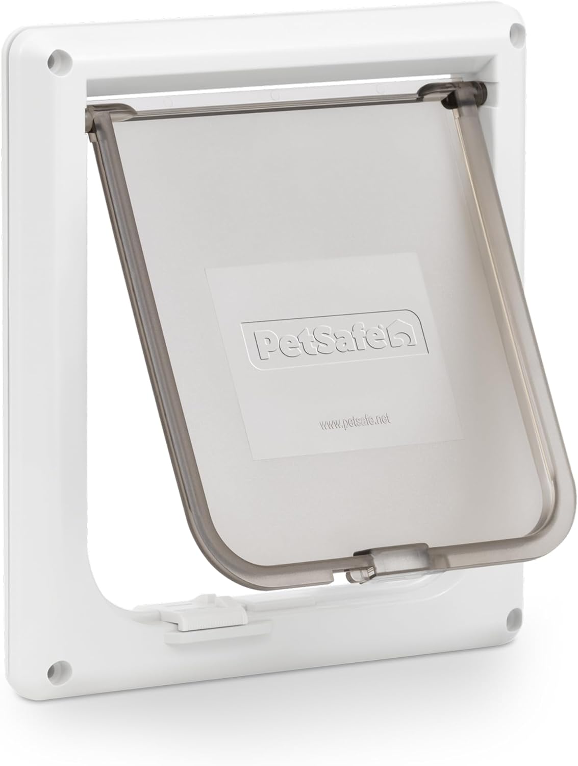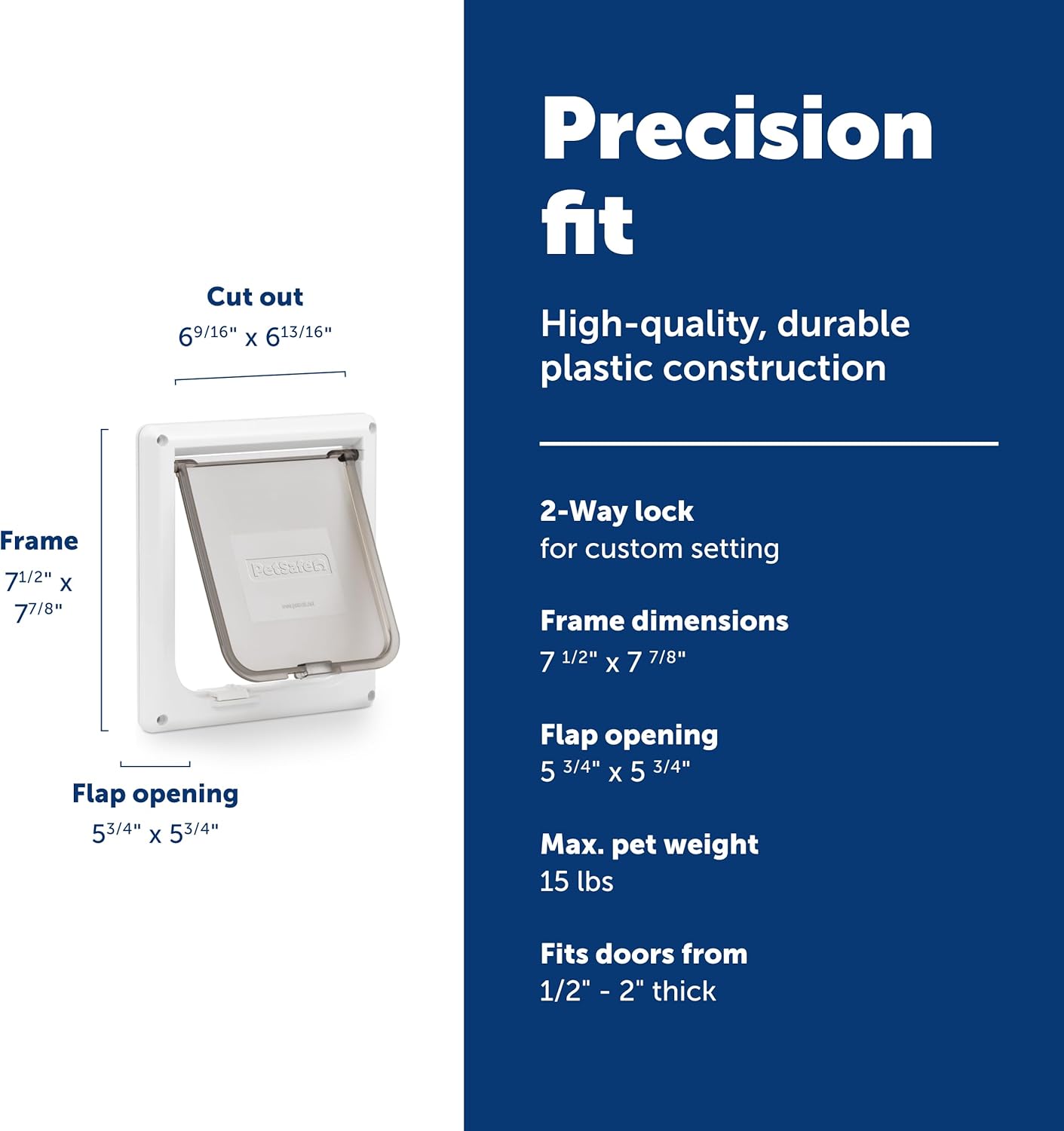 Product Description Give your cat private access to their litter box, pet feeder, or personal space with the PetSafe Interior 2-Way Locking Cat Door. This indoor pet door flap allows for easy movement between rooms, even when the human door is closed, giving cats the freedom they deserve while keeping dogs and kids away from designated cat-only areas. The tinted privacy door features a translucent cat flap made from durable plastic material and includes a 2-way sliding locking mechanism to control in-out access for nighttime privacy, intruder protection, and behavior management. Simple to use and built for pet owner convenience, the quick DIY flap installs hassle-free on most interior doors, including wood, storm, metal, PVC, and panel styles from 1.5 - 2 inches thick. A cutting template, installation guide, and full hardware kit are included for an easy setup. Whether you’re improving litter box privacy or setting boundaries in shared spaces, the PetSafe Interior 2-Way Locking Cat Door interior cat door offers the freedom and access control you and your cat need. Since 1988, PetSafe has been driven by a simple belief: safe, healthy pets lead to happier lives for pets and their families. For over 25 years, we've been dedicated to enhancing the lives of pets and the people who love them, treating every pet as a cherished family member and delivering life-changing innovations designed to enrich every moment. With U.S. roots and a global reach, our vet- and trainer-recommended products are built for every pet and backed by exceptional customer support. From backyards to dog parks, we're on a mission to create fields of joy for happy, healthy, and safe pets. Amazon.com PetSafe 2-Way Locking Cat DoorThe ProductGive your cat access to her litter box without giving her litter box access to your home! This durable cat flap fits any interior door that’s 1” to 2” (2.5 cm - 5 cm) thick. Your cat can come and go from the room where her litter box is housed – even when the door is closed. A sliding lock gives you the option to bar access whenever you choose.Features Interior use only For pets up to 15 lbs (6.8 kg) High-impact plastic frame Easy-to-use slide lock 2-way lock options: opened or locked Fits interior doors 3/16" to 2" thick (2.5 cm x 5 cm) Flap opening dimensions: 5-3/4"w x 5-3/4"h (14.6 cm x 14.6 cm) Outer frame dimensions: 7-1/2"w x 7-7/8"h (19 cm x 20 cm) Color: white