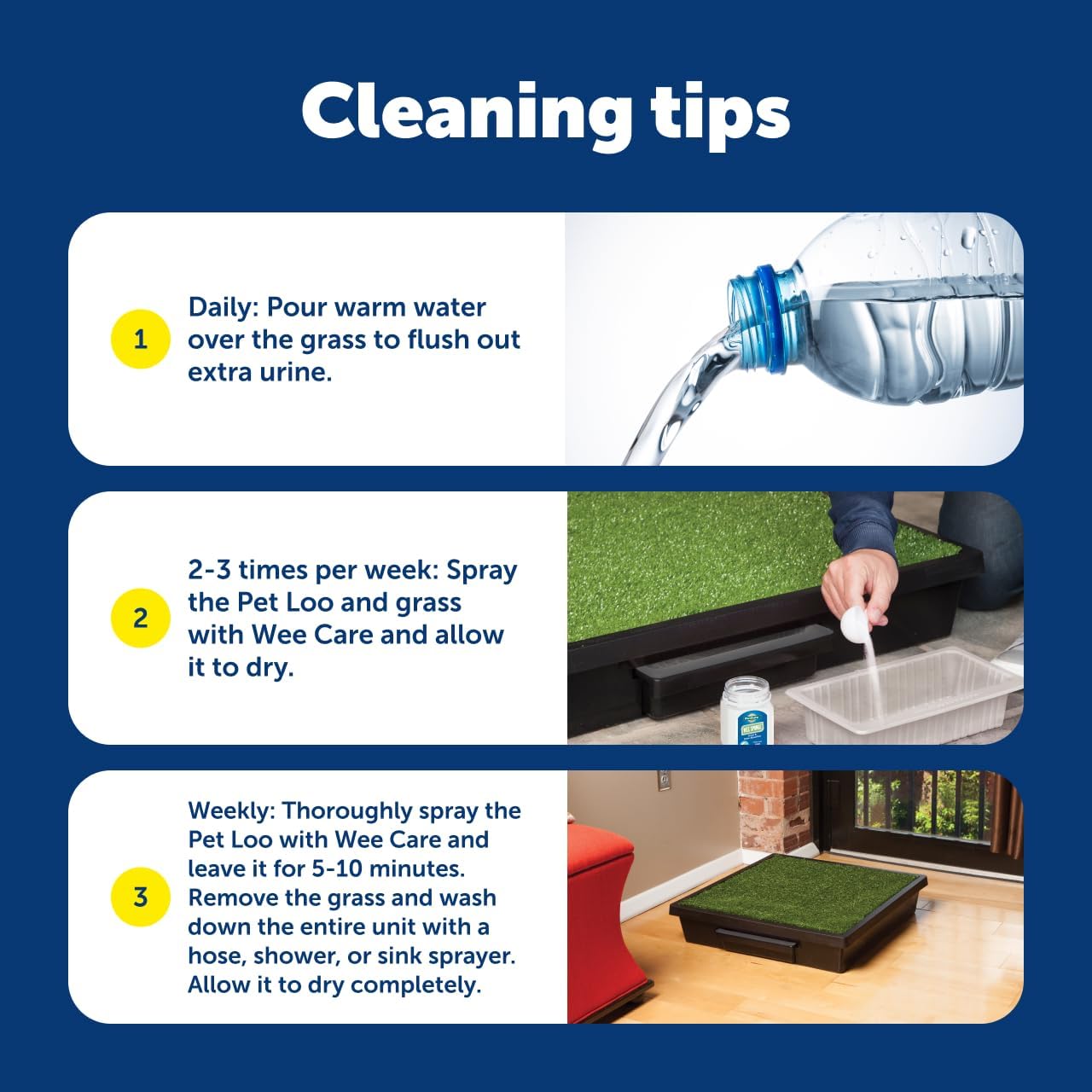 The PetSafe Pet Loo is the perfect solution for busy or urban pet parents. This portable indoor/outdoor toilet works for dogs, cats and small pets. The Pet Loo is a convenient alternative to pee pads. No more coming home for lunch or rushing home after work to let your pup out. Train your pet to potty inside! The urine conveniently drains through the grass mat into the Pee-Pod and the Wee Sponge powder absorbs the liquid on contact to trap odors and help make clean-up easy. Use PetSafe Wee Care Enzyme Cleaner to spray on the Pet Loo grass and base to help keep your Pet Loo smelling fresh. Available in 3 sizes for small to large breeds. PetSafe brand is here to help you and your pet LIVE HAPPY TOGETHER.