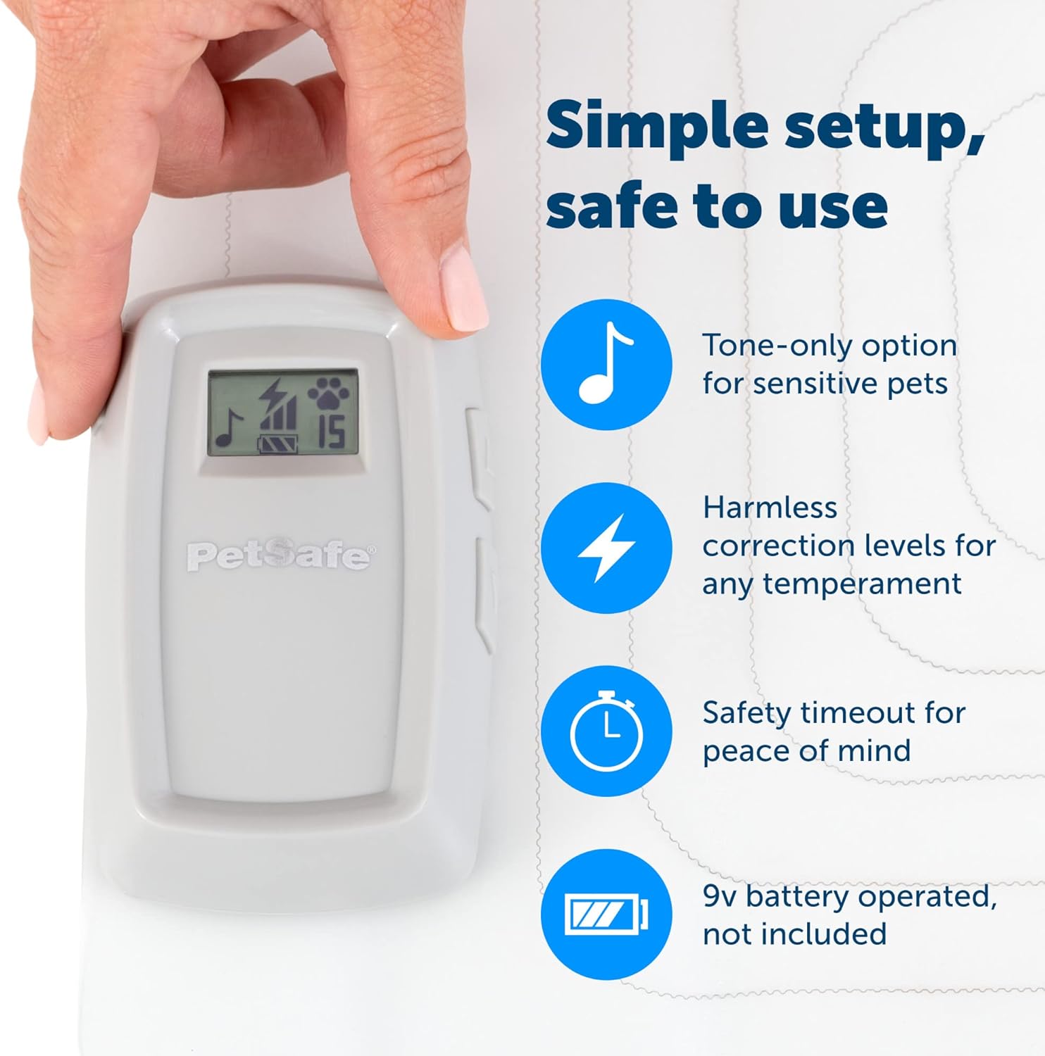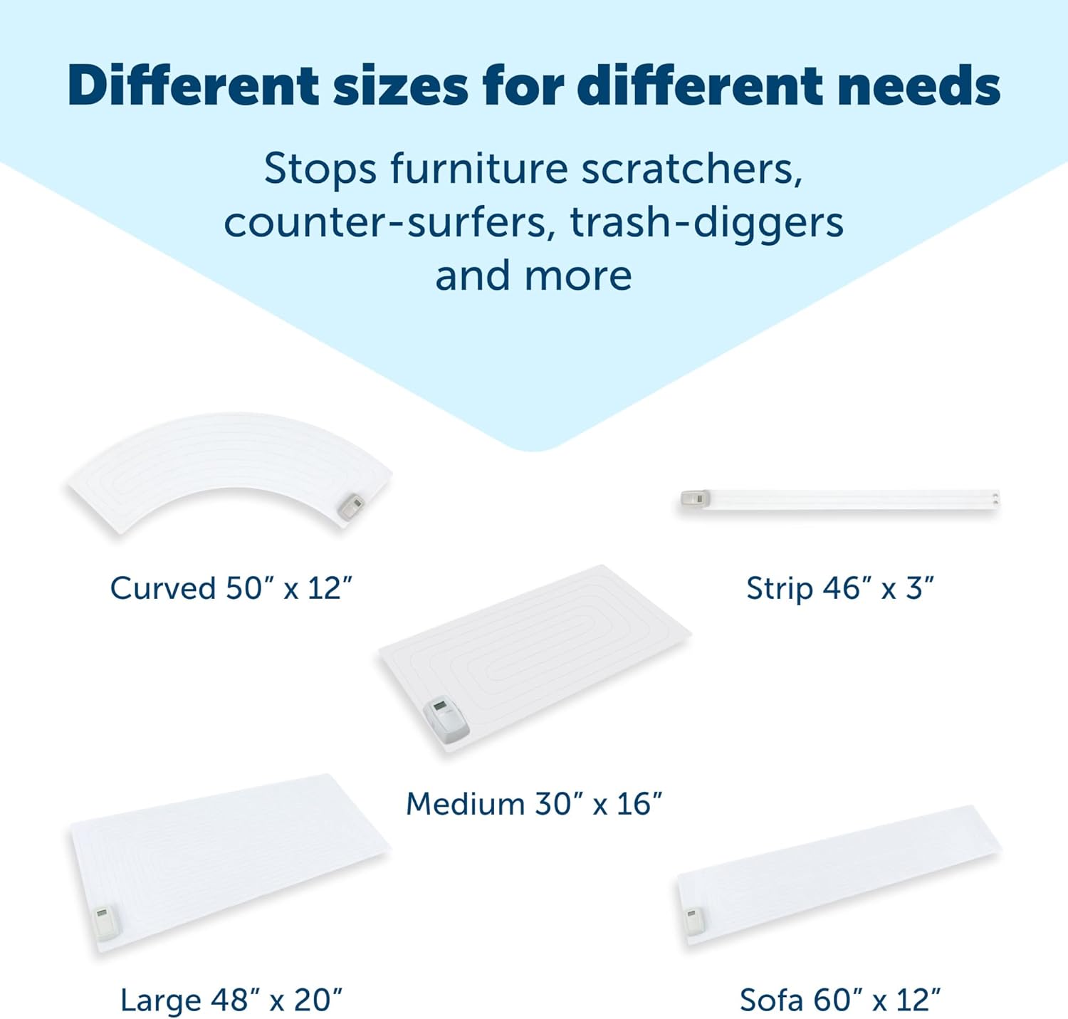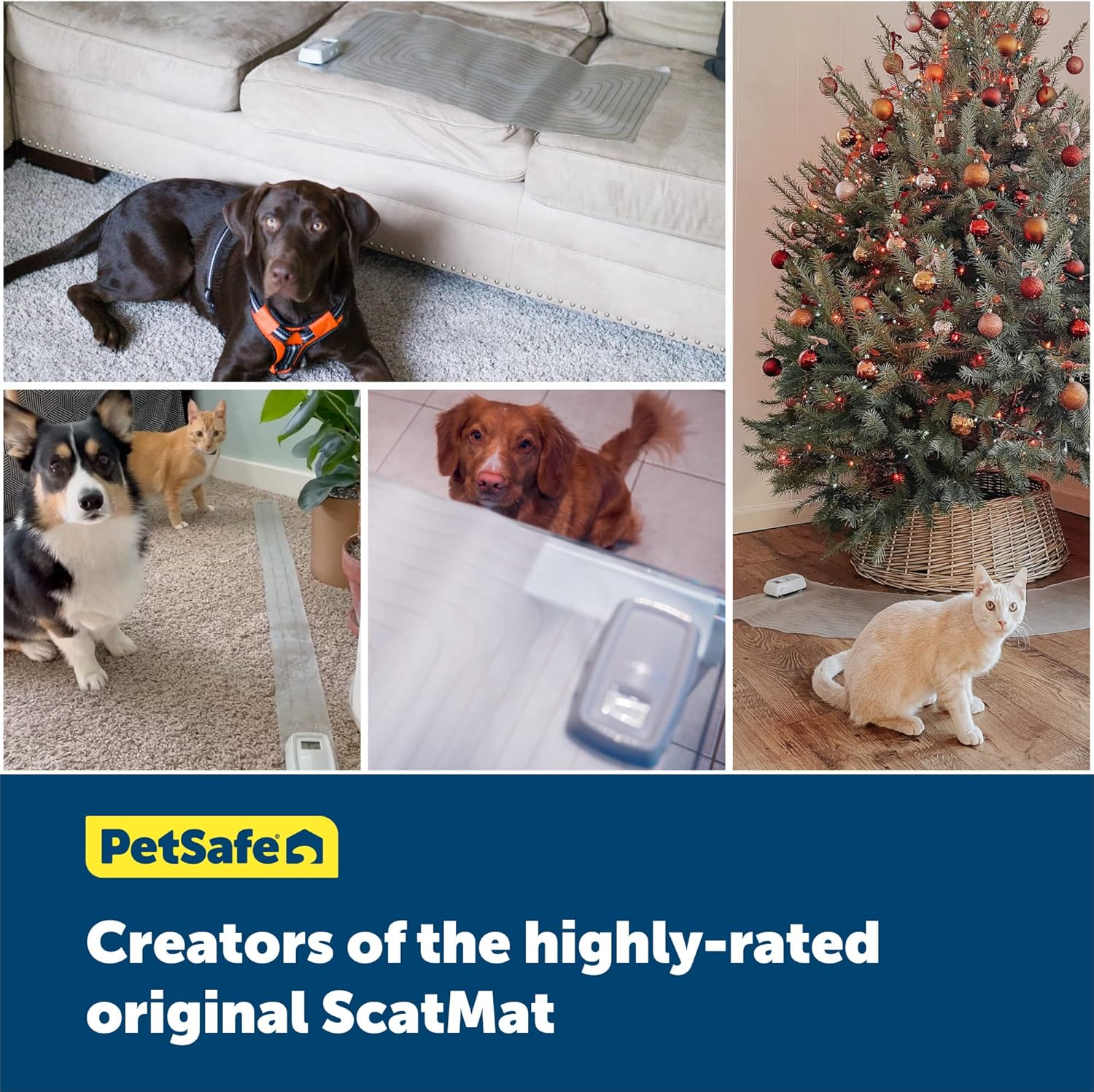 Training Mat: Place ScatMat on countertops, the couch, in doorways or near trash cans to teach dogs and cats which areas are off-limits; When your pet steps on the mat, they will feel a safe yet startling correction to deter them from restricted areas Customizable Modes: Multiple correction levels allow you to set the training mat to tone only correction, low, medium or high static correction with or without tone; Includes safety timeout feature and tone-only option for sensitive pets Easy to Use: Battery-operated controller attaches to training mat and features an LCD display that shows battery level, correction level and a counter so you can see how many times your pet steps on the mat; 9-volt battery required (not included) Protect Your Pet and Your Home: Explore our array of pet-proofing and remote containment systems including indoor, outdoor, in-ground and GPS wireless fences in battery powered and rechargeable, plus training mats and motion activated spray deterrents Unleash a Lifetime of Joy: Since 1998 we’ve been on a mission to create places and spaces where pets are happy, healthy and safe; Our US-based customer care experts are available to answer your questions by phone, email or chat U.S.-BASED CUSTOMER CARE: Our pet product experts are happy to help you and your pet; we are available by phone, email or chat if you have any questions › See more product details