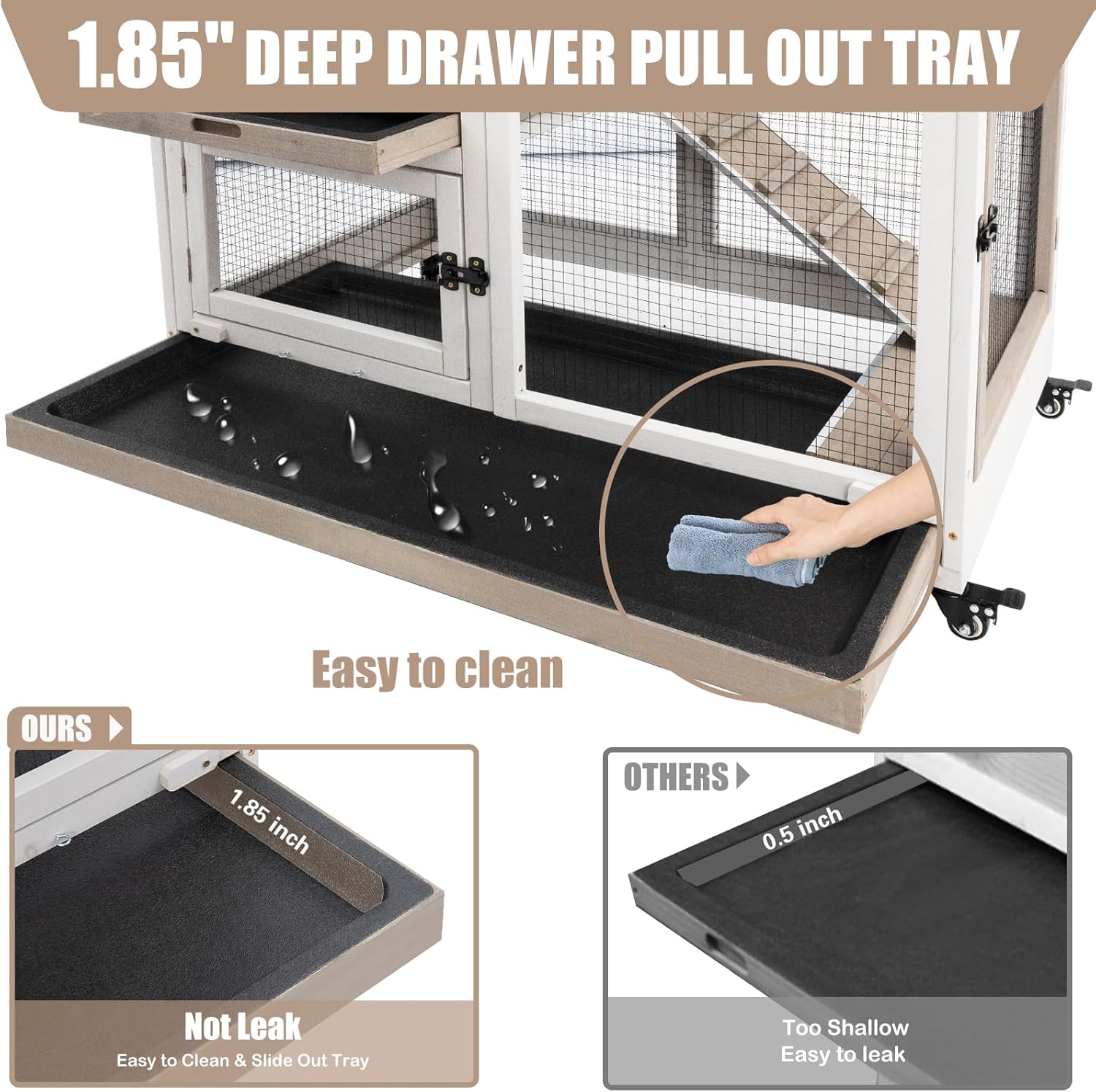 About this item Rugged Build For Outdoor & Indoor Use: This bunny hutch is built from solid fir wood with UV-resistant panels and a waterproof asphalt roof, offering a sturdy, long-lasting rabbit hutch or guinea pig cage for both indoor and outdoor environments. Easy to Move & Clean With Lockable Wheels: The rabbit cage includes four lockable metal wheels for smooth indoor/outdoor mobility. A deep plastic tray at the base prevents leaks and makes this bunny cage easy to clean and maintain. Flexible & Versatile Setup: Designed for flexible use, this 2-level rabbit hutch easily converts to a wide layout by removing the side panel—ideal as a bunny house for 1–3 rabbits or other small pets needing separate or expanded space. Thoughtful & Accessible Design: Features like an openable roof, clear acrylic windows, built-in feeder, multiple doors, and secure latches ensure better airflow and visibility, making this guinea pig cage breathable, easy to use, and suitable for all seasons. Spacious Size & Easy Assembly: Measuring 40.2"L x 23.2"W x 36.6"H with 7.11 ft² of space, this bunny hutch comes with pre-drilled holes and a clearly labeled manual for hassle-free assembly. Responsive customer support is always available. › See more product details