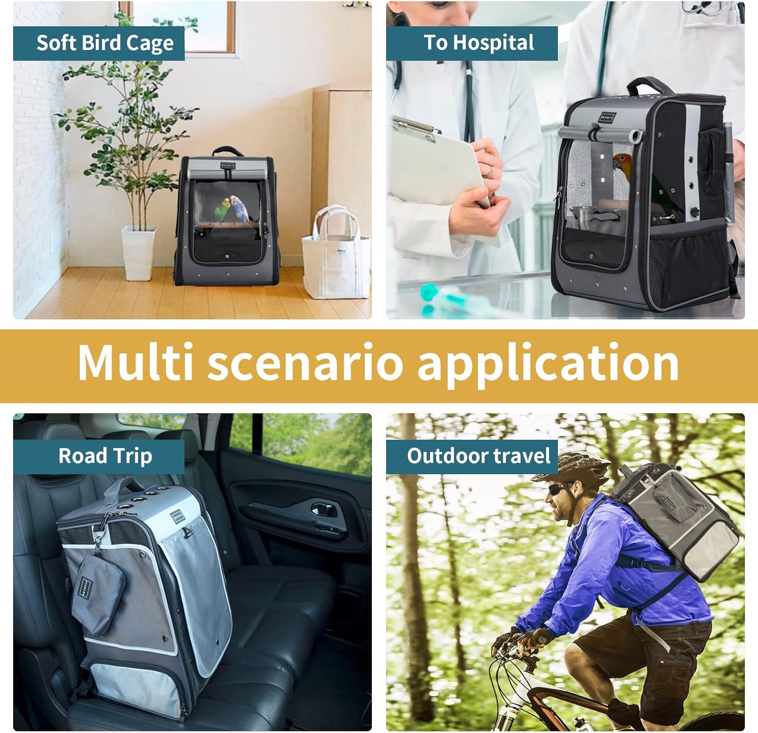 About this item If you want to take your bird out for a walking,biking or hiking, a bird carrier with great ventilation and shade cover is a good choice,that can keep them pack out of direct sunlight and qiuck dissipate heat. So as you can see, there are 3 air holes, two side mesh and front mesh. All mesh design with lockable shade cover. Are you still frustrated that your bird's tail is too long and you don't have a suitable bird carrier? This will be a pity. The size of our bird carrier backpack is 14"L*12"W*20"H, what’s more our bird carrier backpack provides adjustable height standing perch, which can be adjusted according to the size of your bird. Durable thicken anti-grab mesh material and anti-pecking band on edge of front door, you never worry about your bird escaping from the bird backpack. And the removable tray and bottom metal net inside the cage which are convenient for cleaning. There are two side-bowls in inside of bird carrier, can be fixed with lockable wire rope.You can fix the bird's water bottle through the webbing band, another one is used for feeding food. Side storage pockets will help you carry more things, such as garbage bags, birdseed, etc. Our bird carrier backpack fit for cockatiel, african grey, parrot and other birds with long tail, so before you purchasing it, please measure size of birds carefully. There are belt for suitcase use, also used for fastening to the car seat with safety belt. › See more product details