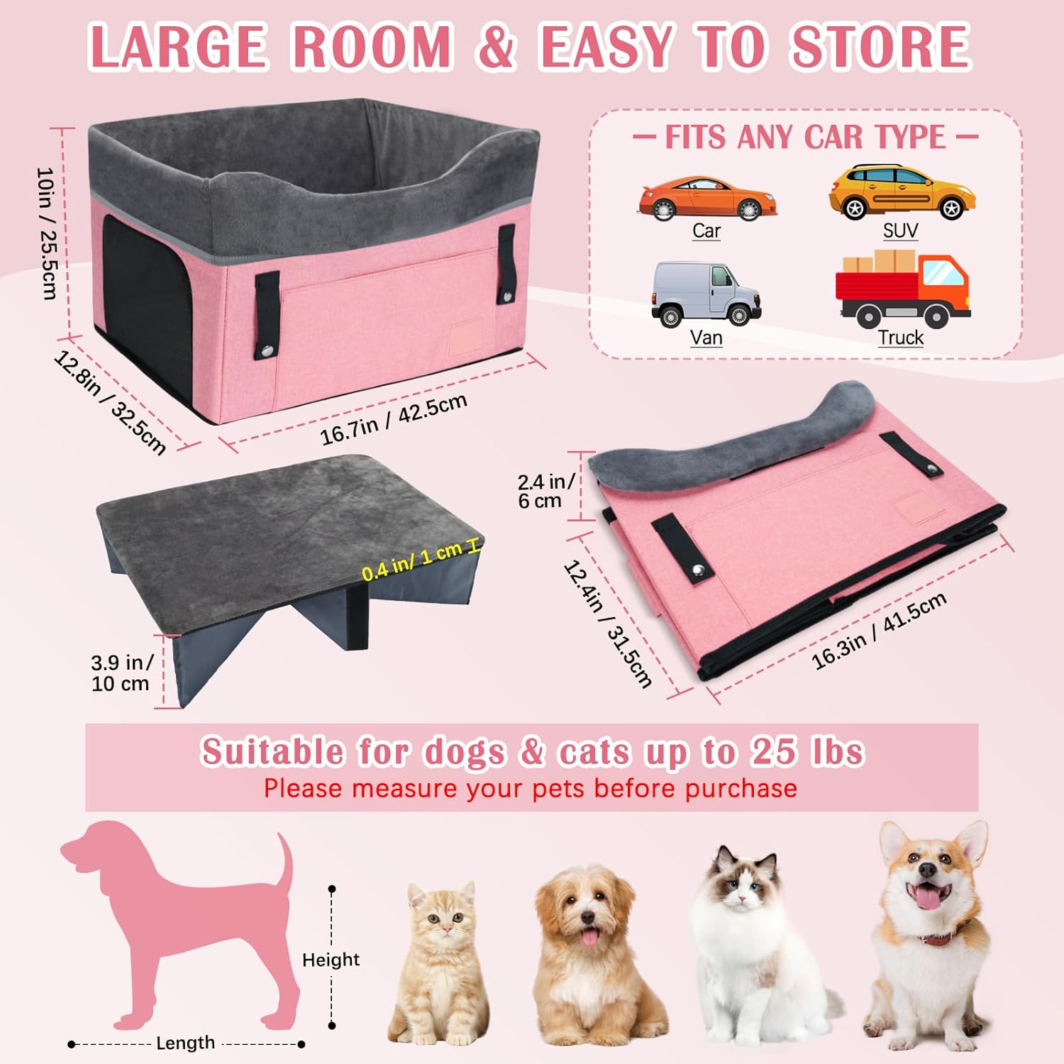 About this item Comfortable and Safe: PetsHome pet car seat is made of premium fabric, featuring a removable plush seat cover, side pillow and cushion, built-in hard board and sponge, sturdy structure and soft plush ensures pet’s safety and comfort. The front pocket can store pet's daily essentials All Season and Two Heights: Breathable mesh without seat cover is more suitable for hot weather, with plush seat cover is better for cold weather, keeping pets warm in winter and cool in summer. The elevated design can elevate your pet 3.9 inches high above the vehicle seat, allowing pets to sit higher and look out the window to reduce anxiety Easy to Install & Triple Fixation: Our dog booster seat is easy to install: hang the adjustable strap and fasten the back strap, then fixed seat belt. Triple fixation make sure the dog car seat stay securely in place during drives, plus an adjustable clip-on safety leash, preventing pet from jumping out and keeping your pet safe while driving Detachable and Washable: You can remove the seat cover, cushion cover and side pillow and wash them by machine or hand. You can also fold it when not in use and do not occupy much space, easy to store Size: 16.7 x 12.8 x 10 inches(42.5 x 32.5 x 25.5 cm). Suitable for small dogs, cats, pets up to 25lbs. This pet car seat making it convenient to take your pet with you on trips. Suitable for any car types, front seat, back seat, car trunk, home and outdoor use › See more product details