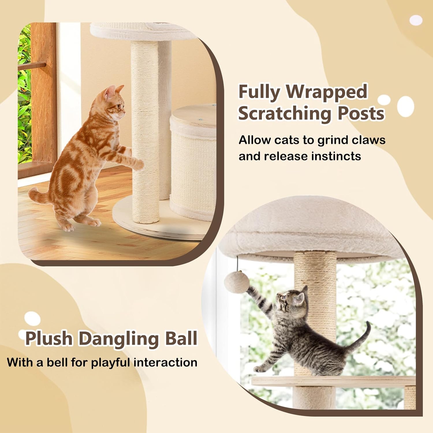 What We'd Like to Share:Upgrade Your Cat's Playtime and Relaxation!Our luxury wood cat tree measures 23" x 60"/58 x 152 cm (Dia. x H) and comes with 6 layers for cats to climb up and down. It includes 2 large condos and a cozy padded top perch that offer the perfect spot for relaxation or keeping a watchful eye on the surroundings, while the inclusion of a cozy basket adds an extra layer of comfort. And there are sisal scratching posts and a plush dangling ball with a bell, which not only save your furniture from damage but also keep your cat entertained and active. With a cool bamboo mat inside the condo and soft padded plush fabric on the platforms, our cat house could treat your beloved cats to luxurious comfort. More than that, it is built with a solid plywood frame and thickened base, ensuring excellent stability and preventing any wobble as your cat climbs or lounges. To create a clean environment, the cushions and condo covers are detachable and easy to clean.Specifications:Color: BeigeMaterial: Plywood, Sisal, Plush, Sponge, Bamboo, Engineered Board, MDFProduct Dimensions: 23" x 60"/58 x 152 cm (Dia. x H) Condo Size: 15" x 12"/38 x 30 cm (Dia. x H) Perch Diameter: 15"/38 cmBasket Diameter: 14"/35 cmWeight Capacity of Each Layer: 33 lbs/15 kgNet Weight: 36 lbs/16.5 kgPackage Includes:1 x Cat Tree1 x User’s Manual