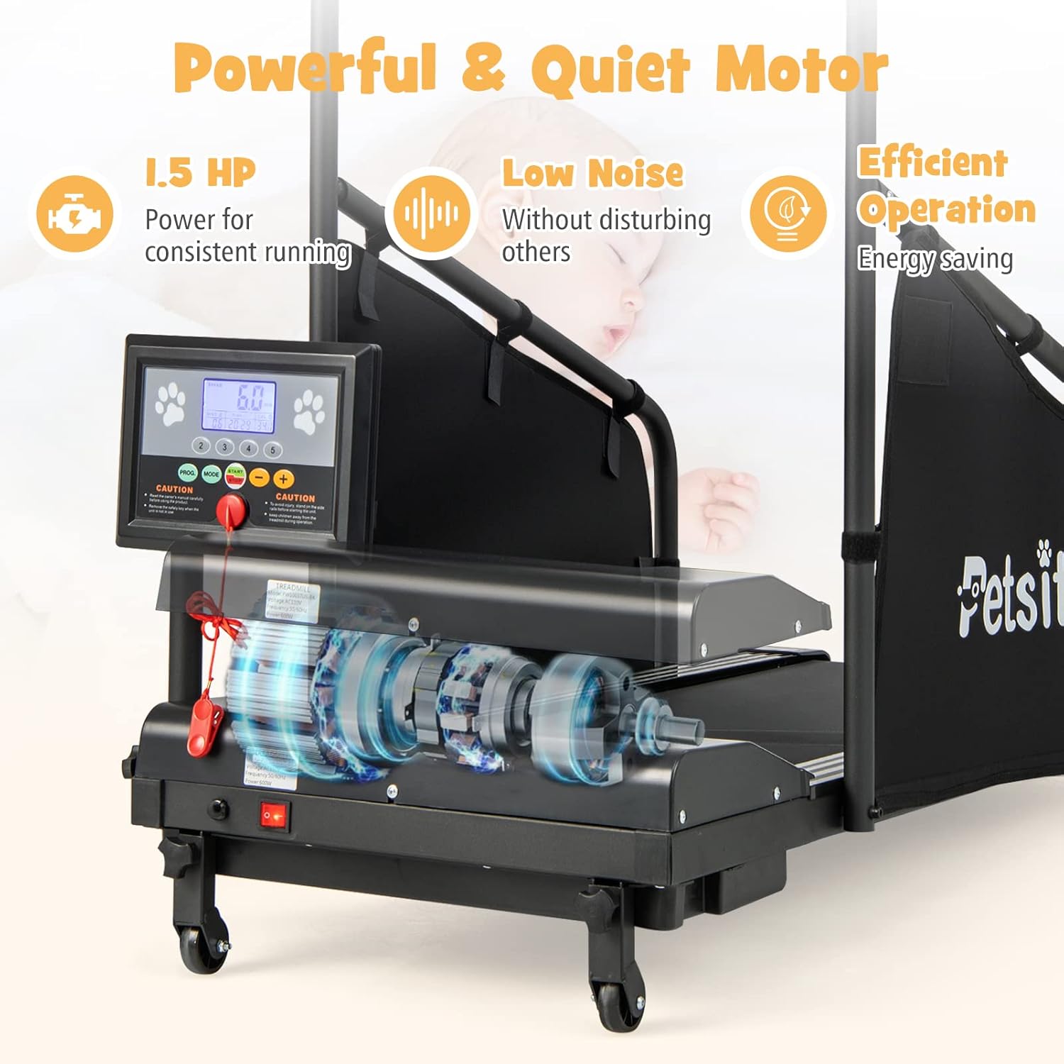 About this item Stay Healthy & Fit: This dog treadmill can be a perfect way for exercising without going out or helping train the dog, keeping them fit. Even if the weather is bad, or you're too busy to walk the dog, this running machine can satisfy the routine training of your dog. Customize Workout Programs: Equipped with a powerful 1.5 HP motor, the dog treadmill can reach fast running speeds from 0.5 to 7.5 mph. And it would operate at low noise. More than that, it has 12 preset programs and 3 countdown modes for you to choose from. The incline can also be adjusted in 3 levels to make the exercise more scientific and efficient. Large Running Belt: The dog running machine comes with a wide running belt that measures 39" x 14.5" (L x W), providing for your dog to run more comfortably and freely. More importantly, the belt is composed of 4 layers with excellent shock absorption and slip resistance, which can greatly protect your dog's joints and muscles. Safety Assurance: The pet running machine is designed with 2 side safety fences to block your pet's vision, helping them focus on running. And there is a crossbar in front of the treadmill, which can be used for tying the dog's leash. Moreover, it would automatically turn off after 30 minutes for safety. When not in use, you can easily move and store it with 2 rolling wheels. LCD Display & Remote Control: The electric dog treadmill comes with a multifunctional LCD display to showcase time, speed, distance, and calories in real time. Besides, it has 4 quick speed keys (2/3/4/5 MPH) for convenience. Furthermore, it also features a remote control for controlling the treadmill within the distance of 65.5 ft. Feel free to get in touch with us at any time, no matter the problem. › See more product details