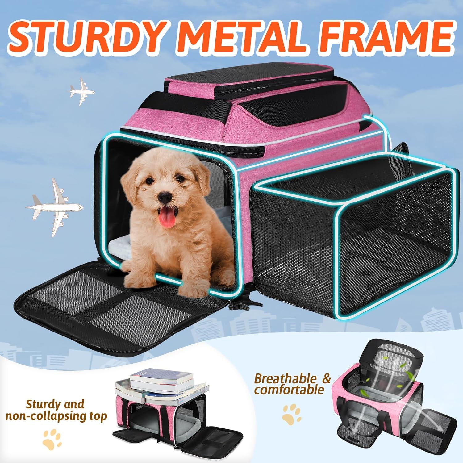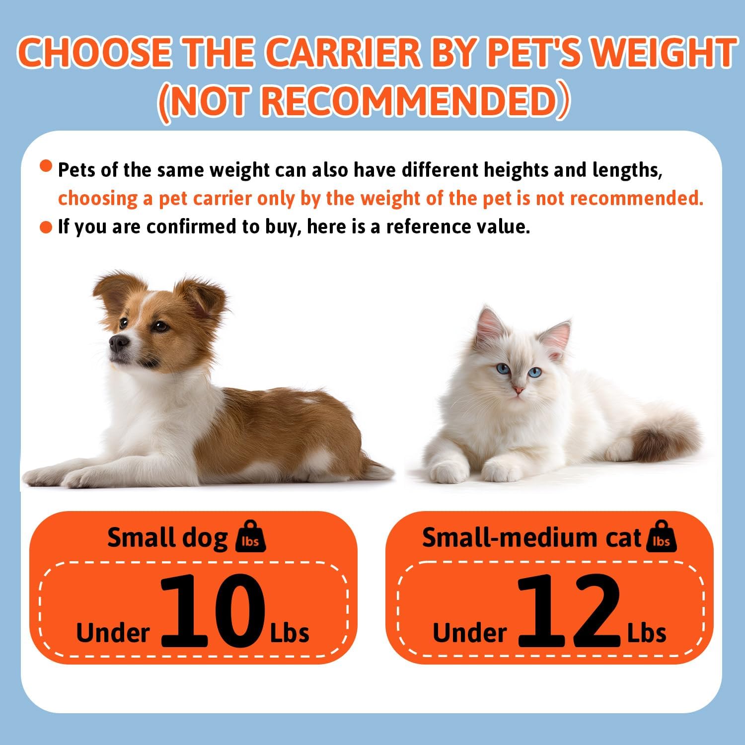 About this item 【CHECK SIZE BEFORE BUYING】In order to fit the under-seat dimensions of airlines, this carrier can only fit small dogs and cats. We recommend that the pet size you carry be within 14"L x 8"W x 10"H(this carrer's inner size), please choose the carrier reference your pet's length and height. Reference pet weight: dog weight under 10LBS and cat weight under 12LBS. 【AIRLINE APPROVED CARRIER 】Unfolded size:17"L×(11+5.5)"W×(9.5+3.5)"H, Petskd pet carrier is TSA approved and can be placed under the seat in the cabin, it is mainly designed for ①Alaska Airlines:17x11x9.5", but also in compliance with ②Southwest Airlines:18.5x13.5x9.5" ③Delta Airlines:18x11x11" ④United Airlines:18x11x11" ⑤American airlines:18x11x11" ⑥Air Canada:21.5x15.5x10.5". We recommend you buy this carrier when you fly with the above-mentioned airlines. When you take the carrier on airplane, please fold the top and side expansion areas for the size of airline seat. 【BETTER VENTILATION】Petskd pet carrier has mesh ventilation on 5 sides for good ventilation and good viewing—perfect for your pet to look out and for you to check on your pet; the dog carrier has 3 openings, and each opening has two non-slip zippers to ensure pet safety. 【SAFE DESIGN】Soft dog travel carrier bag upgraded structural design of stainless steel and Fiber rod that makes our dog carrier bags for small dogs will not be out of shape or sagged and the top does not collapse, pet dog carrier bag preferable stability. Built-in adjustable rope buckle, easy to lock the collar. Zipped snap lock to avoid pets to open or grab open the zipper. 【DURABLE MATERIAL】Made of waterproof, non-toxic, scratch-resistant polyester fabric material, waterproof and wear-resistant; after comparing similar products, we upgraded the mesh material to effectively prevent pets from tearing the mesh with their nails and prevent pets from falling out of the carrier. 【EXPANDABLE LARGE SPACE】By unfolding the 2 expansion areas, pets can gain an additional 80% of space to move around. The top expansion is great for your pet to sit or stand. The side expansion area allows your cat to lie down and stretch out on the go. The expandable cat carrier bag also creates a safe environment to avoid stress reactions. 【QUALITY GUARANTEE】Petskd offers a 12 months after-sale service, quality problems within 12 months can be replaced on new models. So if you have any problems with your product, please contact us we will get back to you as soon as possible within 24 hours. › See more product details