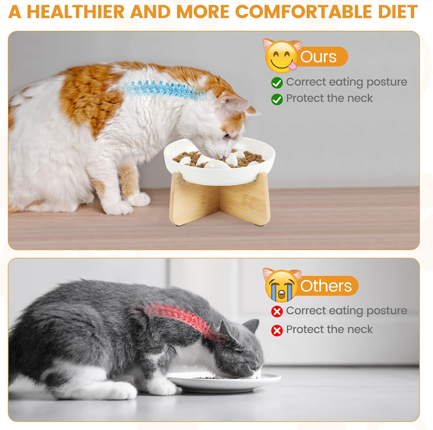 • Elevated Stand With a non-slip stand that is 3 inches in height, the food can be placed at a more comfortable height for your cat. The raised slow feeder cat bowls allows for a natural feeding posture, alleviating pressure on the cat's neck and back, promoting digestion, and reducing food reflux caused by fast eating