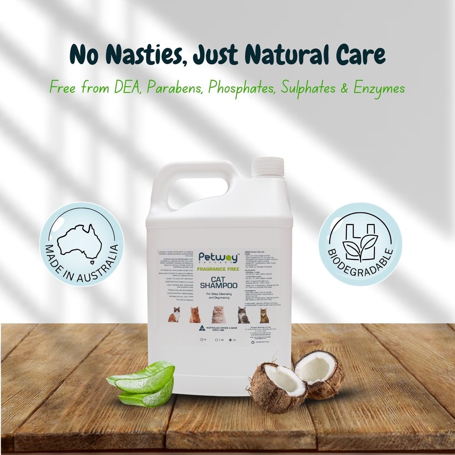 About this item Deep Cleansing Cat Shampoo: Our deep cleansing cat shampoo gently removes dirt, grime, dandruff, dander, and excess oils. Ideal for regular grooming, it’s a must-have in your cat grooming supplies for a soft, fresh-smelling and healthy-looking coat pH Balanced Pet Shampoo: Formulated with pure deionised water and natural ingredients, this pet shampoo is pH-balanced and soap-free. It doesn’t strip natural oils, making it perfect for sensitive skin and ideal for those seeking gentle cat products Fragrance-Free Cat Supplies: Our Cat Shampoo is fragrance-free and free from sulphates, parabens, phosphates, DEA and enzymes. This environmentally conscious formula offers a safe and soothing wash, making it a top pick among trusted cat supplies Premium Quality: Proudly made in Australia, this high-quality cat shampoo is crafted under strict standards from ingredient sourcing to packaging. Loved by Aussie pet parents, it's a reliable pick from local pet shampoo and cat grooming supply brands Gentle Cat Supplies: Whether it’s bath time or quick clean-ups, this concentrated pet shampoo for cats cleanses, deodorises, moisturises, and conditions in one go. It leaves coats silky and manageable, a perfect addition in cat grooming supplies › See more product details