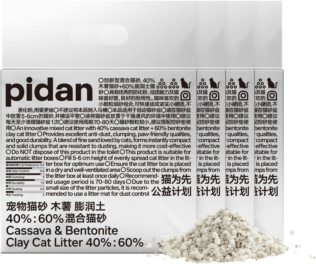 【Cat Preference-9.3】TailoredtoHabits:The fine sand texture provides a pleasant feeling for cats and is ideal.【Clumping-9】FastClumping:The fast clumping after water absorption prevents adhesion to a litter box bottom and facilitates the cleaning.【Durability-7.5】Water Lock&Efficient :The highly absorbent cat litter combination forms small clumps with maximum absorption, contributing to less consumption.【Dusting-0.5】Little Dusting:With high particle hardness, dust is controlled, as the tightly compacted clumping would not easily break into powder.Cat Litter Dimensional Scoring :According to the performance test, feline behavioral science research and feedback from real users over an extended period, the cat litter products are placed in the laboratory environment and rated from six dimensions, including cat preference, odor absorption, clumping, durability, dusting, and tracking. Cat preference, odor absorption, clumping, and durability are scored on a positive scale of 10, where higher scores indicate better performance. Dusting and tracking are assessed on a negative scale of 10, where lower scores indicate better performance.1. Pioneer of Mixed Cat Litter: The entire series of cat litter has accumulated sales of over 20 million bags throughout the year, exported to 15 countries (regions) including the United States, Australia, France, and Japan 2. Independent Industrial Park: The total ground area reaches 60,865 square meters, including the first phase of approximate 20,104 square meters and the planned second phase of about 40,761 square meters. The Industrial Park integrates warehousing and logistics functions, while production lines for cat food, cat litter, and supplies, as well as a research and development laboratory, are currently under construction. 3. Cat Litter Tested Every Day: A cat litter product is sampled from the production line everyday, and strictly tested for formaldehyde, aflatoxin B1 and total bacterial count.You can download the testing reports from the official pidan website 4.Ammonia and Hydrogen Sulfide Removal Tests: The removal rates can reach up to 90% 5. Public Welfare Program: For every pidan product sold, 0.15 CNY will be credited to the pidan Care charity account for the rescue of stray cats.
