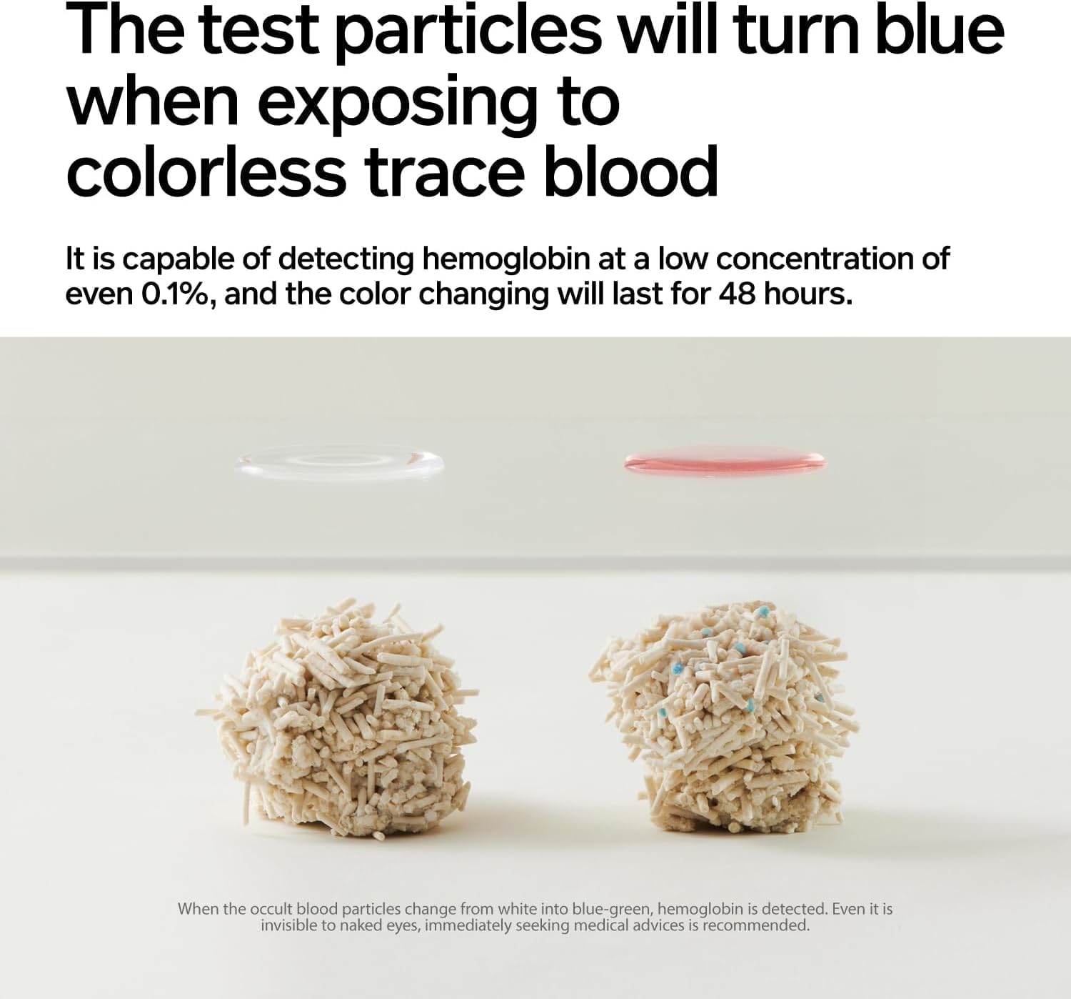 About this item 【Home Test】Trace blood is invisible to naked eyes.The test particles will turn blue when exposing to colorless trace blood.It is capable of detecting hemoglobin at a low concentration of even 0.1%, and the color changing will last for 48 hours. 【Selected Quality Pea Dregs】Sponge-Like Water Absorption Performance.Faster Clumping and Lower Possibility of Touching a Cat Litter Box Bottom.Sufficient Water Absorption and Less Consumption. 【Less Scattering, Improved Wrapping】70% 2 mm (Diameter) Tofu Cat Litter+30% 1.5 mm (Diameter) Tofu Cat Litter。Perfect Combination, Less Scattering, Improved Wrapping. 【Flushing into a toilet is OK】Due to the solubility in water, the garbage processing is more convenient.(Do NOT flush too much into a toilet in a time.) 【Attention】 1.Direct exposure to hard light or friction with metal would invalid the detection function of the occult blood test particles. Please avoid such situations.2.Mineral substance contained in bentonite would affect the detection performance. Do NOT mix the product with other cat litter. 3.The vacuum design is only to facilitate its transportation and storage, and air leakage does NOT compromise the use. If you DO mind, please contact us. › See more product details