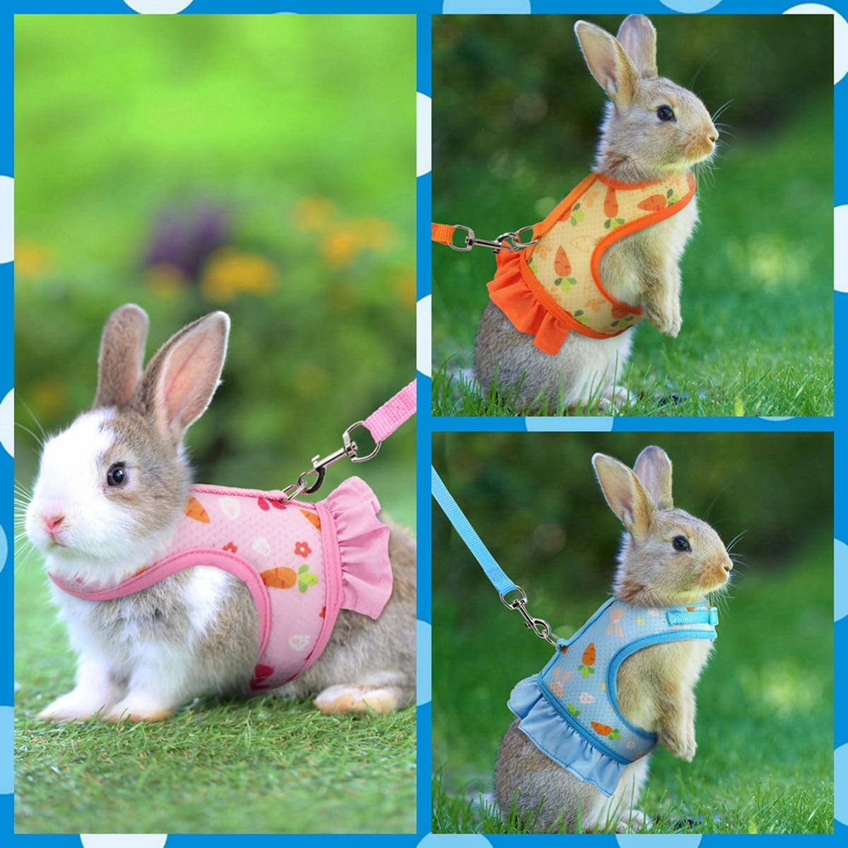 Bunny Harness And Leash, Escape Proof Rabbit Harness And Leash Set, Cute Bunnies Vest Clothes Stuff Accessories SizeS for neck girth:5.5"-7",chest girth: 7"-9.4", back length: 4.7" ; M for neck girth:7"-8.6",chest girth: 9.4"-11.8", back length: 5.3" ; L for neck girth:9.4"-11",chest girth: 13.3"-14.5", back length: 6.1" ; (Please measure the pet's neck & chest circumference and back length before purchasing to choose the appropriate size to buy) Bunny Harness And Leash--The rabbit harness is made of soft mesh, which is light and breathable, and can be worn in all seasons. The rabbit leash is made of nylon, which is wear-resistant and can be used for a long time.Cute and Fashionable--A pet harness specially designed for rabbits, cute carrot are printed on the fabric, making your rabbit look cuter and become the center of attention. In addition, allows you to quickly find the rabbit in the grass, avoiding the loss of pets when they are free.Comfort--The neck and chest of the rabbit harness are designed with hook and loop for easier wearing and adjustment. It is worth mentioning that the harness of the neck with adjustable strap and safety buckles to prevent the rabbit from breaking away the harness and escaping. Wearing Steps1. Open the hook and loop on the rabbit harness ; 2. Close the hook and loop on the neck and chest in turn; 3. Adjust the strap on the neck and close the safety buckle. (Note: If the rabbit is wearing a harness for the first time, you can let the rabbit get used to the harness indoors, make sure that the rabbit is used to the harness, and then fasten the leash and go out together.)