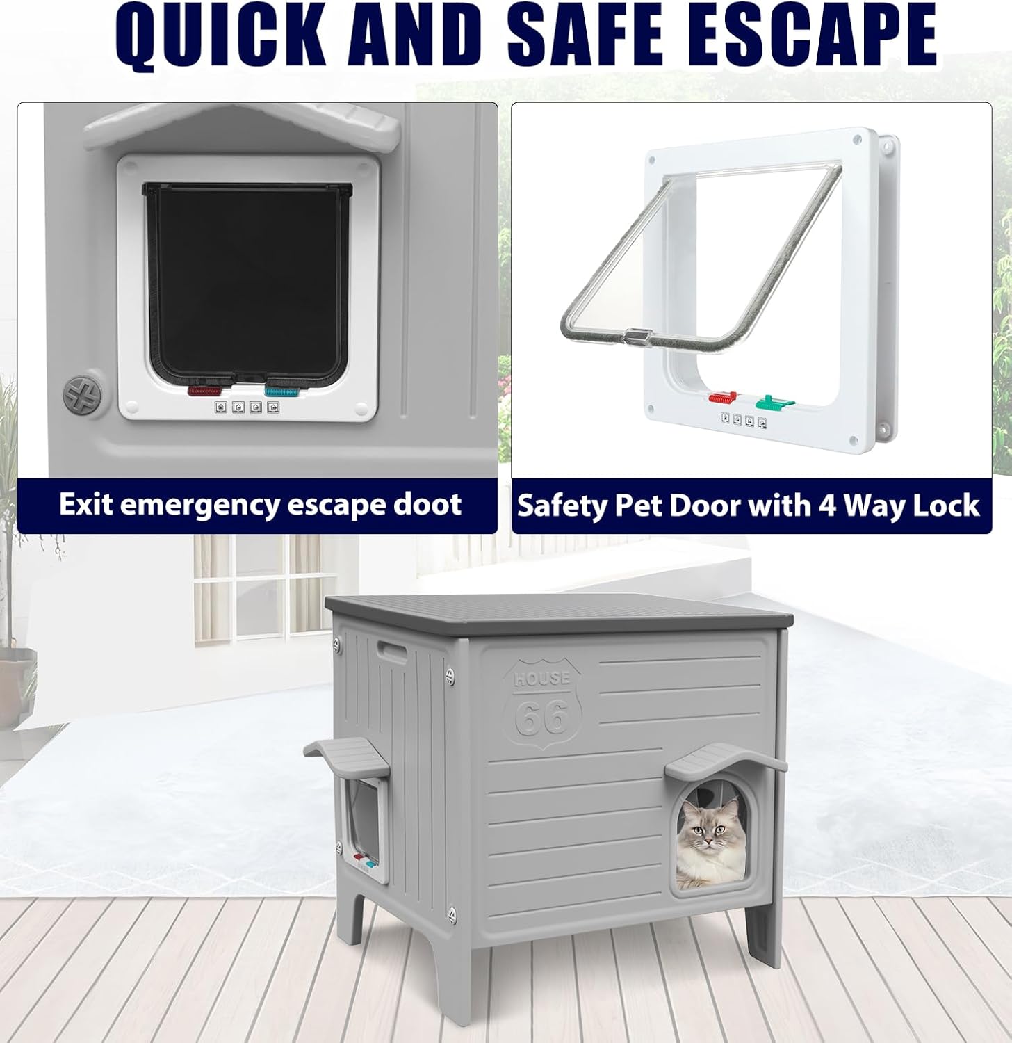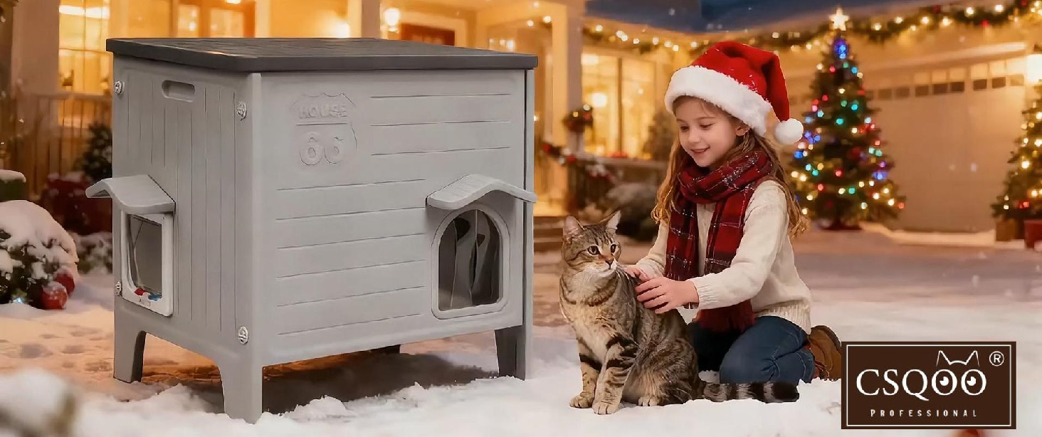 About this item Why Choose Us: Our plastic cat house is incredibly lightweight, allowing easy relocation to any spot. Unlike bulky wooden cat houses, it won't warp or deform. Simply rinse it clean with a hose, and its smooth surface prevents dirt buildup. Whether facing rain, snow, or humid weather, this durable, low-maintenance cat house is your ideal choice. Emergency Escape Door: Designed for outdoor cats with a four-way locking mechanism. Switch freely between one-way entry, one-way exit, two-way access, or full lockdown mode. Enables cats to quickly escape threats while reducing stress and preventing heat buildup. Dual-entry design enhances airflow, effectively minimizing conflicts in multi-cat households. Easy Cleaning & Assembly: Crafted from sturdy, washable HDPE (High-Density Polyethylene), the removable roof simplifies cleaning. Pre-drilled holes and assembly instructions eliminate the need for screws, glue, or sanding—a stark contrast to wooden cat houses. Fully tool-free assembly takes just five minutes, saving you time and effort. Large Cat House: Measuring 22.1 inches long × 16.1 inches wide × 20.9 inches high, this spacious cat house provides a comfortable resting space for 1 to 2 cats weighing up to 15 pounds. Upgraded Materials: This 100% waterproof cat house features a wide eave, PVC door curtain, and elevated structure. The roof drainage system effectively blocks rainwater and snow accumulation. Constructed from durable, UV-resistant materials, it offers long-lasting performance with minimal fading. Its moisture-proof properties ensure the interior remains dry at all times. The lightweight yet sturdy design makes it an ideal choice for safe and comfortable outdoor use. › See more product details