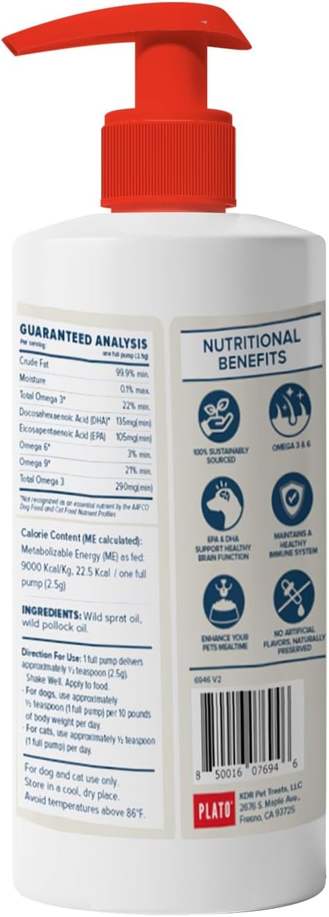 Baltic Sprat and Pollock fish oil topper improves the taste and aroma of your pets food while adding a boost of Omega 3 & 6 fatty acids, and EPA and DHA to supports brain, cardiovascular, and immune system health, and helping to enhance a healthy skin & coat.