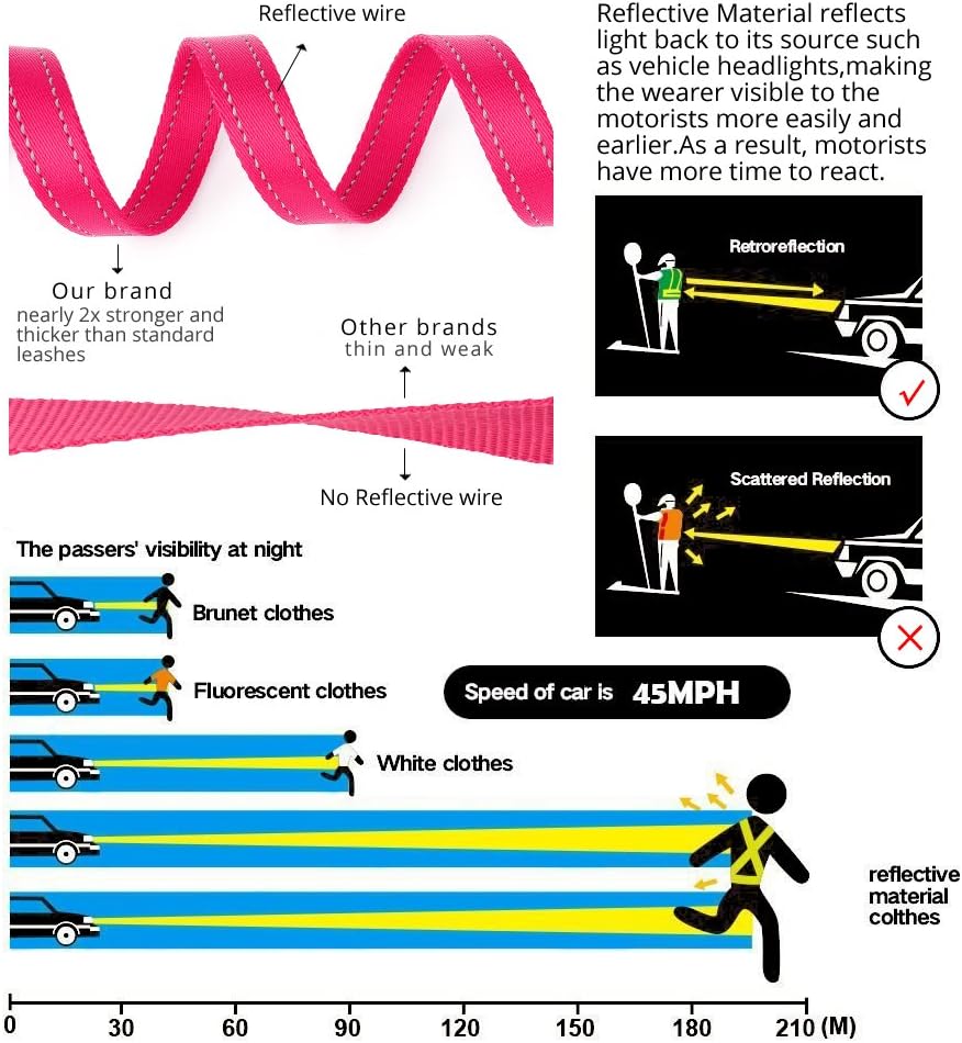 About this item Two handles for total control. Use the standard handle for casual walks, extended sniffing, and loose leash walking; Use the traffic handle for busy sidewalks, bike paths, and crowded areas that require that you have instant, up-close control of your dog. Maximum toughness and durability. 2.8mm thick and 1” wide with tightly webbed nylon for enhanced rugged construction, perfect for extra-large dogs. Padded handles for comfort. Extra thick premium neoprene padded handles for amazing comfort. You’ll just love the feel while on those walks through the park with your dog. Be safe and visible at night. Reflective thread is stitched on both sides. This stitching is very visible to car headlights and helps keep you visible when crossing crosswalks or walking along a street. Heavy duty leash. The training leash has a large clasp to last long. And the leash provides a D ring for you to attach keys or a poop bag. › See more product details