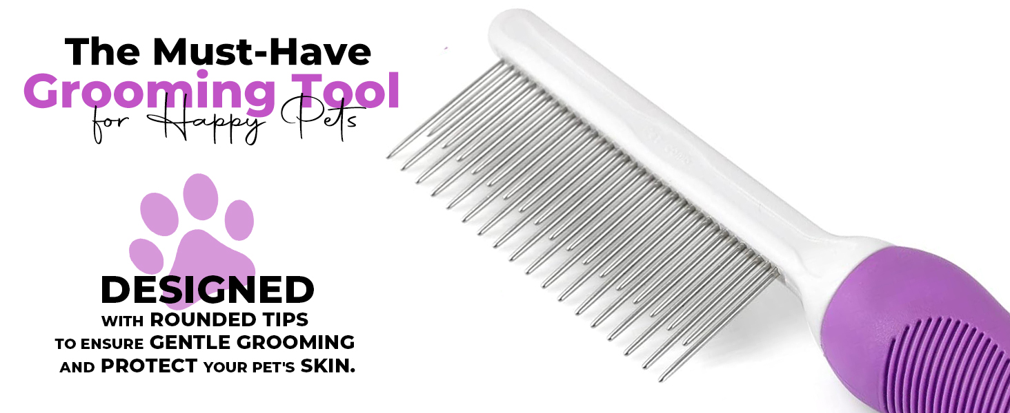 About this item 2-in-1 Detangler Comb: Simplify the grooming process by using our dual length pet combs for dematting, detangling & combing. It features both long & short metal teeth, so it cuts time in HALF! For Long, Short Hair: Unlike the average dog combs for grooming, this one can be used to care for long-haired or shorthaired breeds. Use it to comb the hair of pomeranians, poodles, persian kitties, etc. Anti-Slip Handle Grip: You don't have to worry about being too cautious when using our pet combs for cats, dogs & other small animals. It has been enhanced with a non-slip handle to help avoid accidents. Stainless Steel Teeth: The long & short teeth featured on this 2-in-1 pet comb with handle are made out of solid stainless steel to ensure they're strong enough to effectively remove knots and mats. #1 DIY Pet Groom Tool: Our pet grooming supplies come highly recommended by show dog trainers, long hair cat groomers & everyday pet owners. It's the perfect all-in-one detangler comb to have around! › See more product details