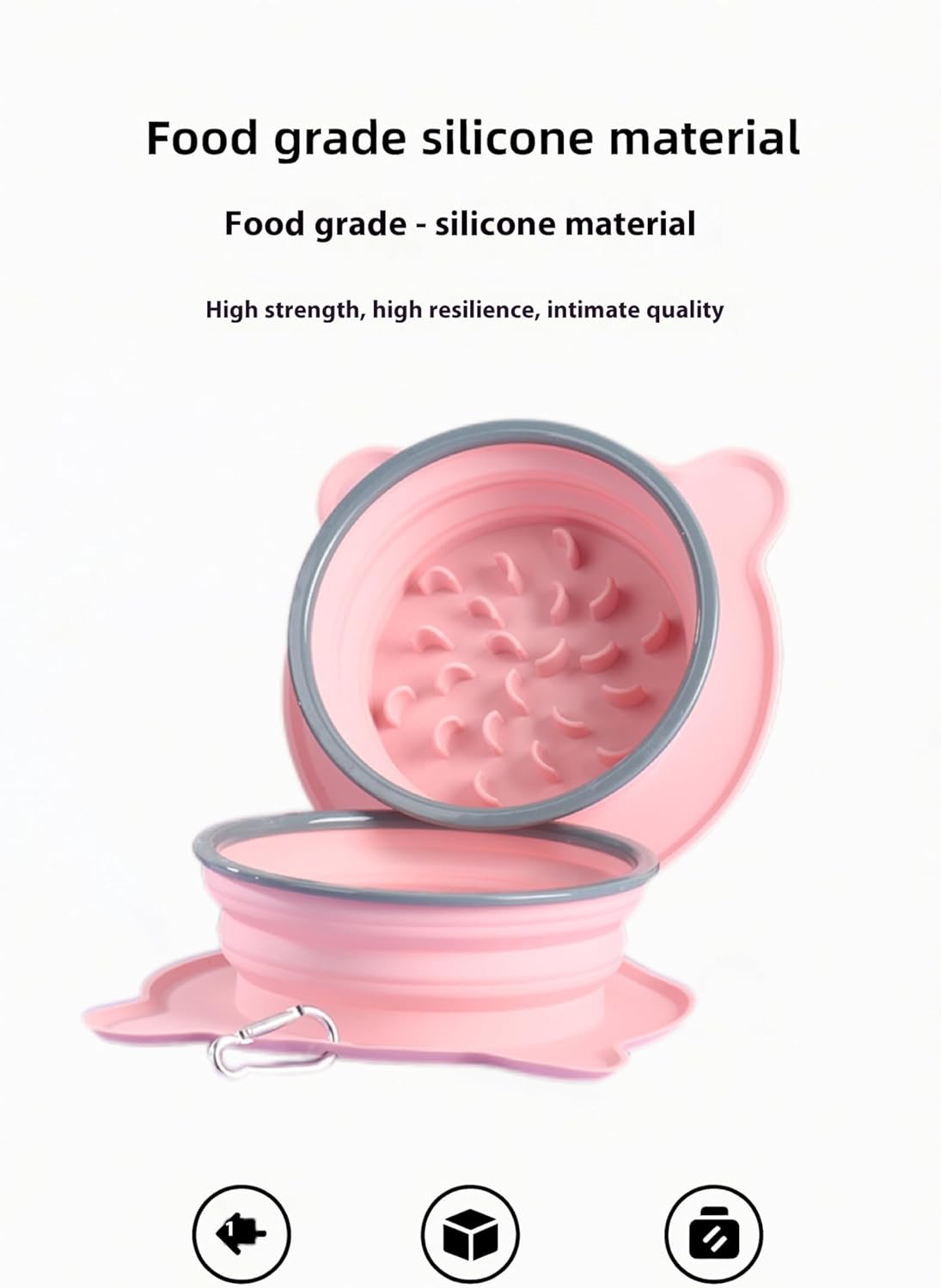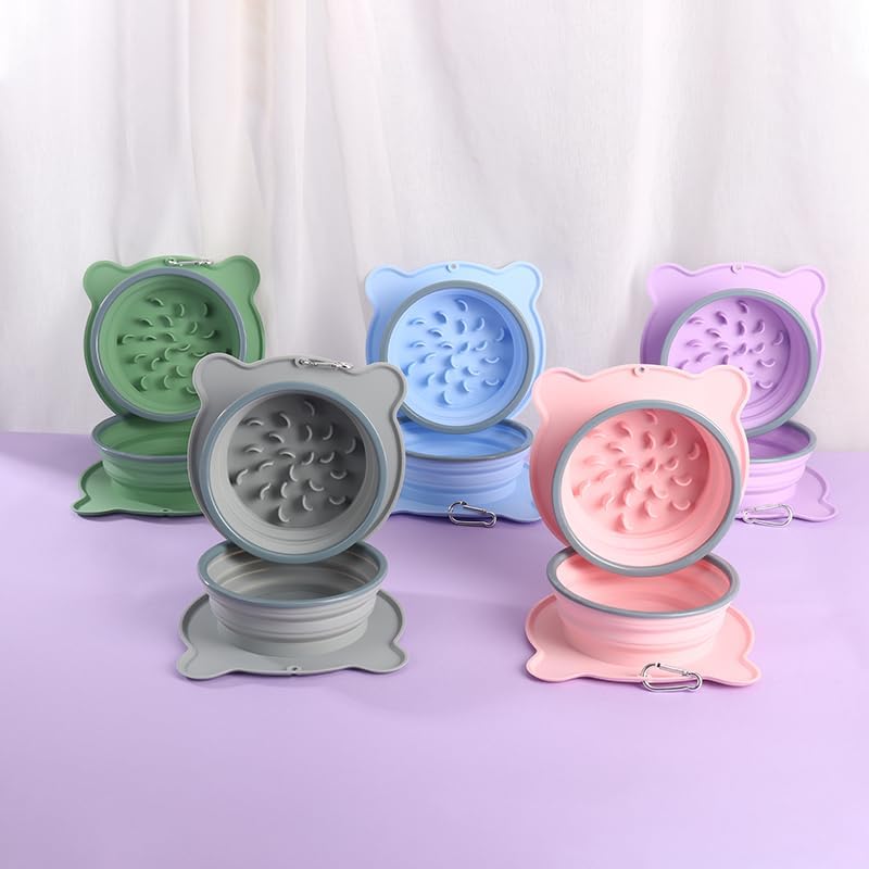 Crafted from premium food-grade silicone, this dual-bowl set features:Dual Independent Compartments: Slow-feeder section (1.5 cups / 12 fl oz capacity) with ridges to slow eating Spill-proof reservoir (27 fl oz capacity) Versatile Usage:Use bowls separately or snap-seal them together via precision interlock design - creating an airtight container for food storage or leftovers. Enhanced Stability:Pet-shaped non-slip base + hidden reinforced rim prevents tipping (even for energetic eaters!). Space-Smart Design:Collapses to 1.3” thickness with hanging holes for backpack/leash attachment.
