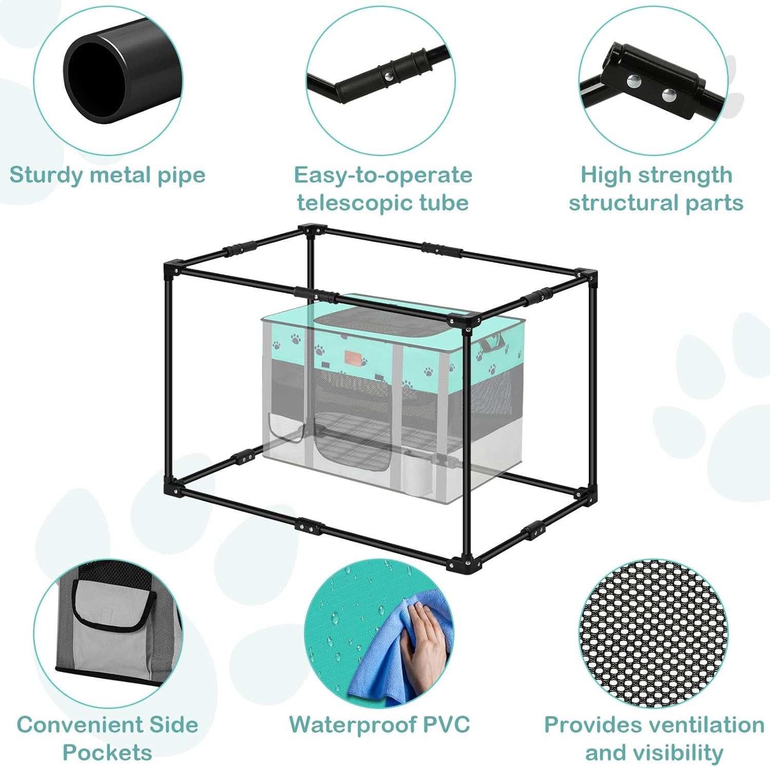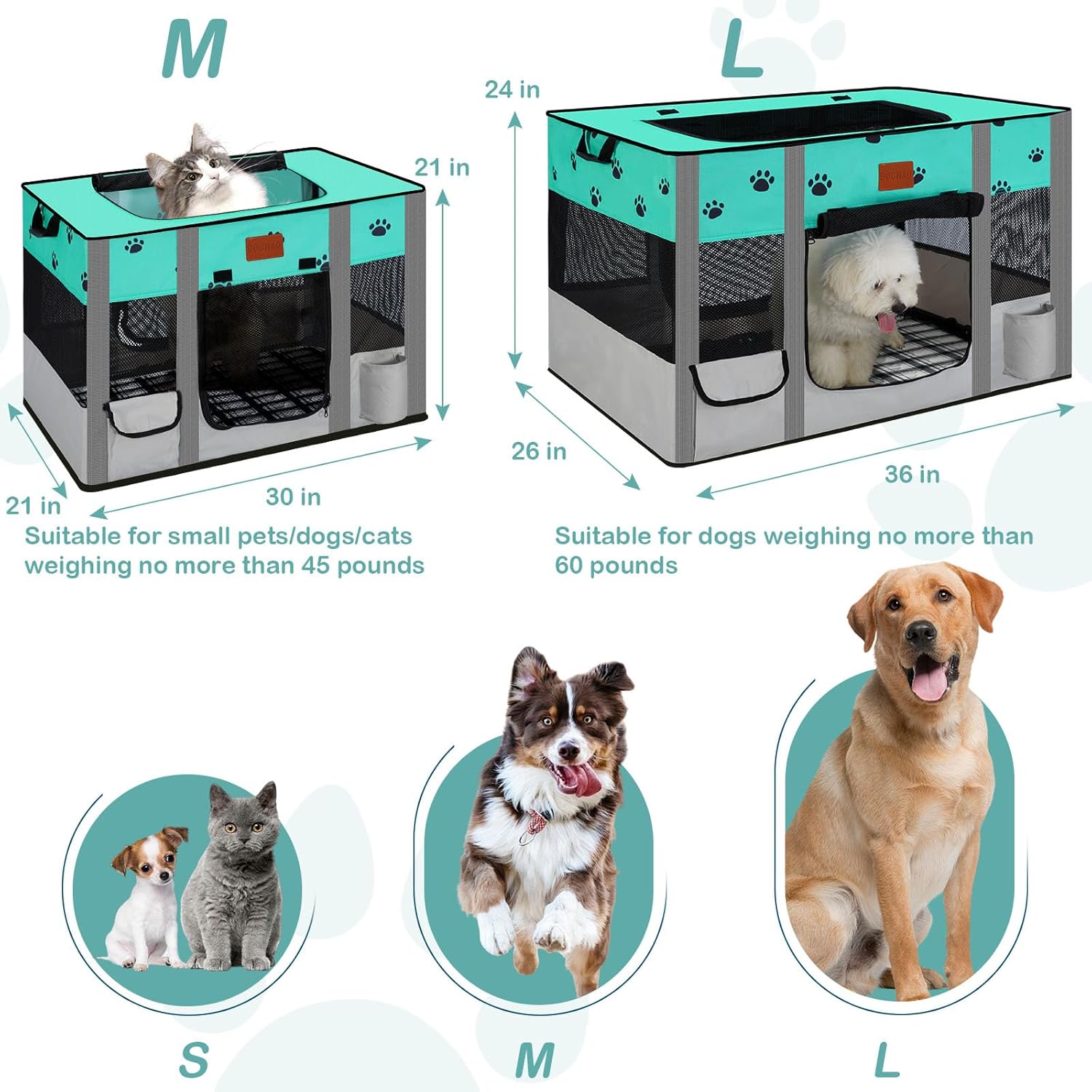 About this item 『EASY TO ASSEMBLE 』No tools required,say goodbye to the traditional style of splicing and disassembling with cumbersome rods.easy to open in seconds, just prop the metal rod open and ready to use, easy to put together and take apart. Folded into the storage bag for easy carrying and storage when not in use.Great gift for your fur babies. 『FIRM MATEL SUPPORT』The cat playpen adopts metal thicked rod,more sturdy than other steel wire with fiberglass rods or plastic rods, no longer have to worry about deformation or tipping over the problem! improves the comfort and safety for puppies, kittens and pets;it is more convenient to fold without complicated splicing/disassembly.This portable dog fence is a ideal choice for pet owners looking for a safe, convenient space for their furry friends! 『AVAILABLE IN 2 SIZE』Medium and Large size can be choosen, M:30in L x 21in W x 21in H for pets under 45 lbs;L: 36in L x 26in W x 24in H for pets under 60 lbs.Enough room for their crate, potty box, water bowl. NOTE: Pls measure your pet's size before purchase,make sure the right size for your pets to avoid feeling cramped,provide a safe space for play, rest, or training. 『STABILITY&PORTABLE』Our dog playpen is made of high-grade thickened metal rodes and 600D breathable mesh durable oxford cloth material, 3 easy-to-open zipper doors, 2 snack pockets and 2 water bottle pockets on the pet playpen, and a convenient carrying handle, lightweight,sturdy and easy to move; 360-degree lightweight mesh window view and ceiling provide excellent airflow and visibility for anxious pets and owners. 『VERSATILE USE』The portable dog crate is suitable for small and medium animals such as puppies, kittens, dogs, cats, rabbits, chickens, ferrets and even hamsters (not suitable for pets with destructive chewing behaviors.) ,used as dog crate, dog kennel, dog cage,dog play pen or pet crate.Both indoor and outdoor use, such as living room,bedroom,yard,car trunk and outdoor tent on camping or travel.Package included: 1x dog tent,1x washable pee pad,1x storage bag. › See more product details
