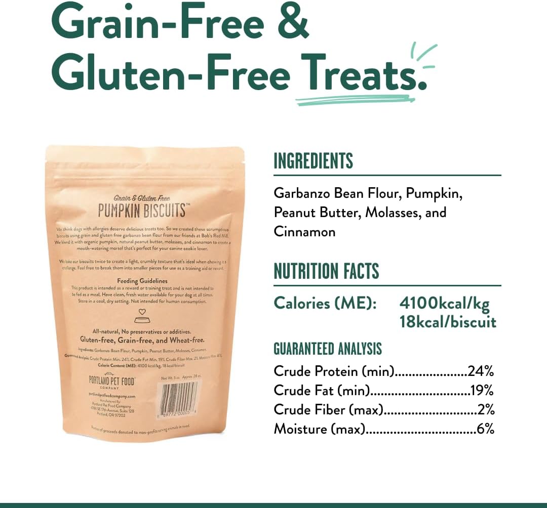 About this item PUMPKIN TREATS FOR DOGS: We believe in simple, real nutrition that your pet will adore. Our human grade dog treats are crafted with all natural, organic pumpkin. A mouth watering, healthy, vegan treat for even the pickiest of pups. EXCEPTIONAL FLAVOR: Each scrumptious snack is double baked with organic pumpkin puree, Bob’s Red Mill Garbanzo Bean Flour, peanut butter, molasses, and cinnamon. With 3 other flavors and mixed variety packs available, snack time just got a lot more 'pawsome'! LIMITED INGREDIENTS: Our tasty grain free dog treats are prepared with 7 ingredients or fewer with no preservatives, wheat, dairy, chicken, BHT, BHA, and no artificial colors. Ideal for dogs with allergies or sensitive stomachs, senior dogs, and picky eaters. GREAT FOR ALL SIZES: Our light and crunchy biscuit serves as an excellent training reward for all breeds, ages, and sizes, and can be easily snapped into smaller, bite-sized treats for small dogs. USA MADE: All of our gluten free dog treats are lovingly handcrafted using ingredients grown and sourced in the USA only. We use family recipes and package them in BPA-free bags. We’re here to support your pet's nutritional journey to eat well (and love it). › See more product details