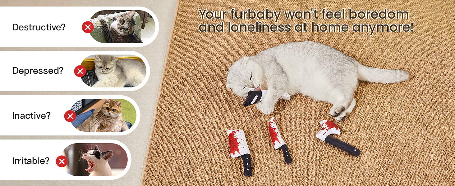 Unique and Funny Design: These cute plush cat toys are designed to look like knives, creating a hilarious contrast with your kitty's playful nature. Perfect for indoor play, they will bring endless amusement to both you and your cat. Multiple Attractions: Filled with organic catnip and silvervine, these toys make cats excited and playful. The crinkle paper inside adds an extra layer of fun, making engaging sounds that entice your kitty to play and exercise. High-Quality and Safe: Made from durable materials, these toys are designed to withstand biting and clawing. The high-quality catnip is sun-dried and packaged in a non-woven bag, ensuring a long-lasting, refreshing scent that keeps your cat coming back for more. Interactive and Engaging: These toys provide great enrichment for your cat's life, promoting exercise and interactive play. The crinkle sound and realistic design keep your kitty engaged and stimulated, preventing boredom and promoting healthy activity. Calming and Cuddly: Perfect for self-play and calming your cat, these plush toys are soft and safe for your kitty to cuddle and bite. The combination of catnip and silvervine provides a soothing effect, making them an essential addition to your cat's toy collection. › See more product details