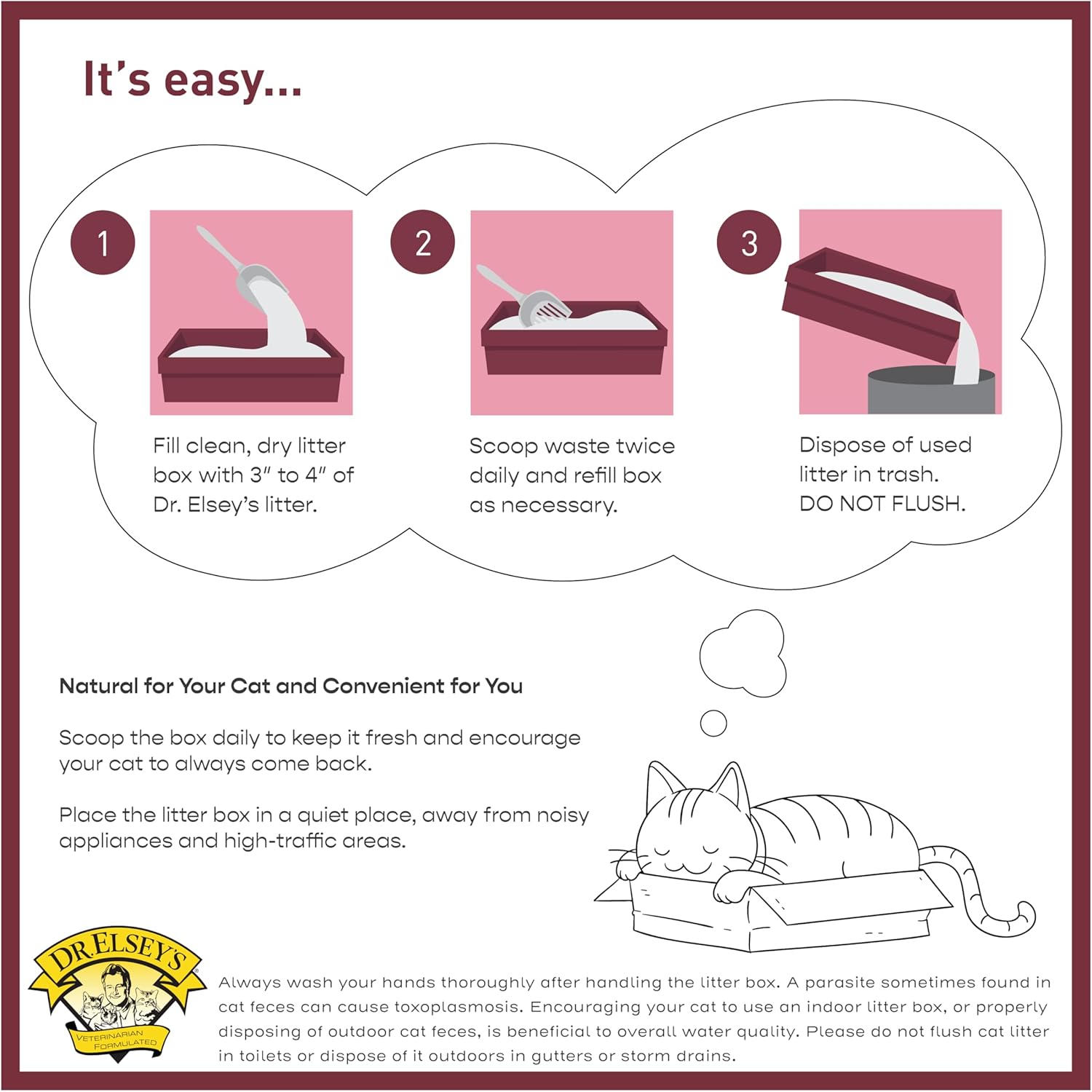 - Care Instructions: Always wash your hands thoroughly after handling used cat litter, as cat feces may contain Toxoplasma gondii—a parasite that can cause toxoplasmosis. Pregnant or nursing women, as well as children and anyone with a weakened immune system, should avoid handling used cat litter. Always handle litter in a ventilated area to avoid inhalation. Keep contents and packaging out of reach of children and pets. Seek medical help in case of accidental ingestion.