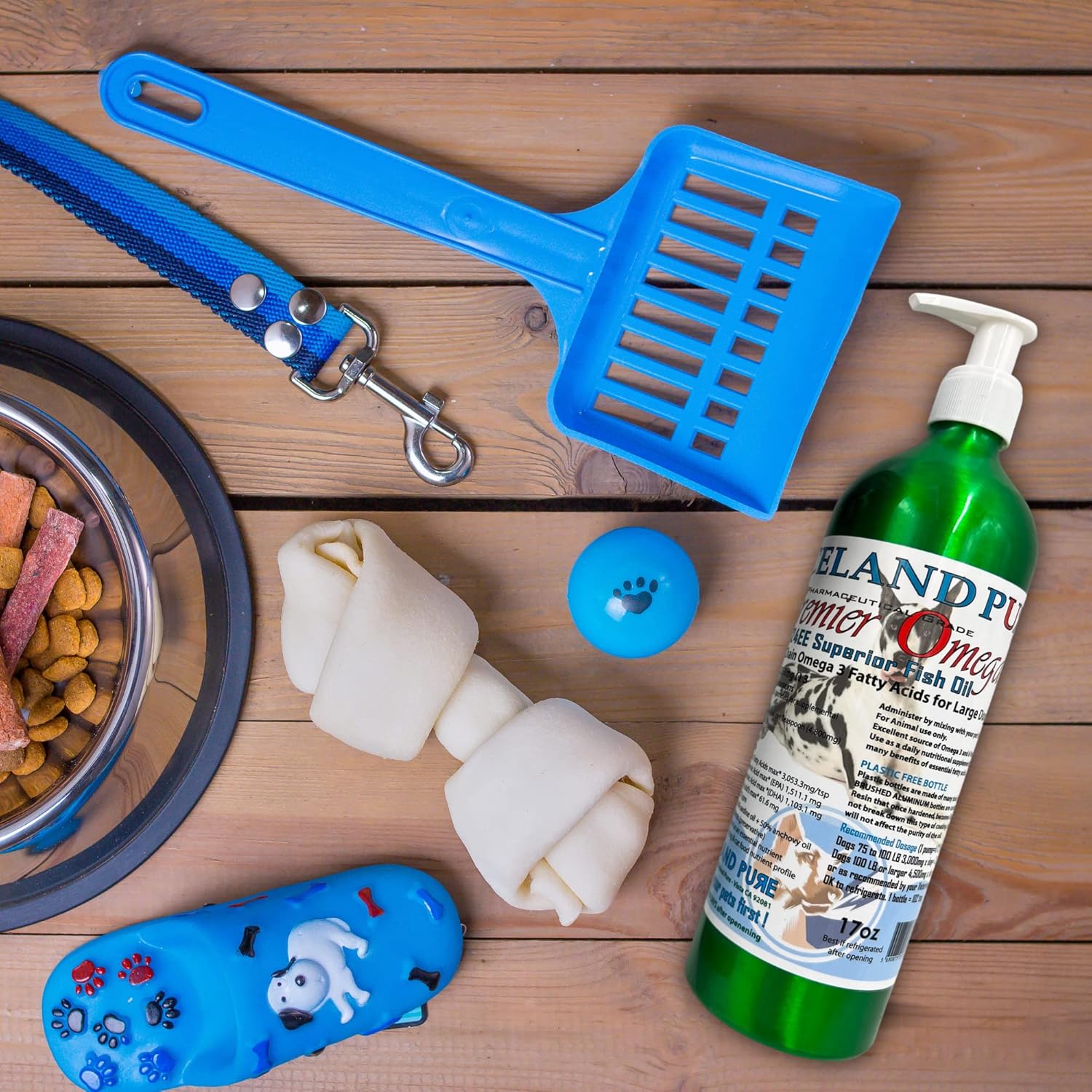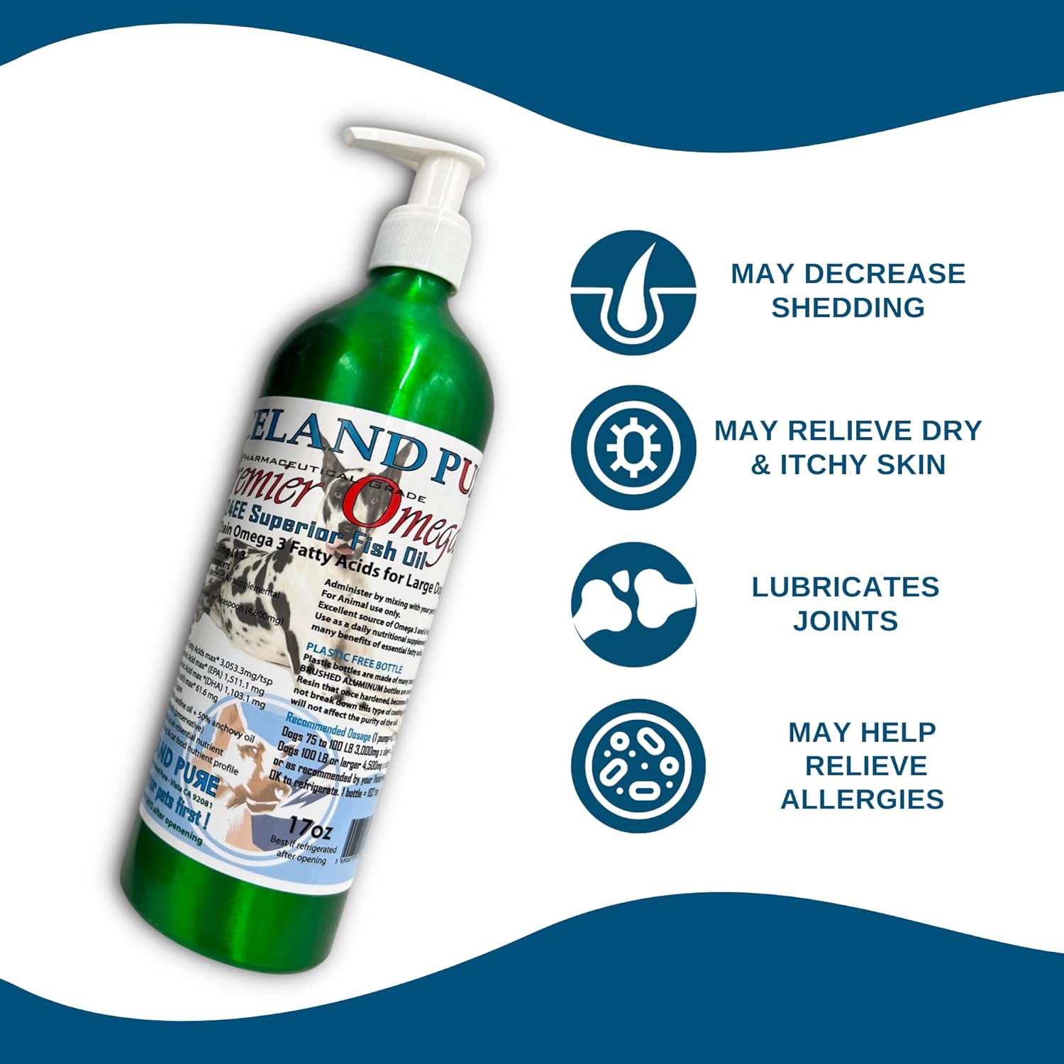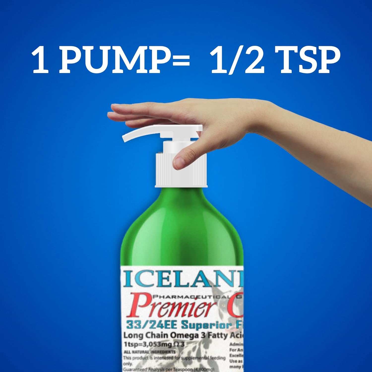 Iceland Pure Omega 3 fish oil supplement is formulated to give larger dog breeds the necessary nutrition needed to support and maintain optimal health, energy, and longevity with minimal possible amount of fish oil (1 teaspoon has over 3,000mg of Omega 3 Fatty Acids, 3 times the potency of most fish oil in the market including Iceland Pure fish oils). Dogs thrive on a healthy diet high of omega-3 fatty acids – EPA and DHA. EPA among many other ailments is an anti-inflammatory, reducing inflammation due to arthritis and allergies. DHA among many other ailments supports the central nervous system, brain and retina. Iceland Pure Premier Omega 3 Fish Oil can reduce the risk of kidney failure and heart disease and for Breeders Omega 3 fatty acids creates an upsurge of sperm creation. The healthy fats nourish your dog’s skin to relieve itching, paw licking and dryness while nurturing a soft, silky coat. Dogs are man's best friend and deserve this tag for all the right reasons. If you are looking for a product that will help you take good care of your dog's health, then Iceland Pure Premier Omega Fish is the answer. This premium quality fish oil for large dogs will ensure that your pet remains healthy. This omega fish oil contains crucial Omega-3 fatty acids (EPA and DHA) to ensure boosted immunity in your dog with regular use to help your dog combat common illnesses more effectively and remain in good health. This 17oz bottle of fish oil for dogs also offers other incredible benefits for your dog. It works effectively to reduce any itching and excessive scratching that ensure a soft and shiny coat on your dog after a period of continued use. Feeding Directions Large Breed Dogs 75Lb to 100Lb 3,000Mg x day 2 pump 100Lb or Larger 4,500Mg x day 3 pumps Or as recommended by your Veterinarian 1 pump = 1/2 teaspoon.
