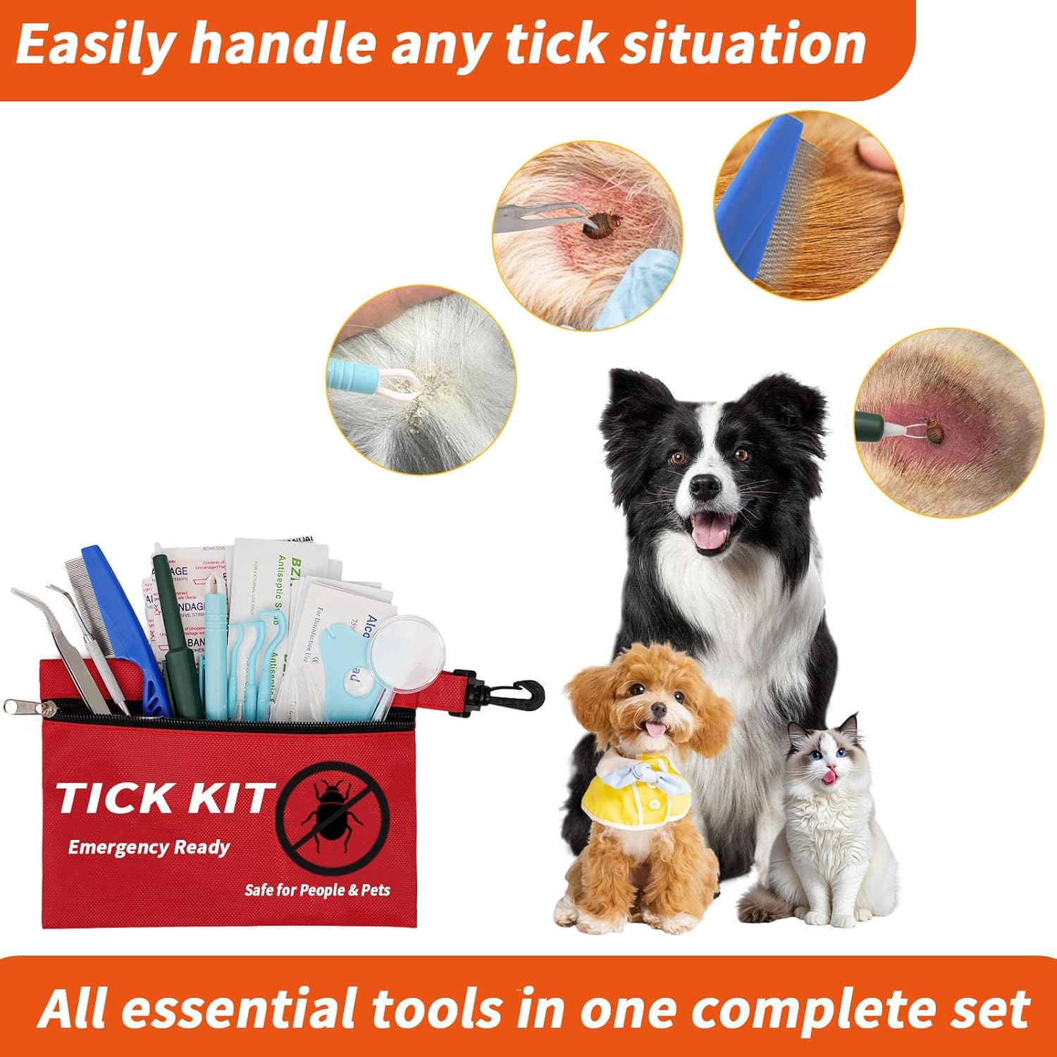 Premium 54-in-1 Tick Remover Kit – For Humans and Pets The ideal all-in-one solution for safe, hygienic, and efficient tick removal. Perfect for home use, travel, hiking, camping, or emergency situations – all tools are neatly stored in a water-resistant case.Why Choose This Kit?Complete Accessories: Includes 10 types of tools (tweezers, hooks, combs, grabbers, etc.) to easily remove ticks of any size or species.Premium Materials: Made of stainless steel and durable plastic for stability, hygiene, and long-lasting performance.Convenient Storage: The water-resistant pouch keeps everything clean, organized, and ready for use anytime.For Humans & Pets: Suitable for adults, children, dogs, cats, and other animals – perfect for pet owners.Compact & Lightweight: Easy to carry for outdoor use, in your car, or as part of your first aid kit.Package IncludesStainless steel tweezers (various tip shapes)Tick hooks in multiple sizesTick comb / flea & tick combTick grabber / nipper / tick pullerTick card & tick lasso / tick tornadoWater-resistant first aid storage pouchHow to Use – 4 Simple Steps1) Stay calm: Expose the affected area; do not squeeze the tick.2) Select the right tool: Choose according to the tick’s size and position.3) Grip near the skin: Pull the tick out slowly and straight (or lift gently using the hook).4) Clean the area: Disinfect the bite site and observe for any reactions.Safety TipsIf redness, swelling, or discomfort occurs, seek medical advice.Do not twist or crush ticks; avoid using oils or household remedies.Keep out of reach of children.Perfect ForHiking, camping, travel, gardening, and pet ownersCar, home, or office first aid kitsSEO Keywords (for Amazon indexing) tick removal tool for humans and dogs, tick remover kit, tick comb, tick tweezers, tick puller, tick nipper, tick tornado, flea remover, hiking essentials, dog hiking gear, flea and tick comb.