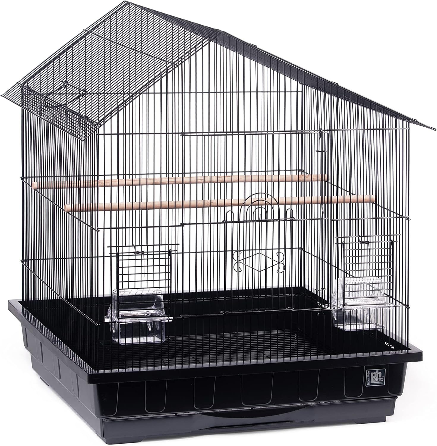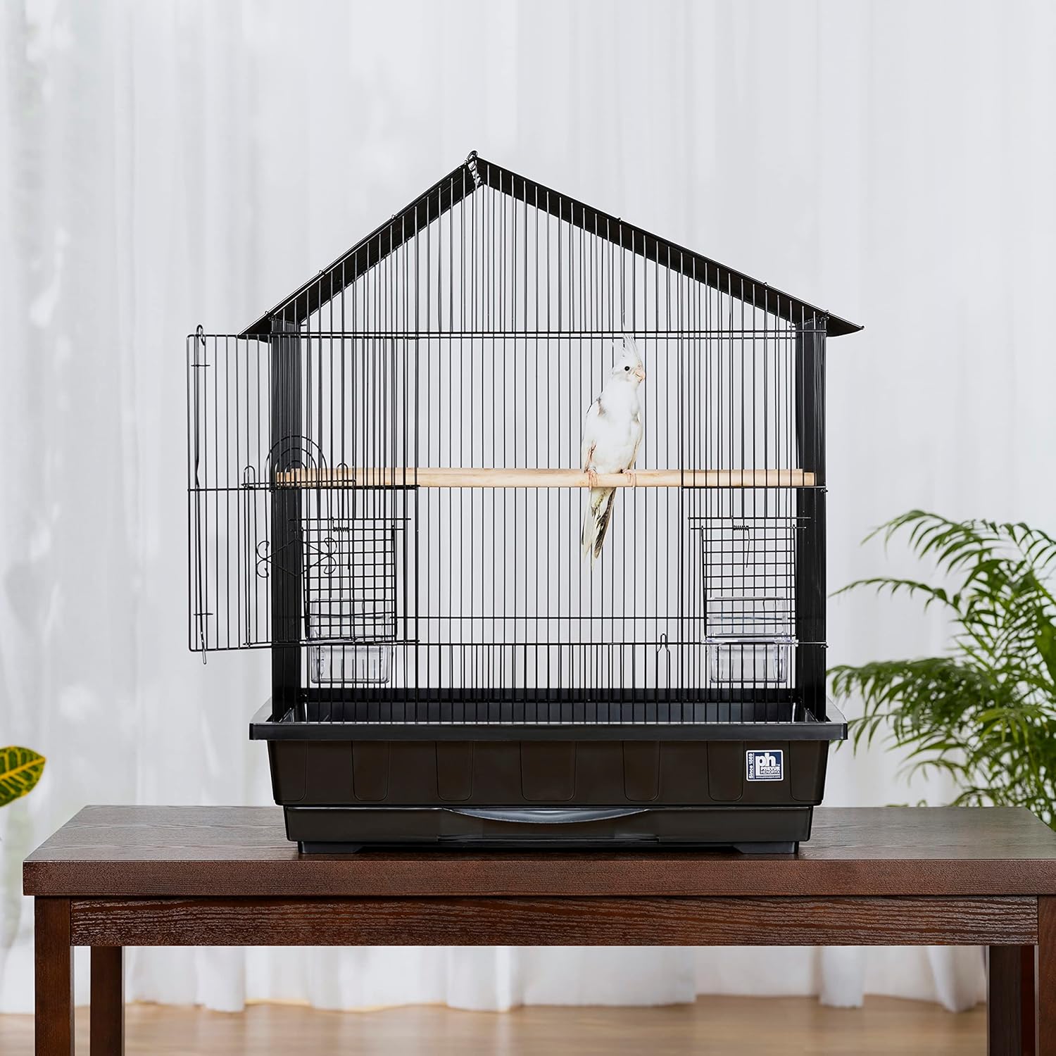 Prevue Pet Products Conure/Cockatiel Manor is ideal for conures, cockatiels, lovebirds & other similar-sized birds. This spacious Conure Manor includes a bottom grille with pull-out plastic bottom tray for ease of cleaning, plus two perches and two plastic hooded cups. The large front door allows access to the cage interior, while a smaller inset door allows access to your bird while minimizing exit space. With its unique offset roof design this cockatiel cage measures 25" long, 21" wide and 29" high with ½’’ wire spacing.