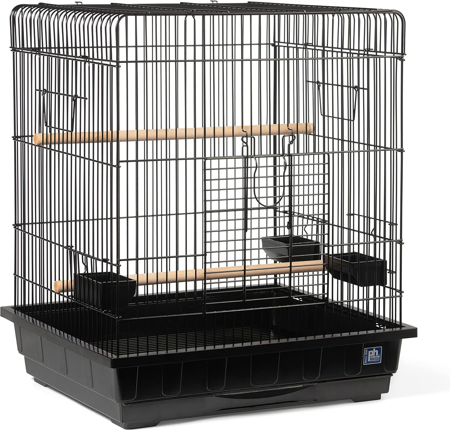 Prevue Pet Products Square Roof Parrot Manor in Black offers plenty of space for your small parrot or African Grey to play! This cage also makes a great secondary cage for your small parrot. You can easily access your bird through the large landing style front door and cleaning is simple thanks to the removable bottom grille and pull out tray. Three heavy duty, lock-in-place plastic dishes and two perches are included in this Square Roof Parrot Cage which measures 25" L, 21" W, 29 1/2" H with 3/4" wire spacing.