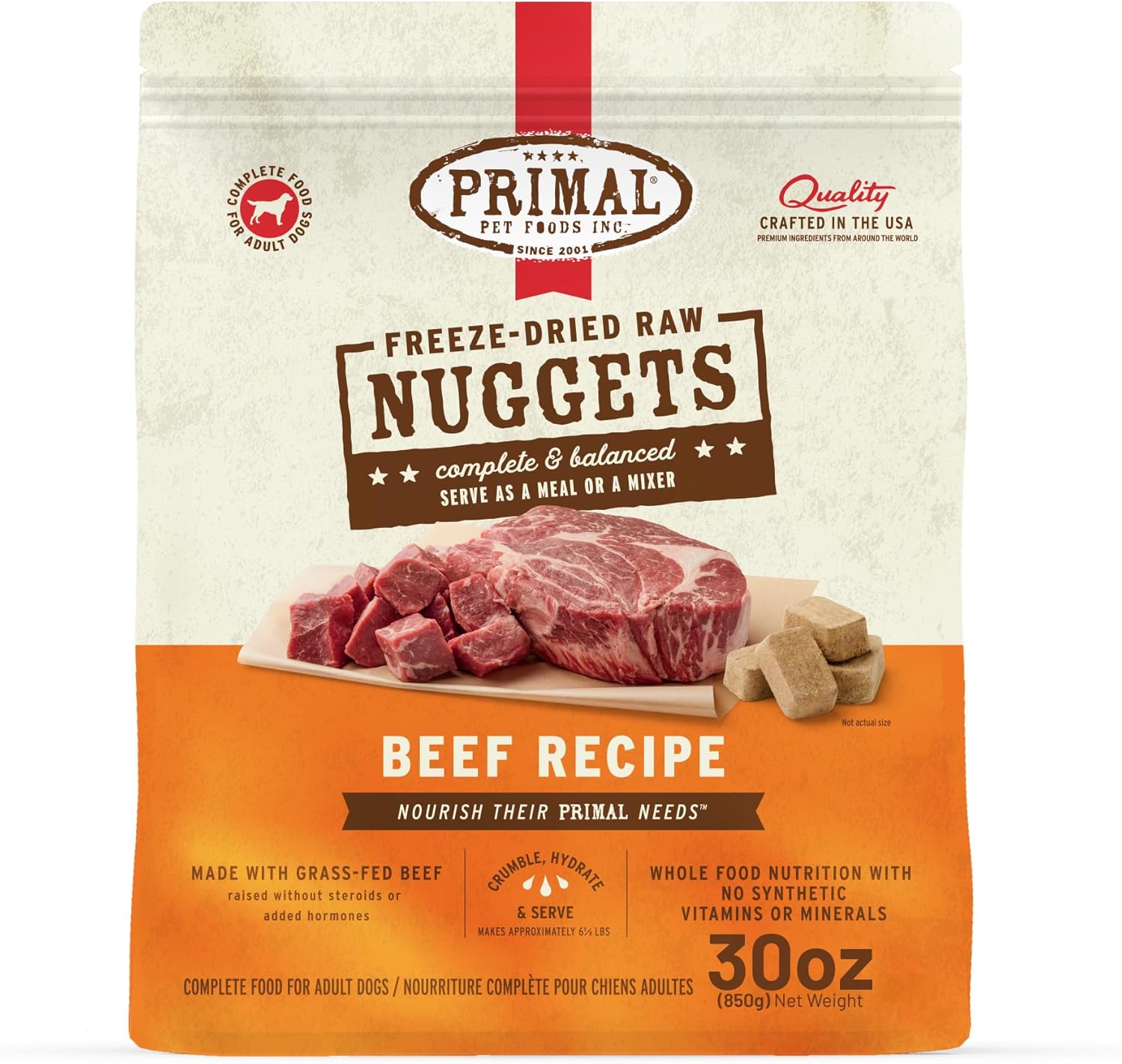 Primal's Freeze Dried Beef provides the raw nutrition dogs deserve. Crafted in the USA, this grain-free formula offers a complete and balanced diet, delivering essential nutrients in every bite. Whether served as a full meal or a freeze-dried dog food topper, this versatile food also doubles as a tasty freeze-dried dog treat. It’s designed to meet your dog's nutritional needs while delivering the flavor and satisfaction they crave. Made from premium freeze-dried raw dog food with grass-fed, antibiotic-free beef raised without steroids or added hormones, combined with USDA organic fruits and vegetables, this formula is grain-free and minimally processed for optimal digestibility. It supports healthy weight, skin & coat, oral & eye health, and helps reduce stool volume. Primal’s Freeze Dried Beef is shelf-stable, making it a convenient and delicious alternative to frozen dog food. It’s easy to scoop, crumble, and serve, and can be rehydrated with water, bone broth, or raw goat milk to satisfy your dog’s natural instincts. Each ounce contains 3-4 nuggets, providing a nutrient-rich, satisfying meal. Free from synthetic vitamins, minerals, artificial flavors, colors, and preservatives, Primal’s Freeze Dried Beef is crafted with real whole food ingredients. It contains no corn, wheat, soy, lentils, or legumes, making it an ideal choice for a healthy, natural diet. comida para perros, comida seca para perros, comida para perros liofilizada.