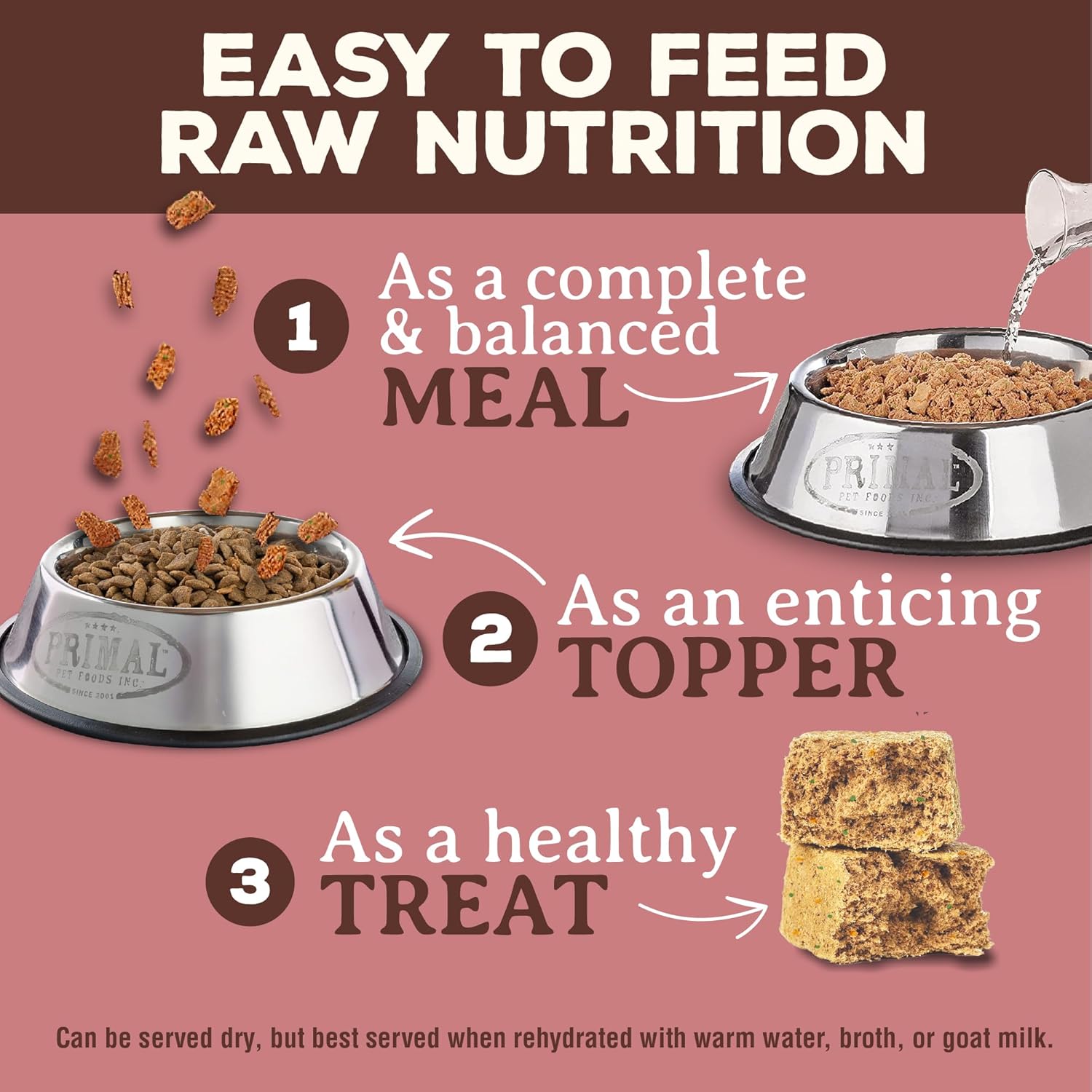 - Directions: Feeding Primal Freeze-Dried Formula is easy. Simply serve as is, or rehydrate by adding water. To rehydrate, add 1 tablespoon of water for every nugget, or 1/4 cup of water for 4 nuggets. For best rehydrating results, break nugget into small pieces and mix thoroughly with water to force moisture into product.
