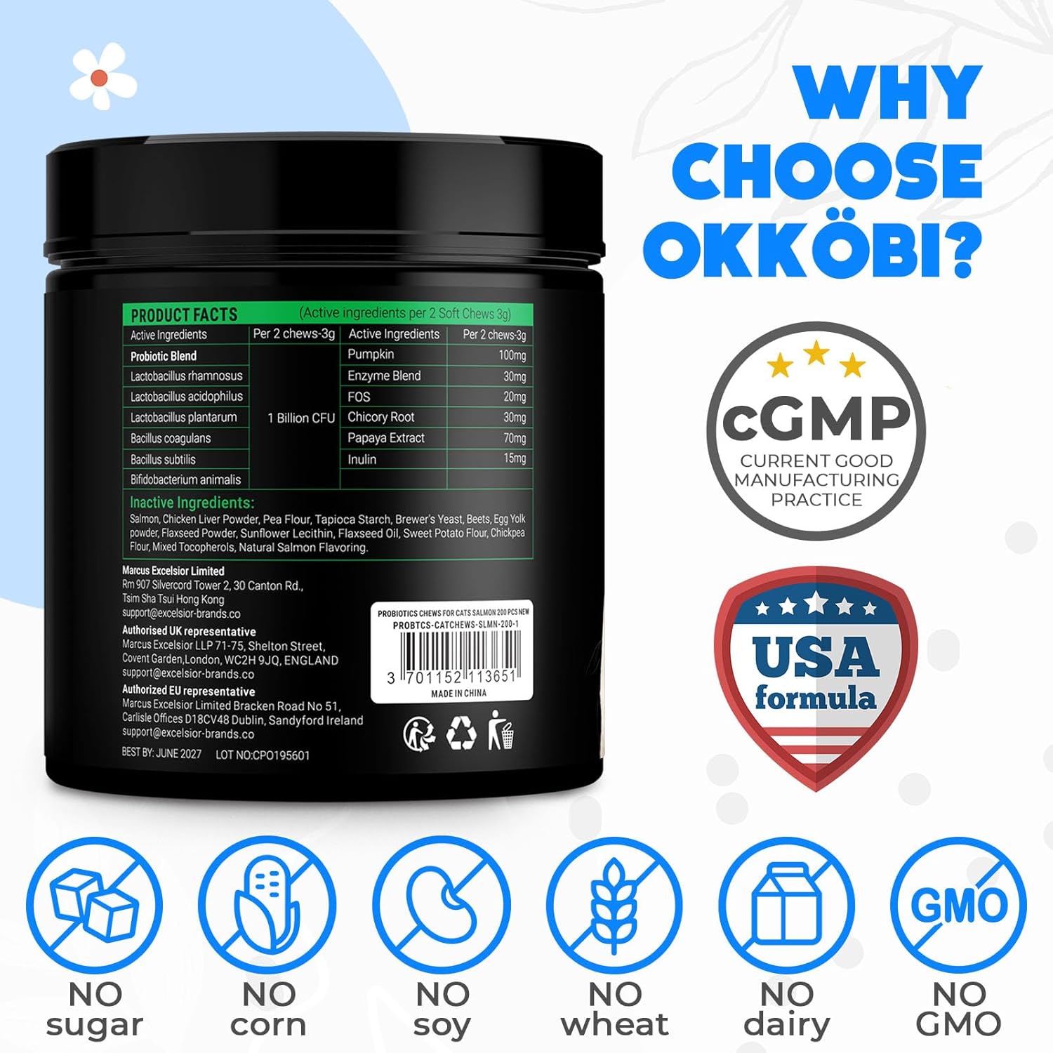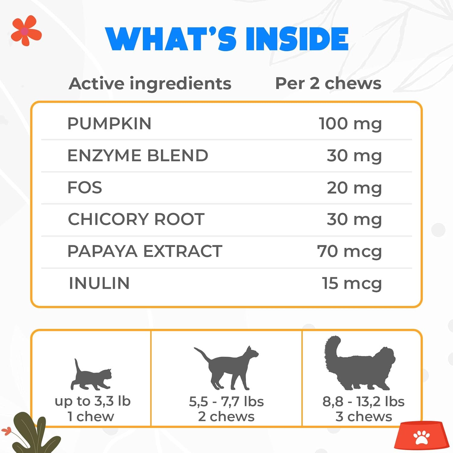 About this item 😺 HEALTHY TUMMY, HAPPY KITTY: Our Probiotics for Cats Chews are specially formulated to support digestion, promote good bacteria gut and boost your kitten's immune system. Perfect to relieve tummy pain! 🍃 NATURAL INGREDIENTS, SAFE AND SOUND: Our composure pet probiotics chews are packed with premium ingredients including Pawpaw Extract, Chicory Root Fiber, FOS & Inulin and Premium blend of Enzymes & Probiotics. These treats offer natural, safe, and effective tummy relief for cats. Expert-approved for peace of mind! 🐟 DELICIOUS FLAVORS CATS LOVE: Available in Salmon flavor, these cats probiotic for digestive health are not just effective but tasty too. No more wrestling with your furry friend to take their cat supplements; they'll be begging for more of these delicious treats! 🕐 FAST-ACTING, LONG-LASTING: Our probios for cats start working within 30-45 minutes, providing up to 24 hours of gut health support. Perfect for those moments when your cat feels unwell, ensuring they can fully enjoy their day without any discomfort. 🐾 WE'VE GOT YOUR BACK – AND YOUR CAT'S! Enjoy the confidence of a 5-year assurance and our friendly customer service team, available 7 days a week. We're here to ensure your furry friend stays happy and healthy, because we care just as much as you do. › See more product details