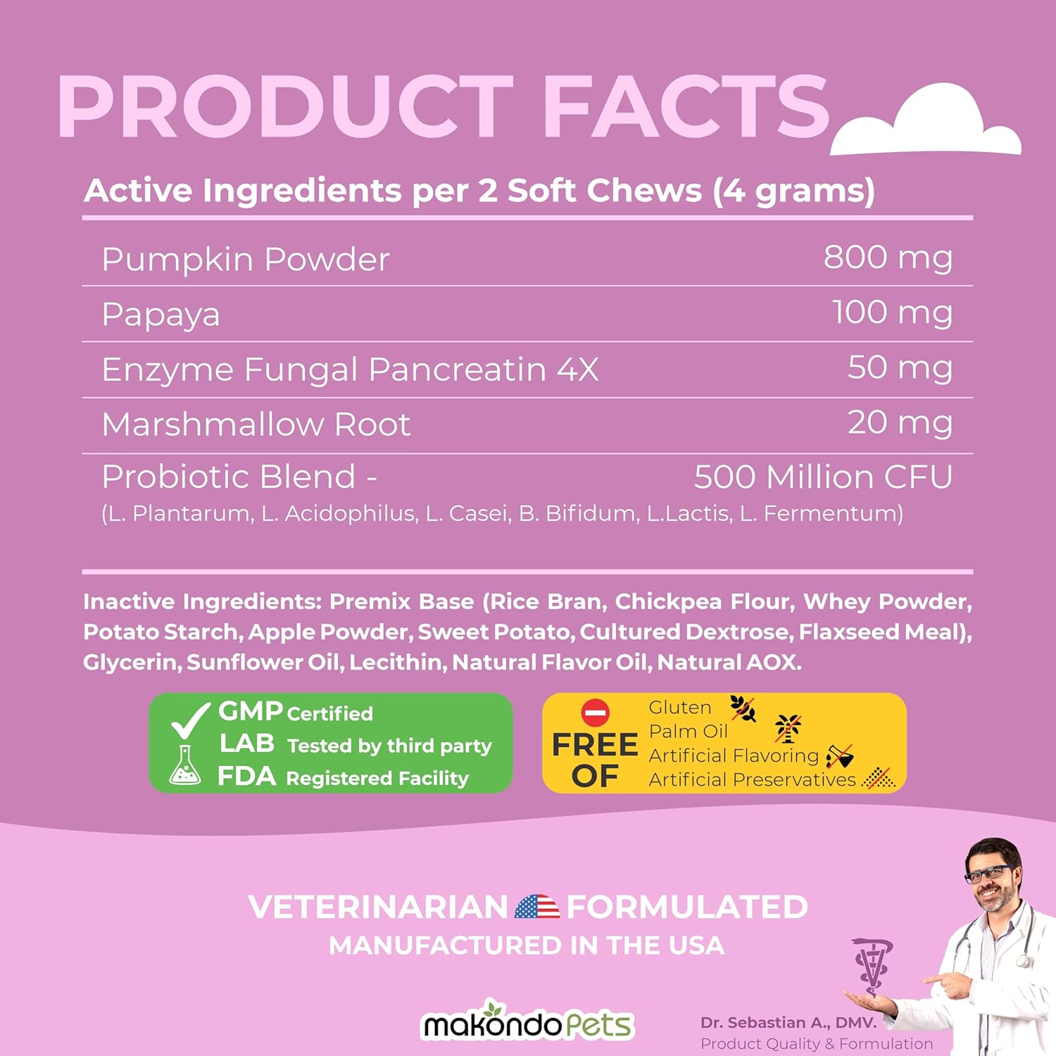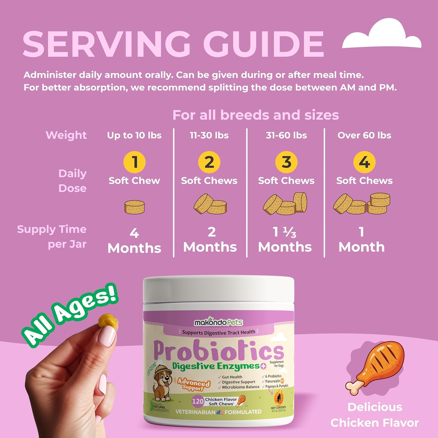 About this item SUPPORTS DIGESTIVE HEALTH: Our dog probiotic for digestive health help keep a balanced gut microbiome, reduce bloating, gas & belly discomfort. Dog probiotics for yeast, itchy skin and itchy ears. ENHANCES NUTRIENT ABSORPTION: Packed with digestive enzymes for dogs, our soft chews support food breakdown, digestion, and vitamins absorption for better energy, immunity, and well-being. RELIEVES PET DIARRHEA, BLOATING & CONSTIPATION: Our Dog allergy chews are formulated with premium pet probiotics for dogs. This puppy fiber supplement supports poop, firm stool, and gut balance. PREMIUM BLEND BITES- 6 Probiotics Strains, Pancreatin 4X Digestive Enzymes, Papaya, Pumpkin & more. Natural human grade chicken flavor treats for a healthy life. No hassle with pills, powder or tabs. ALLERGY RELIEF & IMMUNITY BOOST- by supporting healthy digestion, our puppy probiotics essentials help your pets support food allergies, that may also manifest in skin issues; strong immune system. MAKONDO PETS a brand you can trust – Vet Dr formulated Chicken-Flavor Chews made in FDA-registered facilities in the USA. Made from US and Globally Sourced Ingredients. Mix it with the animal food. › See more product details