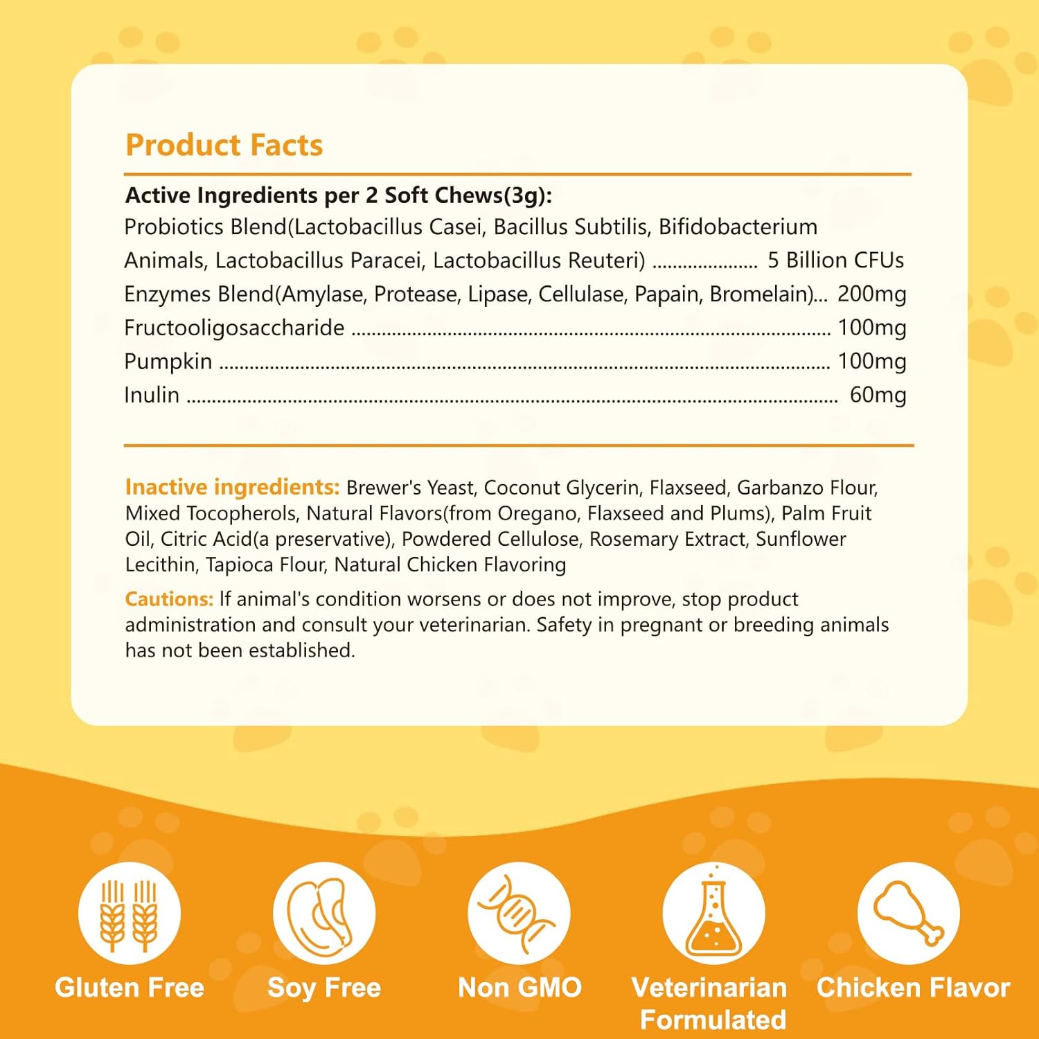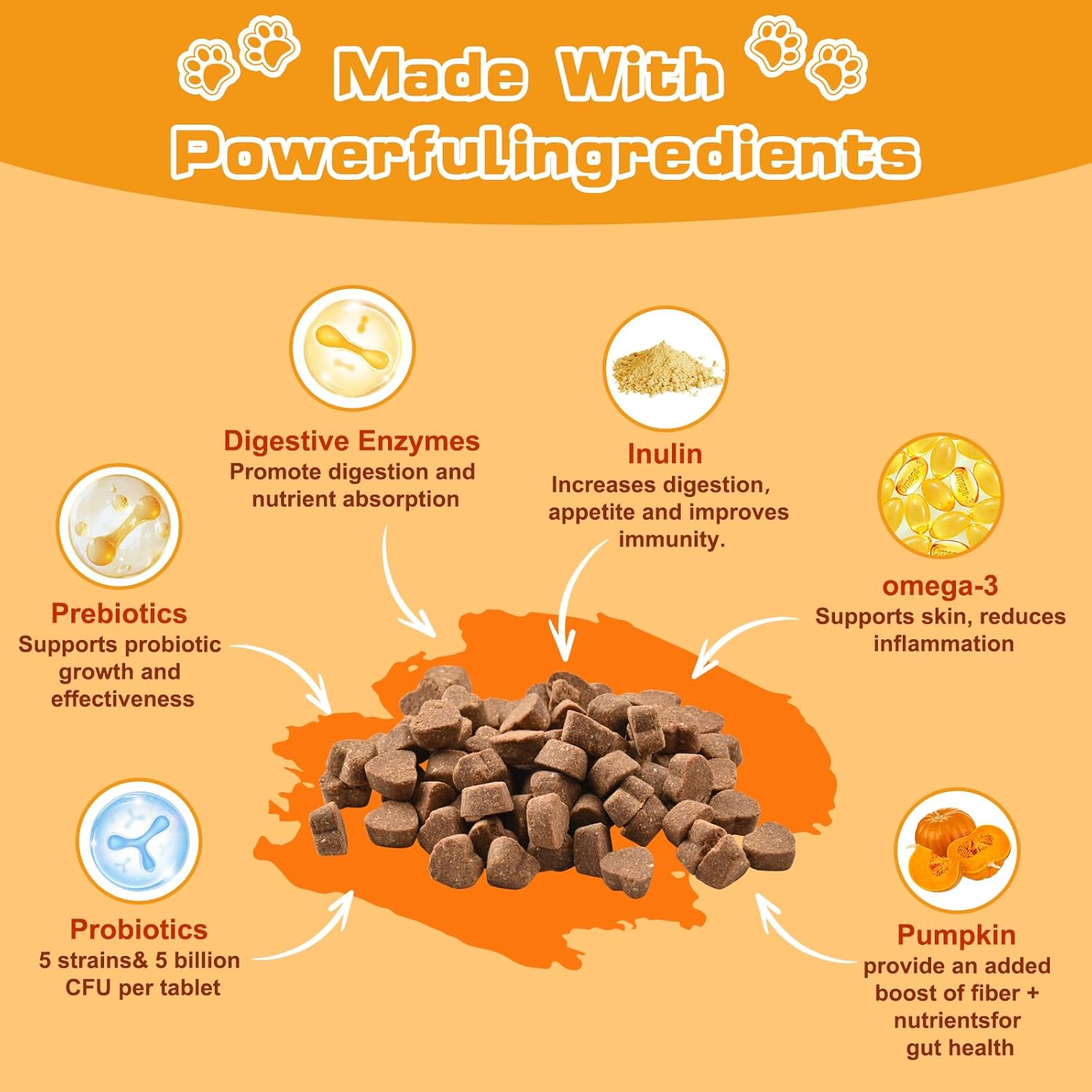 About this item Supports Digestion + Nutrient Absorption: Our soft chewable probiotic tablets for dogs and cats contain 5 strains of probiotics, 5 billion CFUs and other natural ingredients such as an enzyme blend. These ingredients work together to balance the intestinal flora, improve digestion, and promote nutrient absorption. Prebiotics & Digestive Enzymes: With this pet probiotic we have also added prebiotics to help nourish the growth of probiotics.6 digestive enzymes and pumpkin fibre to improve appetite, break down food and promote nutrient absorption. Helps pets with bad breath, bloating, diarrhoea, constipation and vomiting, paw licking and more. Supports Skin & Coat Health: Is also added to contain flaxseed & vitamin E, which has antioxidant properties that benefit skin health, a shiny coat, relieves dry skin, itchy licky paws, and reduces inflammation and seasonal allergies. Promotes Overall Health: Probiotics also contain a blend of trace minerals formulated to promote your pet's overall health through immune enhancement. Supporting liver health, cardiovascular health, joint and bone health, it provides energy and vitality for growing and senior pets so they can live happier lives! Highly Effective Technology: Probiotic supplements use a special freeze-drying technology that maximises the activity and stability of the probiotics, which are particularly resistant to stomach acid and bile. Soft chews have a delicious chicken flavour that is like a snack your dog will love, suitable for puppies to senior dogs. › See more product details