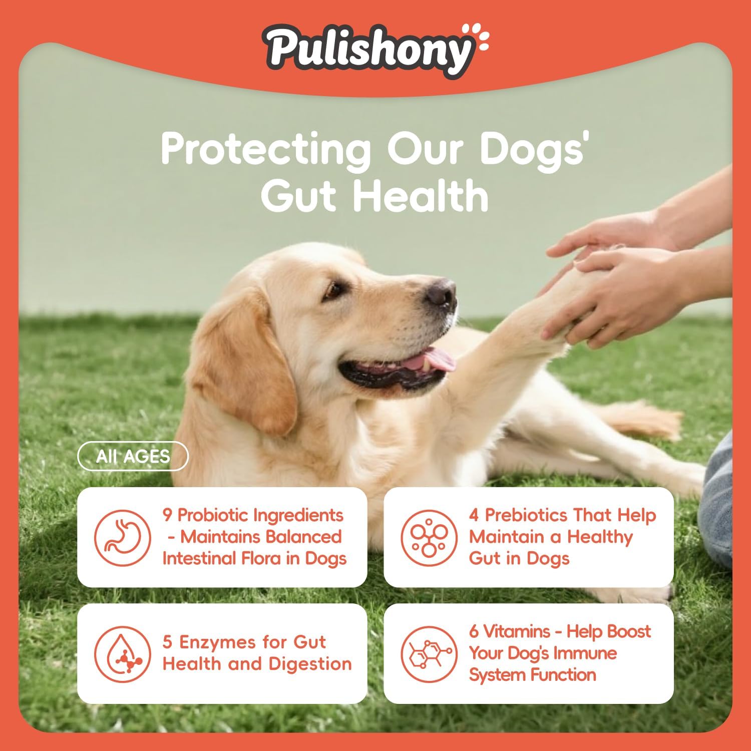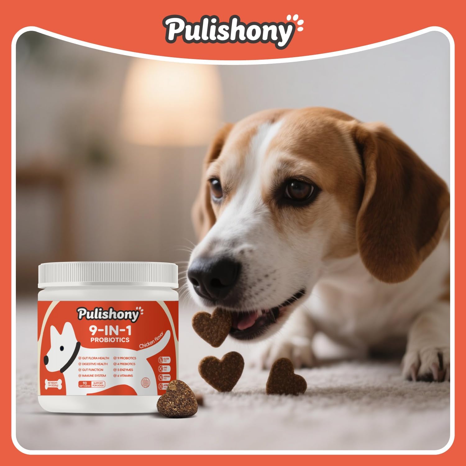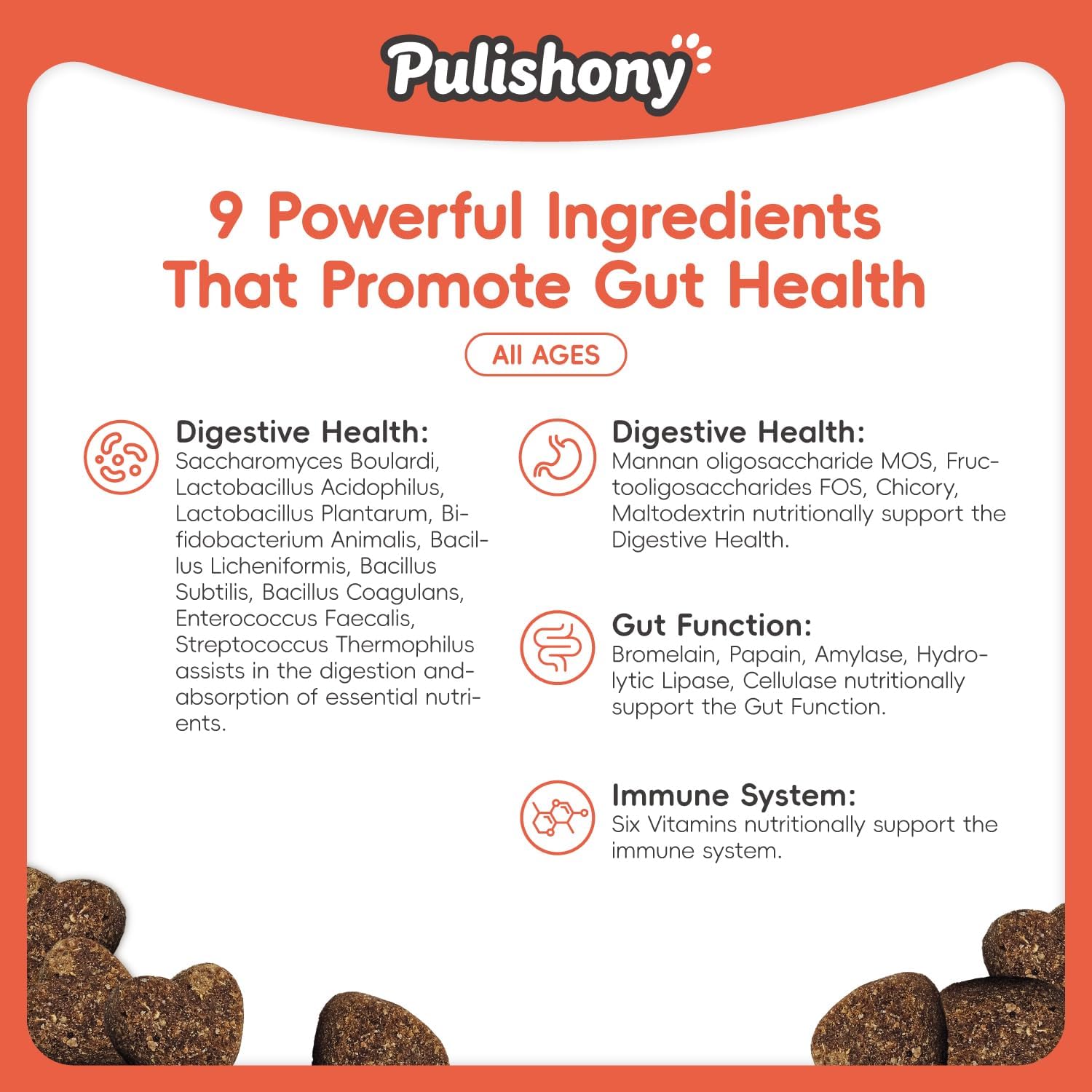 Digestive Health:Saccharomyces Boulardi, Lactobacillus Acidophilus, Lactobacillus Plantarum, Bifidobacterium Animalis, Bacillus Licheniformis, Bacillus Subtilis, Bacillus Coagulans, Enterococcus Faecalis, Streptococcus Thermophilus assists in the digestion andabsorption of essential nutrients. Digestive Health:Mannan oligosaccharide MOS, Fructooligosaccharides FOS, Chicory, Maltodextrin nutritionally support the Digestive Health. Gut Function:Bromelain, Papain, Amylase, Hydrolytic Lipase, Cellulase nutritionally support the Gut Function. Immune System:Six Vitamins nutritionally support the immune system. Ingredients: Salmon Oil, Tapioca Starch, Peanut butter, Ground Chickpeas, flaxseed, Sunflower Lecithin, Coconut Glycerol, Powdered Cellulose, Pumpkin, Dried Apple Pomace, Dried Avocado, Cranberry Powder, Seaweed Powder, Natural Chicken Flavor, Turmeric Extract, Vitamin A, Ascorbic Acid, Niacin, Folic Acid, Biotin, Calcium Pantothenate, Choline, Vitamin E, Manganese Proteinate, Lysine, Saccharomyces Boulardi, Lactobacillus Acidophilus, Lactobacillus Plantarum, Bifidobacterium Animalis, Bacillus Licheniformis, Bacillus Subtilis, Bacillus Coagulans, Enterococcus Faecalis, Streptococcus Thermophilus, Mannan oligosaccharide MOS, Fructooligosaccharides FOS, Chicory, Maltodextrin, Bromelain, Papain, Amylase, Hydrolytic Lipase, Cellulase, Rosemary Extract, Citric Acid.