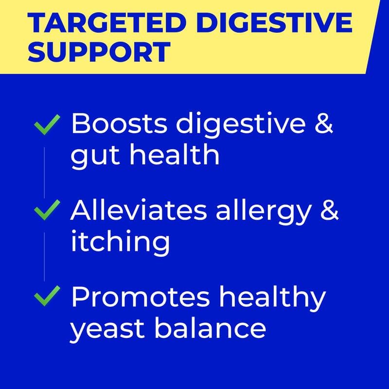 "Discover a healthier and happier life for your furry friend with our Dog Probiotics & Digestive Enzymes supplement. While this natural supplement may take a few weeks of consistent daily use to show results, we understand that every dog is unique. If your pup doesn't respond to our chews, don't hesitate to contact us for a hassle-free refund. Why choose PawfectChew Dog Probiotics? - Supports Gut Health & Digestion: Our chewable tablets, suitable for dogs of all breeds and sizes, are packed with beneficial probiotics, enzymes, and prebiotics. Say goodbye to digestive issues, gas, and stomach upsets. - Relief for Allergies & Itchy Skin: Our unique blend of probiotics and digestive enzymes provides relief for dogs with allergies, itchy skin, and yeast issues. Boost your dog's immune system and promote optimal digestion, ideal for sensitive stomachs and digestive problems. - Skin & Coat Health: Combat issues like licking, itching, and dull coats with our supplement, suitable for all dogs, from active puppies to seniors. - Tasty & Easy to Chew: Our delicious chicken-flavored chews are a hit even with picky eaters. - Made in the USA: All our products are proudly made in the USA, ensuring the highest quality and safety for your pet. Give your pet the support they deserve for a healthier, happier life. Try our Dog Probiotics & Digestive Enzymes supplement today and see the positive difference it can make in your dog's overall health!"
