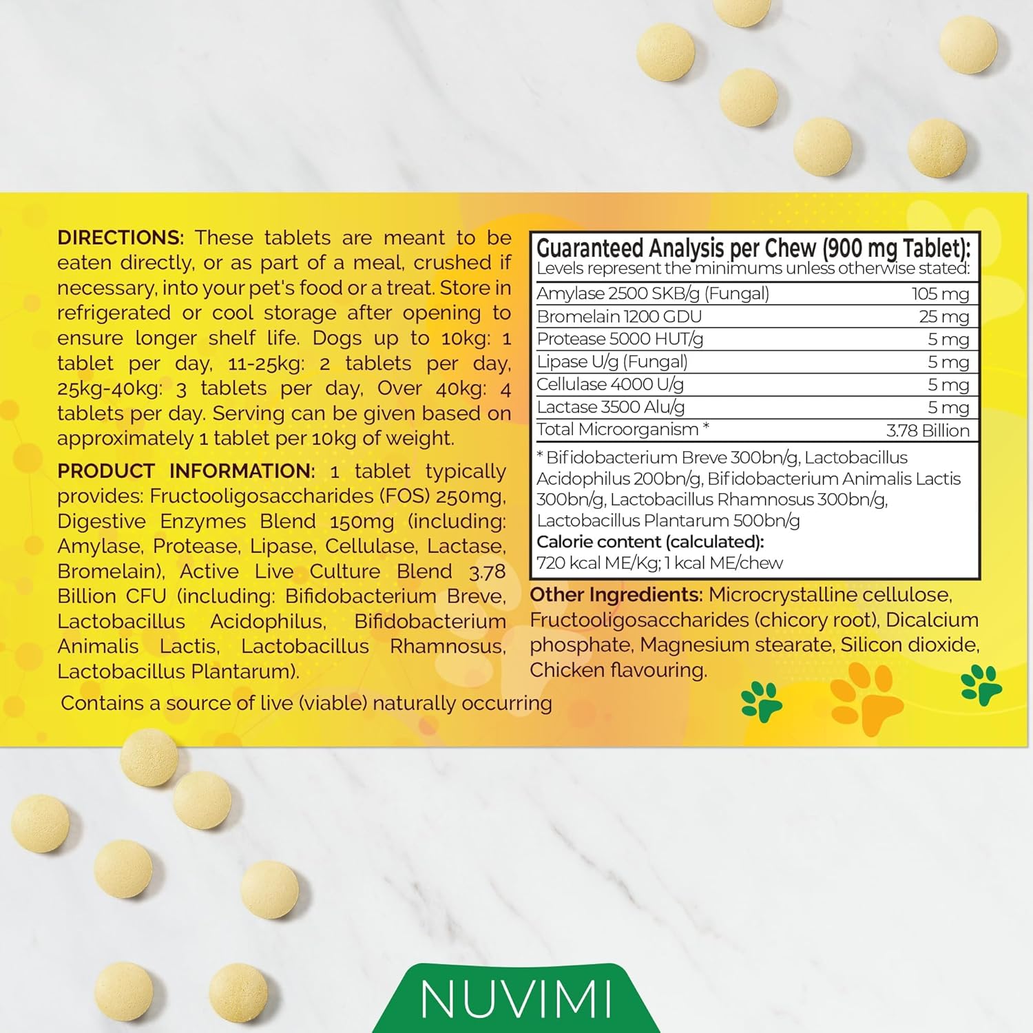 ENHANCE DIGESTIVE HEALTH - These specially formulated dog probiotics are designed to promote optimal digestive health; By maintaining a balanced gut microbiome, they help reduce common digestive issues such as diarrhea, constipation, and upset stomach BOOST WHOLE-BODY WELLNESS - This dog fiber supplement contains 3.78 billion CFUs of probiotics and prebiotics, including lactobacillus & bifidobacterium, which relieves blocked-up bowels, bad breath, and skin issues; Plus, they strengthen your dog's immune system to help prevent itching & allergies ADVANCED INGREDIENTS - With a 5-strain blend of probiotic and prebiotics, containing 6 active enzymes, and more than 10 active ingredients, these pills are non-GMO, dairy-free, egg-free, gluten-free, and soy-free FOR BIG DOGS & YOUNG PUPS - No matter how grown up your pooch is, you love them like they were just born; With everything theyβre exposed to, all pups need the TLC of dog probiotics; Follow the handy dosage guide to meet the specific needs of your big or small dog TRUSTED QUALITY - At NUVIMI, nutritional supplements for dogs are created with high standards and quality service; NUVIMI takes pride in producing premium products for pets and in helping maintain their health inside and out βΊ See more product details