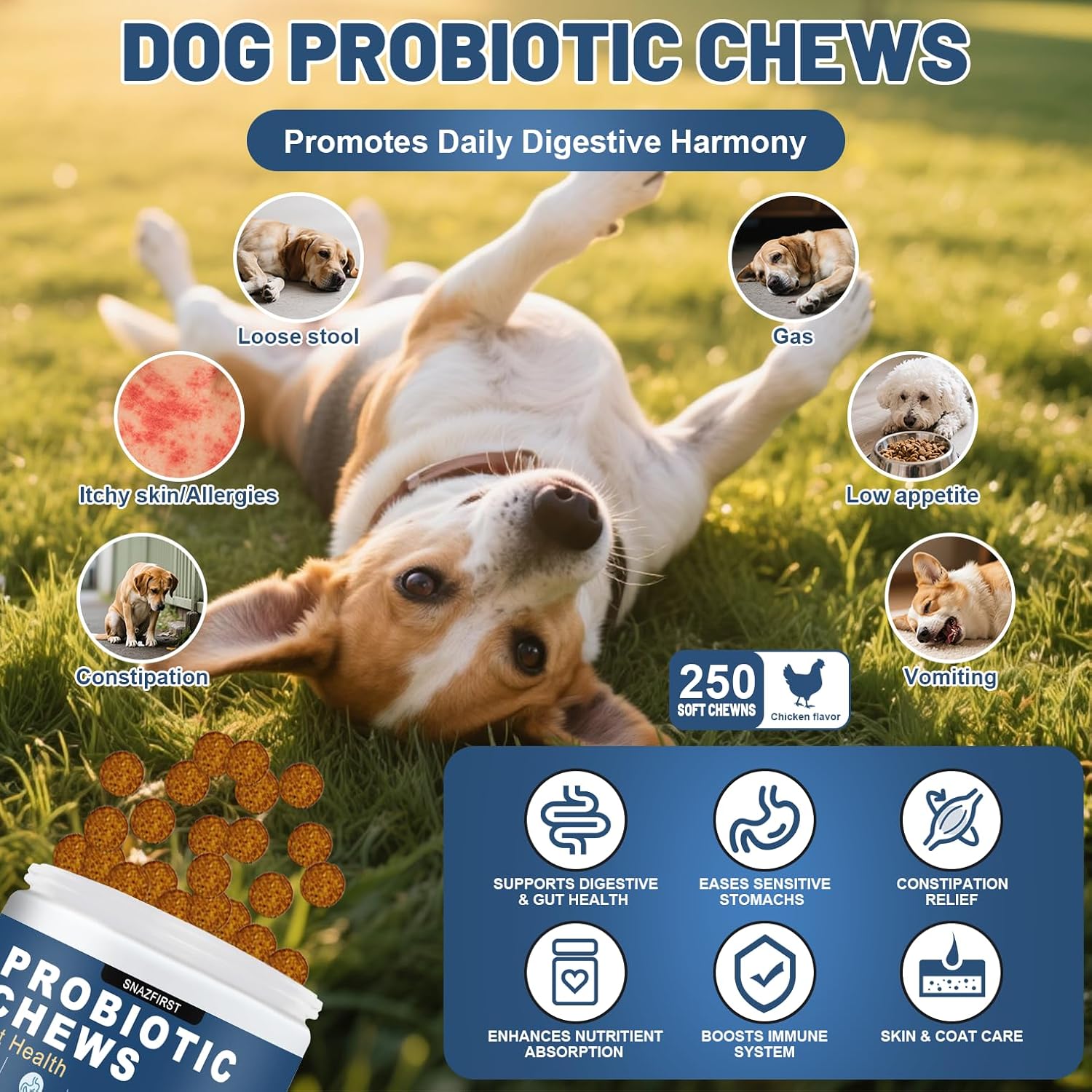 About this item Improve Gut Health & Relieve Digestive Issues: Our probiotic chews for dogs formulated with 5 probiotics, that can promote gut health and relieve common digestive issues such as irritable bowels, gas, bloating, constipation, loose stools, and anal gland problems. Immune System & Gut Flora Support: Our probiotics for dogs can strengthen your dog's immune system while alleviating food allergies that can cause skin conditions. Quality Probiotic Formula: Our probiotic chews for dogs tablets are rich in inulin and pumpkin, Inactive ingredients include brewer's yeast, natural chicken seasoning, glycerin, etc all natural ingredients carefully matched,delicious, safe and effective. Delicious Chicken Flavor Soft Chews: Treat your dog to a delicious chicken-flavored probiotic experience. Say goodbye to messy powders, measuring, or hard-to-swallow pills. Our soft dog treats chews make administering probiotics effortless and enjoyable. Loved by dogs, these chews turn supplementation into a stress-free experience. DAILY Dog Probiotic Supplements: This probiotic chew is specially formulated for dogs and be rich in probiotic for dogs and enzymes; Contribute to probiotic dog enzymes for dogs and help your pet get the most nutrients from their daily diet, Is probiotic chew for dogs and probiotic dog treats. Suit for all breeds and sizes, especially dogs with sensitive stomachs, poor digestion, weak immunity, or fussy eating habits. Whatever puppies to senior dogs, this formula provides sustained digestive and skin health support. › See more product details