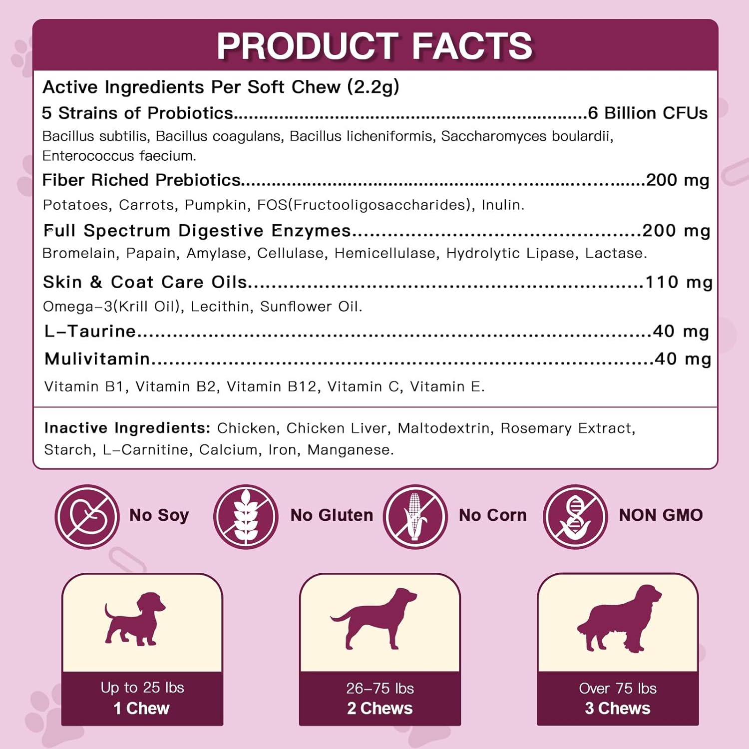 About this item Balances Gut Flora: Our dog probiotics contain 6 billion CFUs & fiber-rich prebiotics, pumpkin, inulin that help nourish probiotics while digestive enzymes for dogs to provide optimal gut health and dog digestive support, relieve occasional indigestion Direct-acting Spore Probiotics: Our dog probiotic has multiple spore strains that survive stomach acid to target deep intestine, more effectively support anti diarrhea for dogs, dog gas relief, constipation and bad breath, promoting stool quality Support Immunity & Increase Energy: The probiotic for dogs helps maintain a healthy immune system by enhancing gut health. Pet probiotics for dogs also contain dog vitamins, taurine to help support energy levels and vitality, promote holistic health Improve Skin & Coat Condition: Our probiotic chews for dogs carefully selected beneficial strains may support skin health. It also contains omega 3 for dogs, helps with dog allergy relief & itchy skin, and promote a smooth fur Easy to Chew for All Breeds and Ages: Our probiΓ³ticos para perros is a tasty chicken flavor chewy treats that your dog will love. Unlike hard-to-swallow pill, you dont have to hide our dog gut health probiotics in the food Premium Natural Ingredients: Our puppy probiotic is made with 100% real chicken with no artificial additives. Free of wheat, soy, corn, Non-GMO. Vacuum packaging protects the soft chews' active ingredients, helping to maximize overall efficacy βΊ See more product details