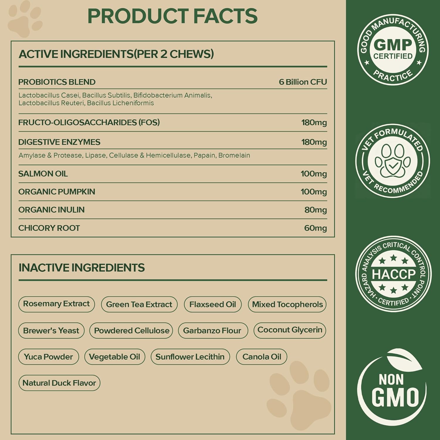 About this item SYMBIOTIC DIGESTIVE ECOSYSTEM: Our dog probiotics build a 4-way digestive ecosystem: Digestive enzymes pre-break nutrients for easy absorption, while probiotics + prebiotics balance and nourish gut flora. Pumpkin helps dogs with a sensitive stomach maintain regular bowel movements. These layers go beyond ordinary probiotics, turning every meal into steady nourishment, digestive ease, and enduring energy*—so your dog stays balanced and full of life. TRIPLE IMMUNE SUPPORT: Gut health drives immunity, and our probiotics for dogs target it. Probiotics help maintain a balanced gut microbiome and support mucosal immunity, while plant antioxidants* (Rosemary & Green Tea) and natural Vitamin E help protect immune cells from daily wear and tear. Formulated for triple immune support - helping your dog stay vibrant and ready for everyday adventures. DUAL-ACTION SKIN & COAT NOURISH: True skin and coat health starts from within. Gut and immune support work in sync with Salmon and Flaxseed Oils (Omega-3 & 6) to nourish skin and coat from the inside out. This dual-action care promotes a soft, shiny, and glossy coat you’ll love to touch. PURE INGREDIENTS: We believe in complete ingredient integrity. Every batch of our dog probiotic chews is crafted in GMP-certified facilities using trusted, premium sources. They are free from grains, soy, and artificial additives. This commitment to safety and quality ensures a clean formula you can trust for your dog’s overall wellness. TASTE DOGS LOVE: Made with natural duck flavor, our probiotic chews are loved by most dogs, even picky eaters. Unlike other hard chews, these soft, easy-to-bite chews are perfect for puppies and senior dogs. They help support digestive comfort, gut balance, and skin & immune health: areas commonly affected by occasional diarrhea, seasonal allergies, itchy skin, or paw licking. A tasty daily chew your dog will love. › See more product details