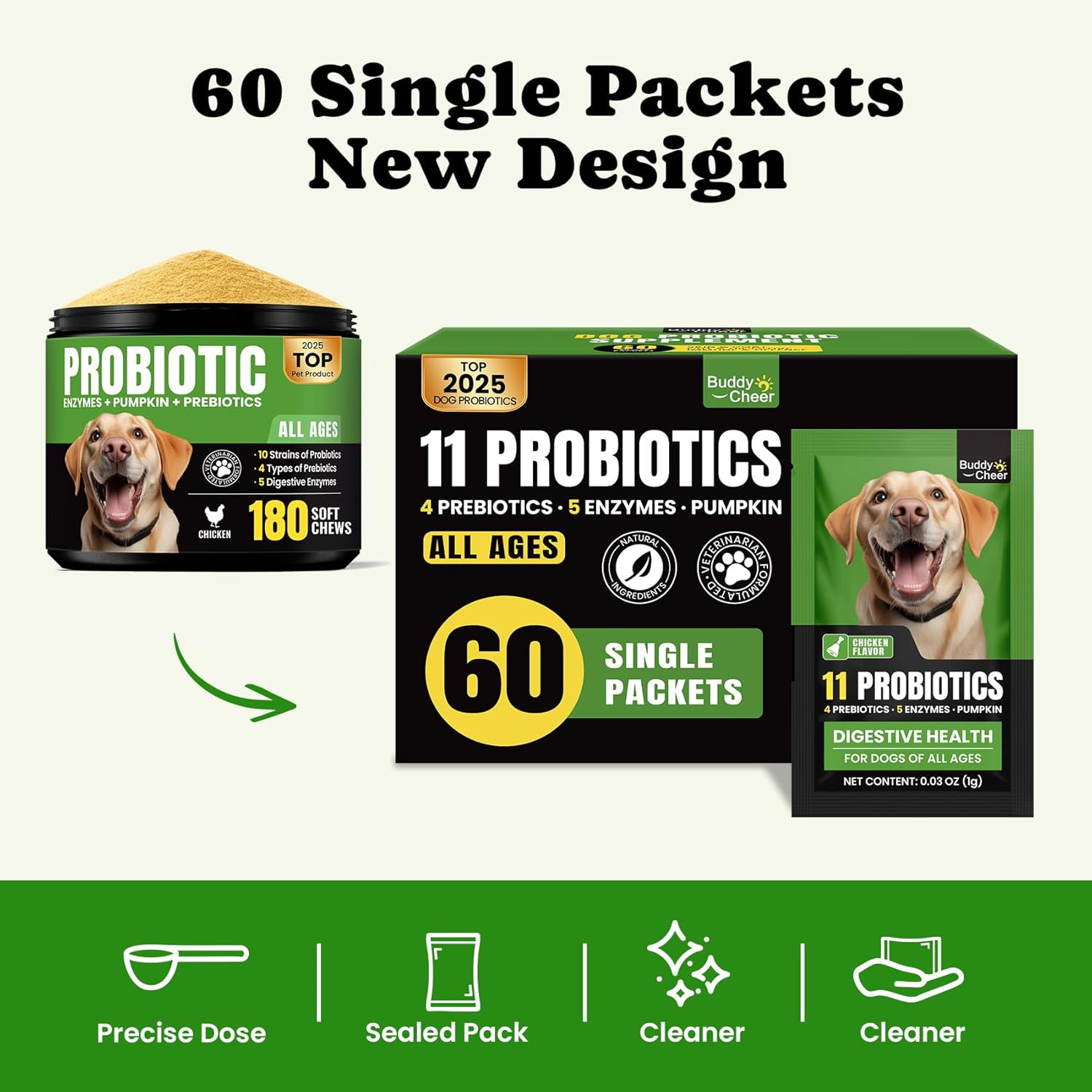 About this item 【11 strains probiotics】 Formulated with 11 strains of probiotics for dogs and a high potency of 11 Billion CFU, including Lactobacillus and Bifidobacterium, to balance gut flora and improve stool quality. These beneficial dog probiotics help reduce diarrhea, constipation, and bloating while strengthening nutrient absorption—a complete probiotic solution for daily digestive wellness and overall health. 【 5 Digestive Enzymes 】 Our blend includes 5 digestive enzymes to help break down protein, fat, carbs, and fiber, reducing stomach stress and improving nutrient absorption. This synergistic mix boosts the effects of dog probiotics while making food easier to digest. A complete probiotic for dogs formula designed to support smoother digestion and higher vitality. 【 4 Prebiotics 】 Enhanced with 4 natural prebiotics, this powder works hand in hand with premium dog probiotics to feed good bacteria and help them thrive. By pairing probiotics for dogs with prebiotics, our formula supports sensitive stomachs, relieves digestive upset, and maintains a balanced intestinal 【60 Packets--2-Month Supply】 Unlike other dog probiotic powders that only offer 30 packets, our box provides 60 single-serve packets—a full 2-month supply for daily digestive care. With more servings, our probiotics for dogs ensure longer-lasting protection, better value, and ongoing digestive balance. 【 Single-Serve Packet 】 Our dog probiotic powder comes in pre-measured single-serve packets, making it simple to sprinkle directly onto your dog’s food with no mess. Unlike chews or capsules, these packets ensure probiotics for dogs are delivered with precise dosage every time. Compact and easy to carry, they provide consistent digestive support at home or on the go. 【Buy with Confidence】 We stand behind our products. If you or your pet aren’t fully satisfied with the results, we’ve got you covered. 👉️Any product issues, please contact us via Amazon Message Center. Enjoy a FULL-REFUND, NO QUESTIONS ASKED! › See more product details