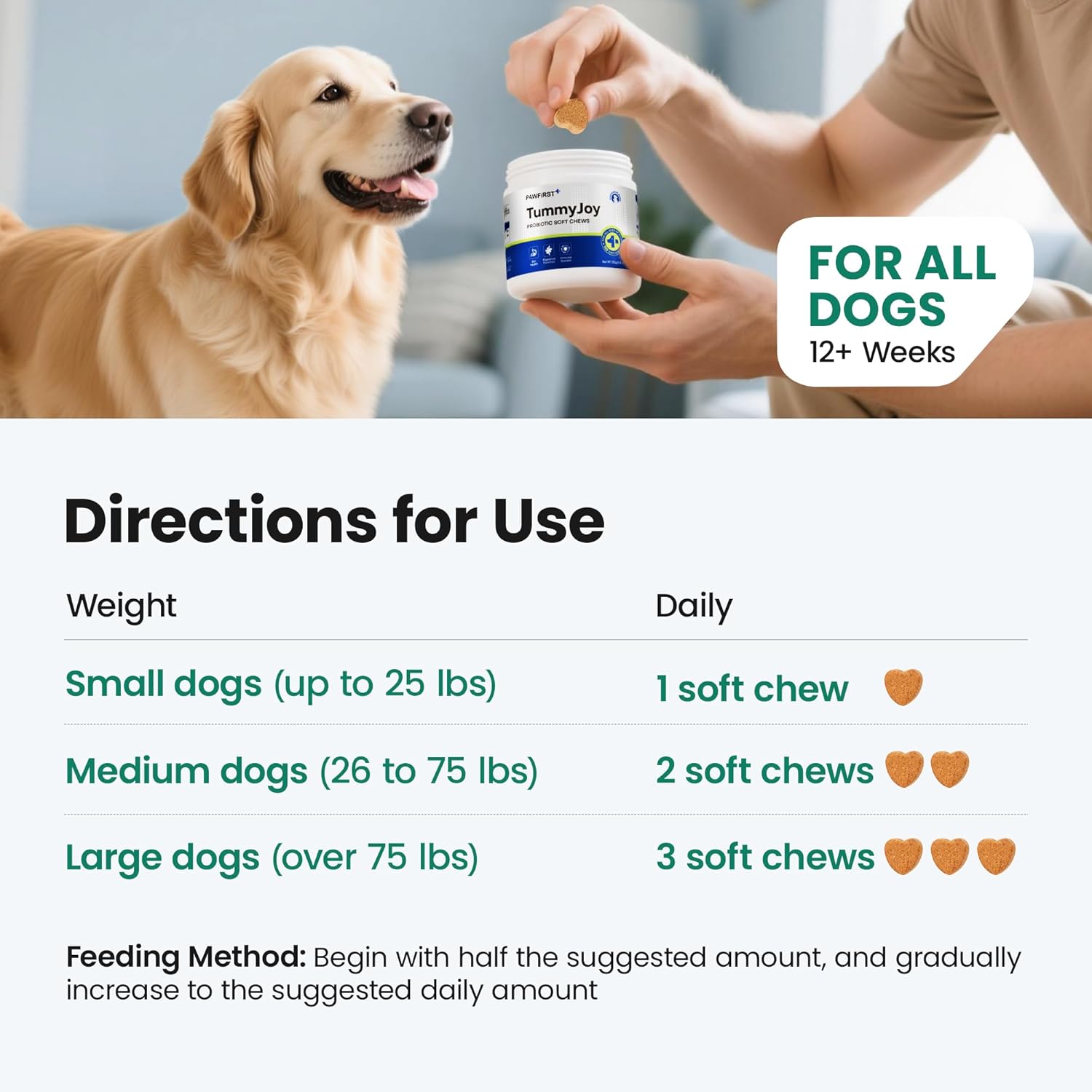 - Directions: Begin with half the suggested amount, and gradually increase to the suggested daily amount. Amounts can be split between AM and PM., For use in canine species only. For use in dogs over the age of 12 weeks., Under 25lbs 1 Soft Chew Daily, 25-75 lbs 2 Soft Chews Daily, Over 75 lbs 3 Soft Chews Daily