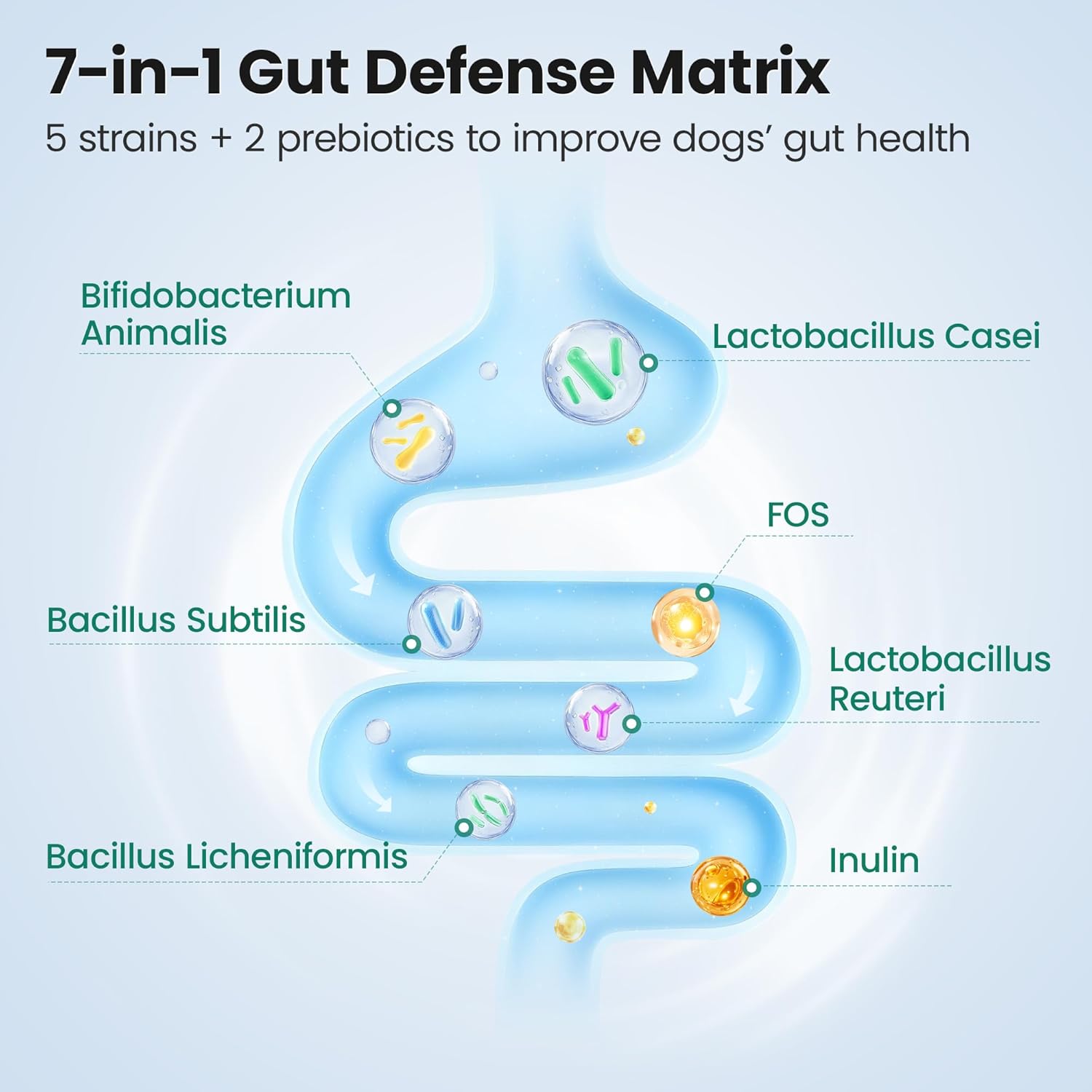 - Active Ingredients: Active Ingredients Per 2 Soft Chews (5g) Probiotic Blend (Lactobacillus Casei, Bacillus Subtilis, Bifidobacterium Animalis, Lactobacillus Reuteri, Bacillus Licheniformis) 6 Billion CFU; Fructo oligosaccharides (FOS) 200mg; Total Enzymes (Amylase & Protease, Lipase,Cellulase & Hemicellulase, Papain, Bromelain) 200mg; Inulin 100mg; Pumpkin 100mg; Chicory Root 60mgSee more