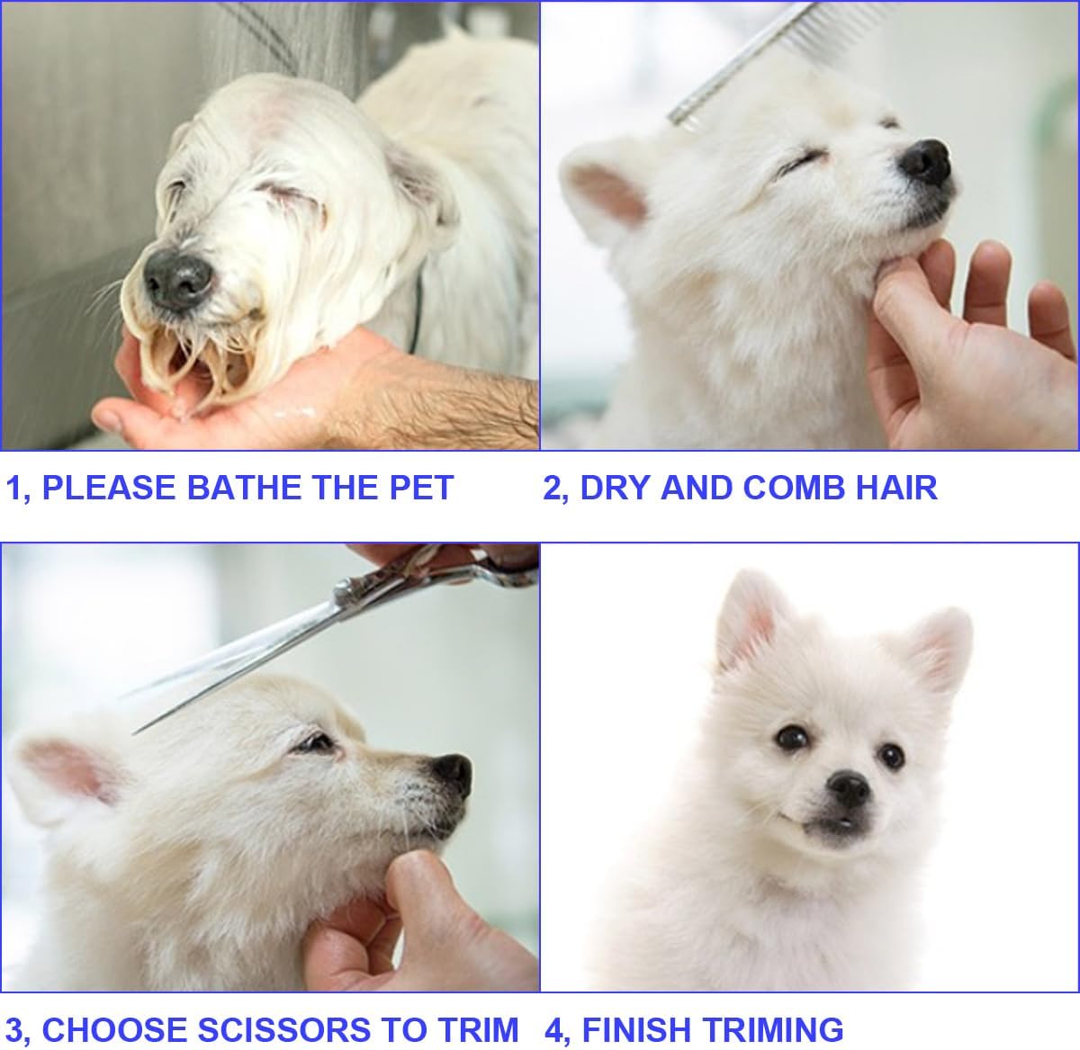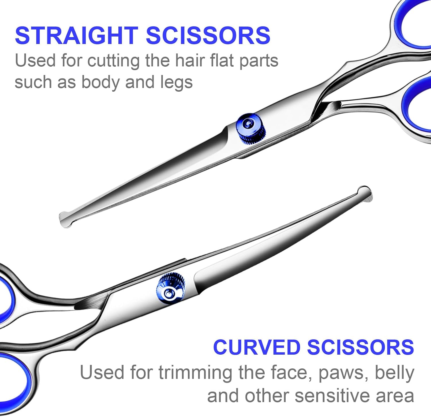 TINMARDA, Enjoy grooming time with your pet. Why Choose Our Pet Grooming Scissors Kit?Straight scissorsThe straight shears are made from razor-sharp stainless steel that ensures precise and speedy trimming, perfect for cutting length off your pet’s fur on legs and back. Curved scissorsThis professional tool is paw-fect for curved surfaces like around the ears or on a poodle’s head. Since they are designed to deliver superior precision, they are also great for cleaning up the chest or rib cage.Thinning scissors Perfect for blending, thinning and cleaning up wiry coats. They are also especially effective when used around your sidekick’s face and even on delicate areas like the inside corners of her eyes.Grooming combFeatures a combination of rounded-tip teeth, making it easy to effortlessly glide the comb through your pal’s fur.Order come with:1 * 6.5-inch thinning shears2 * 6.5-inch curved scissors1 * 6.5-inch straight scissors1 * grooming comb1 * cleaning cloth1 * black leather case