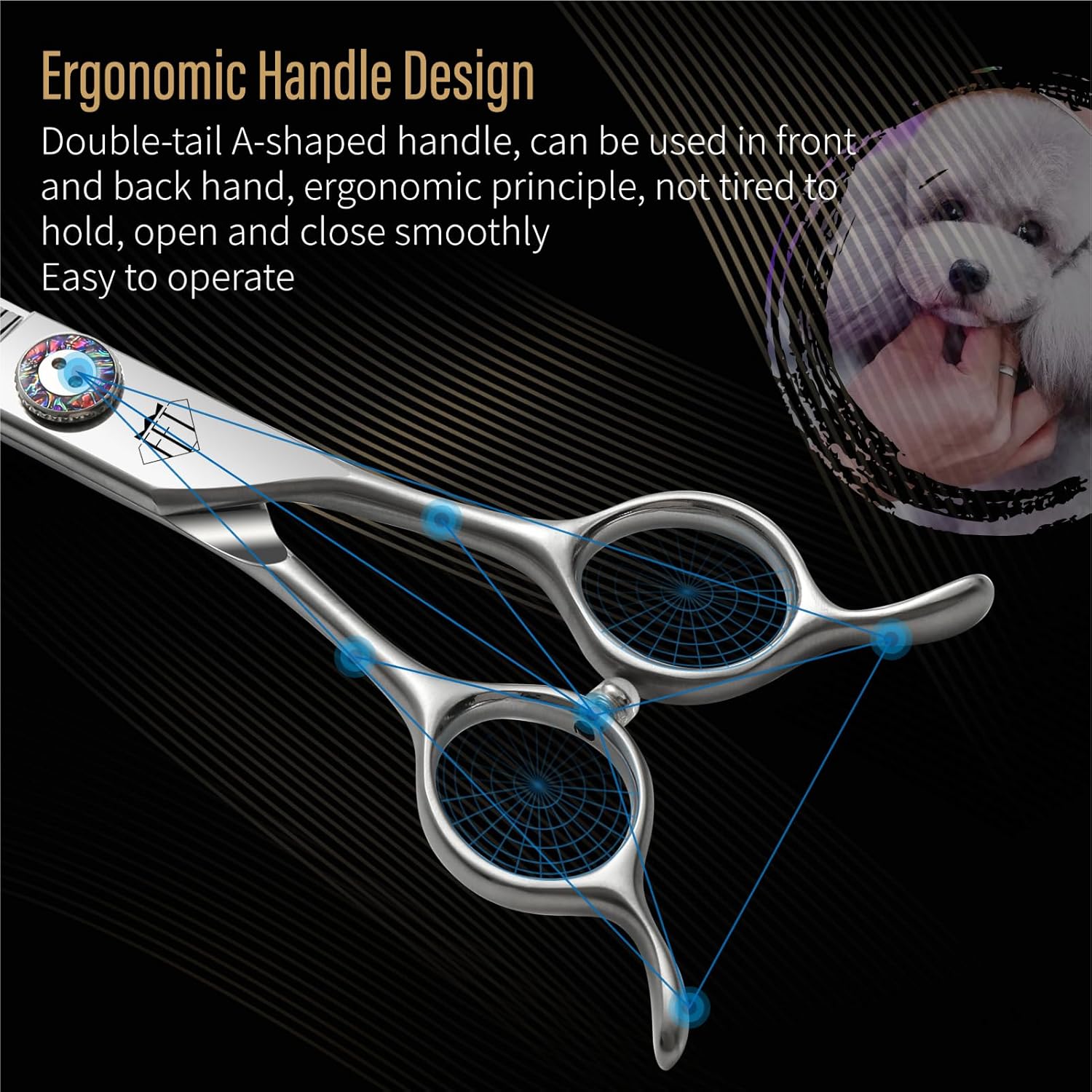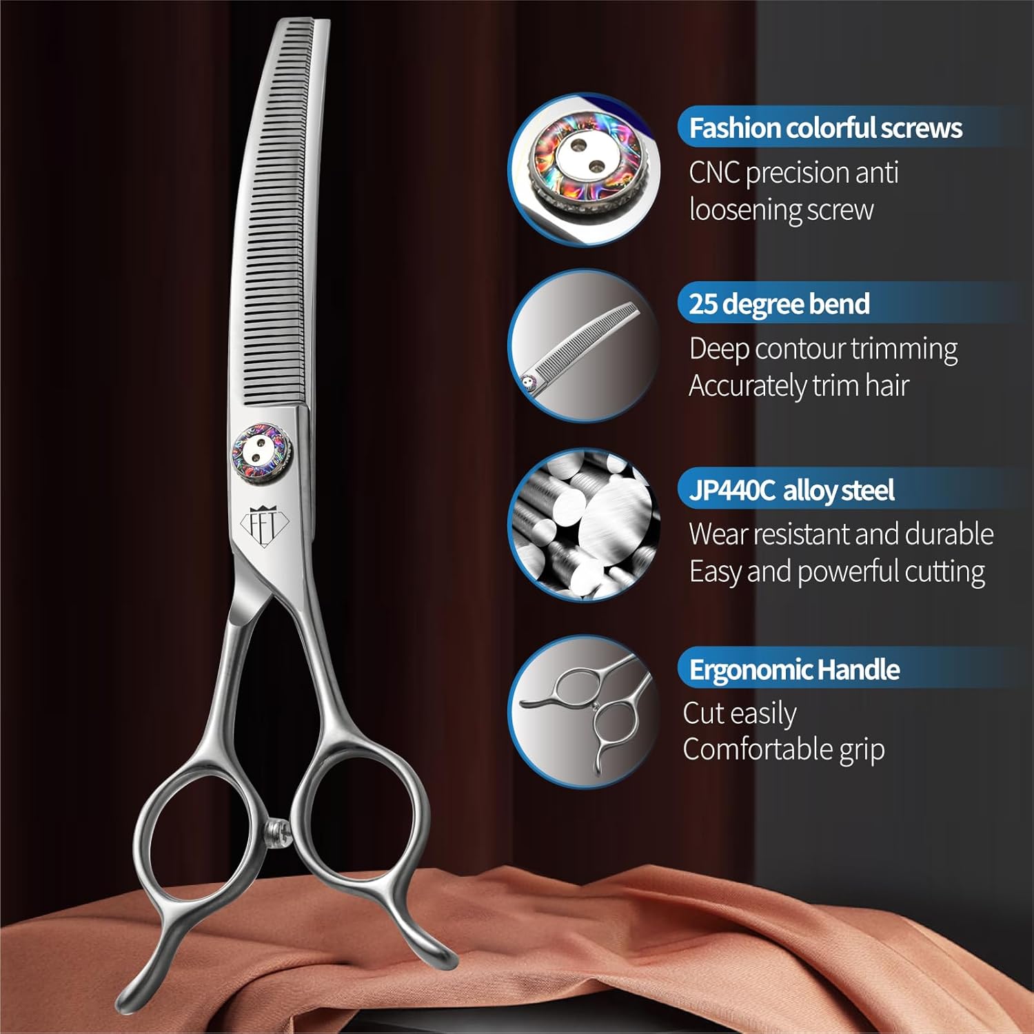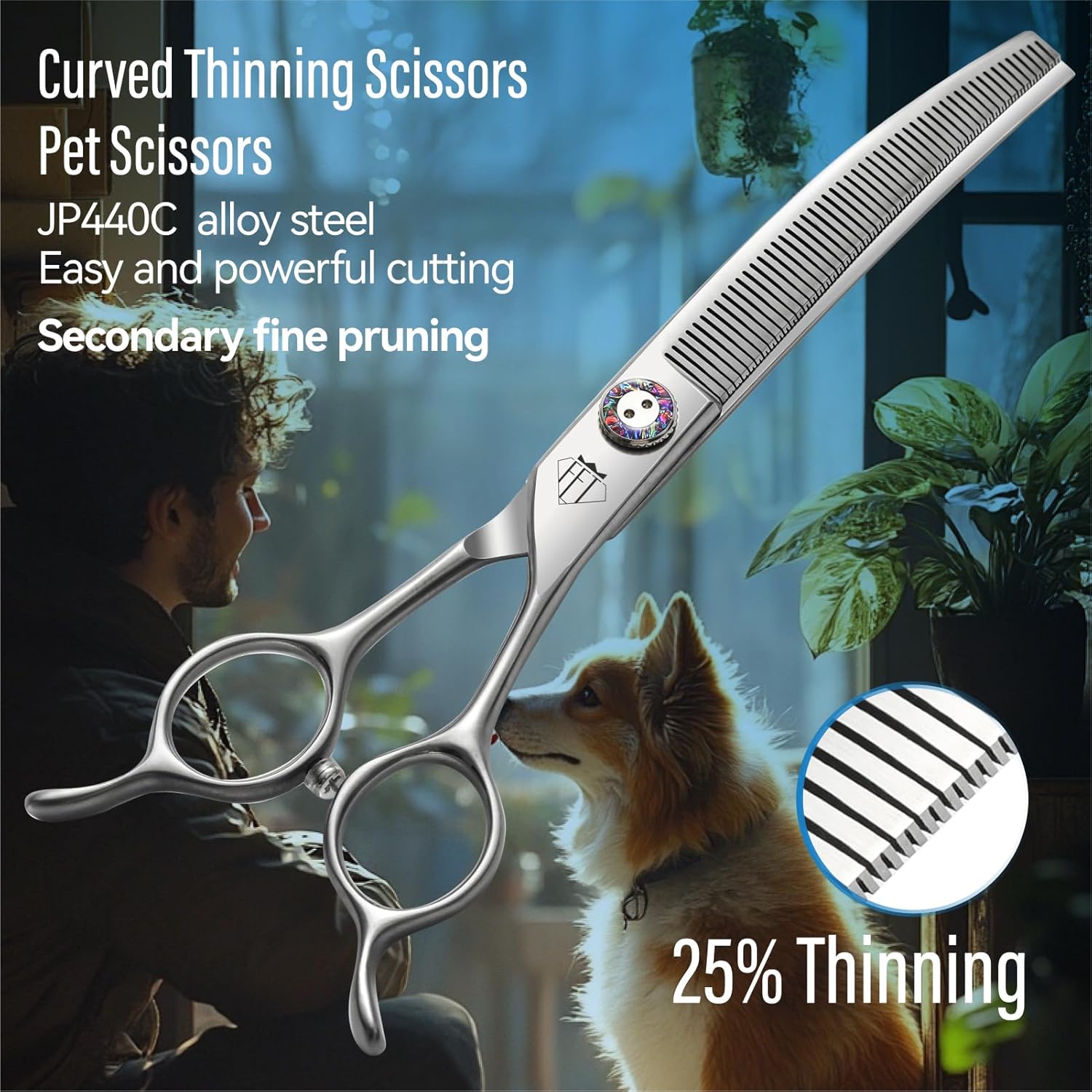 About this item PREMIUM MATERIAL: Made with Japanese 440C advanced stainless steel, these professional-grade grooming scissors feature a 7-inch blade for precise cutting V-SHAPED TEETH: Features specialized V-shaped teeth design for fine thinning and precise trimming, providing 25% thinning capability ERGONOMIC DESIGN: Comfortable grip handle with ergonomic design allows for easy and precise cutting, reducing hand fatigue during grooming sessions PRECISION ENGINEERING: 25-degree curved blade with deep contour trimming ensures accurate and smooth cutting performance QUALITY CONSTRUCTION: Equipped with colorful CNC precision anti-loosening screws for stable operation and consistent performance over time › See more product details