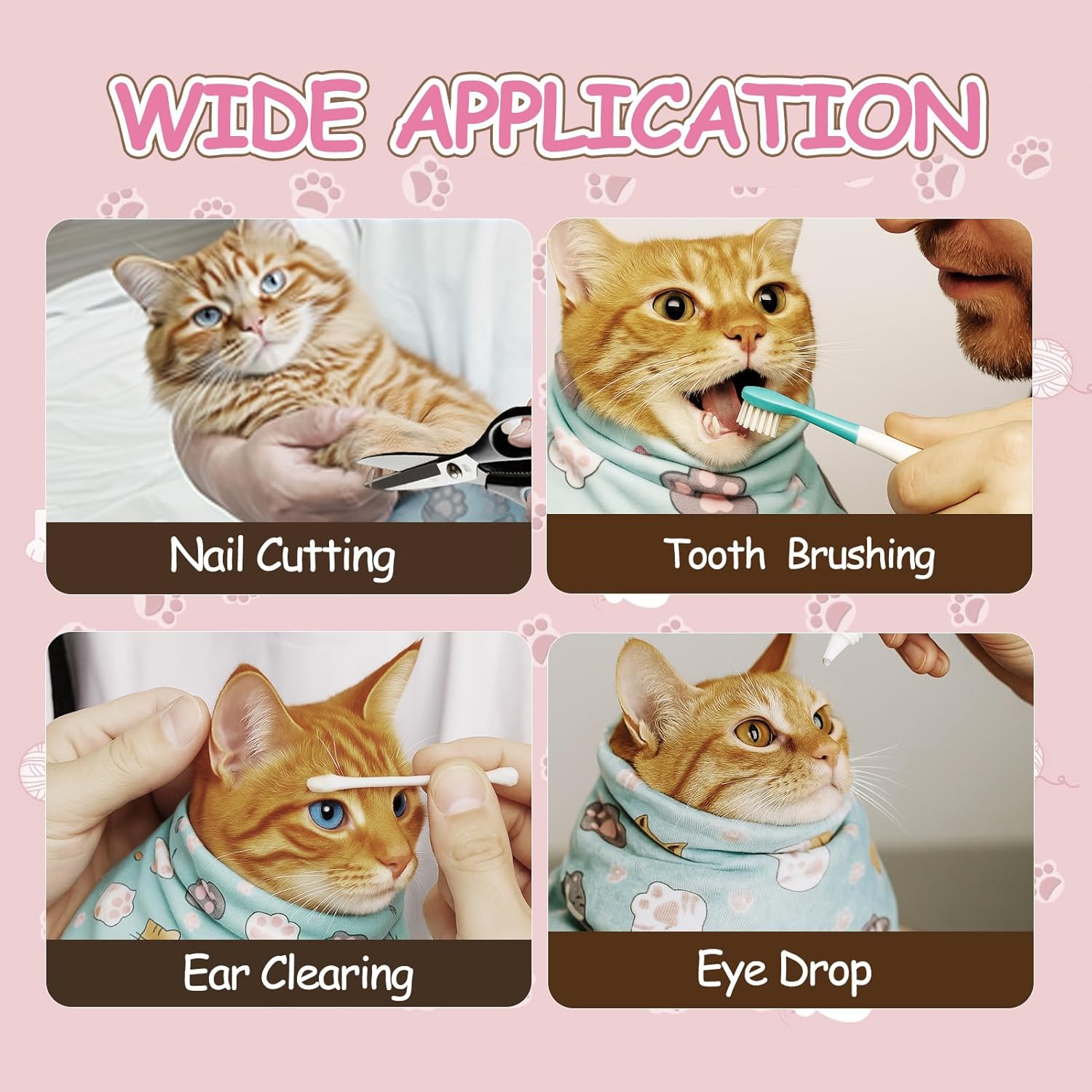 Rapid-Calming Comfort Design: Crafted from plush, pet-friendly materials, this cat swaddle wrap promotes quick relaxation during grooming. It gently envelops your cat, easing anxiety and creating a soothing environment for procedures like nail clipping with cat claw trimmers, enhancing efficiency and ensuring your cat’s comfort throughout the process. Noiseless Self-Adhesive Fabric: Utilizing premium, quiet self-stick materials, this grooming wrap produces no disruptive sounds when applied or adjusted during sessions with cat nail clippers. The silent application helps keep skittish cats calm, fostering a stress-free experience and improving the success of tasks like claw trimming. Reliable Restraint System: Featuring a thoughtfully engineered design, this wrap securely holds your cat in place, preventing escape or excessive movement during grooming. This safety-focused mechanism pairs seamlessly with cat grooming tools, minimizing the risk of injury and reducing stress for both the pet and owner, resulting in a seamless grooming experience. Versatile Grooming Solution: Beyond nail trimming, this multi-purpose wrap supports a range of care tasks, including ear cleaning, eye drop administration, and daily hygiene routines. Compatible with cat holders for nail clipping and other grooming essentials, it streamlines pet care, saving time and costs while delivering comprehensive functionality with cat grooming supplies. Bonus Premium Pet Hair Cleaner: Included with the wrap is a high-efficiency hair remover to tackle loose fur during grooming. Perfect for tidying furniture or maintaining your cat’s coat, this tool effortlessly clears excess hair, keeping your space clean and complementing grooming essentials like cat nail covers and files for a polished, comfortable result. › See more product details