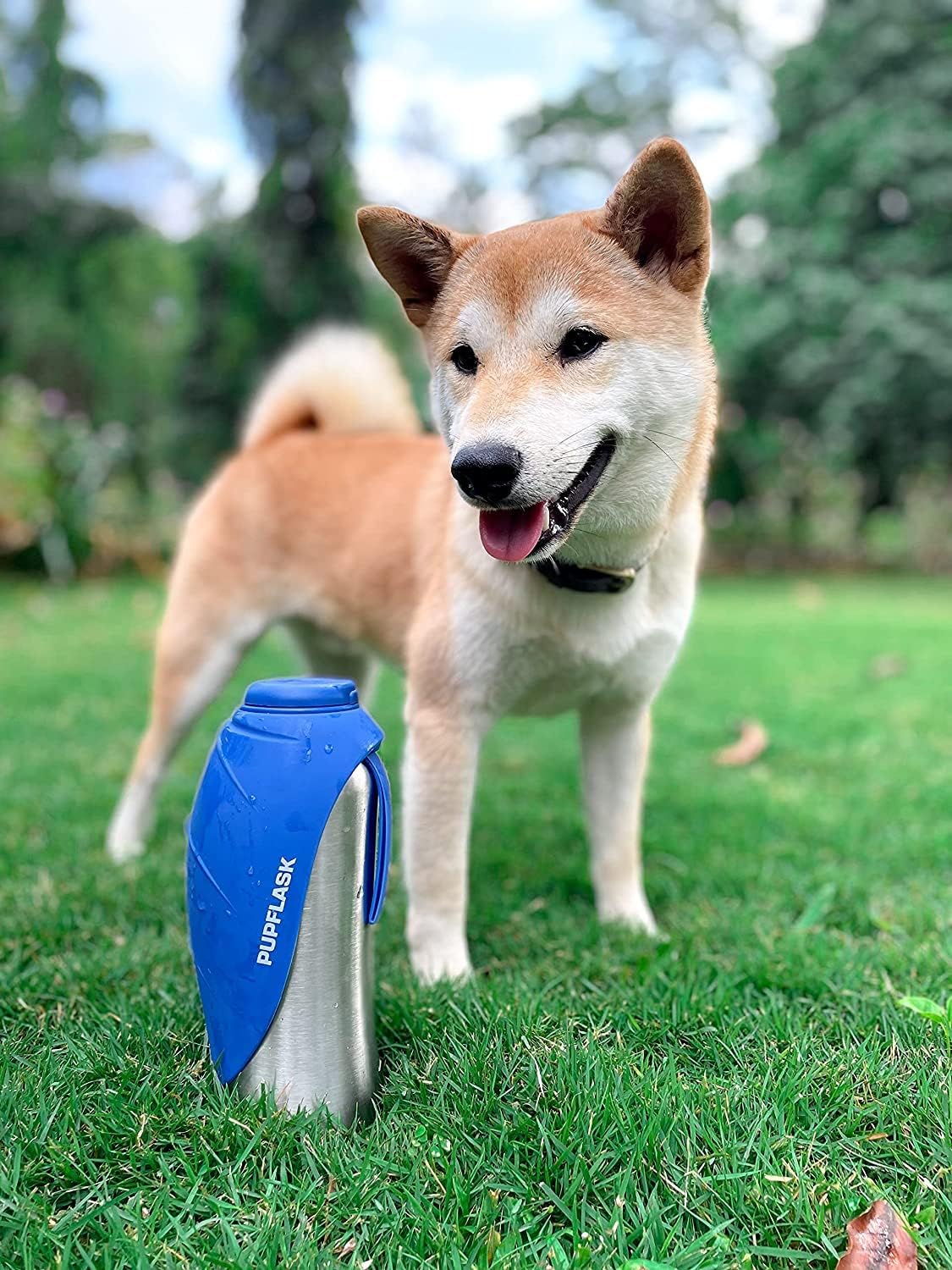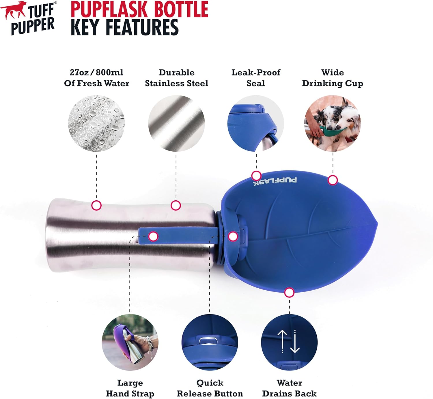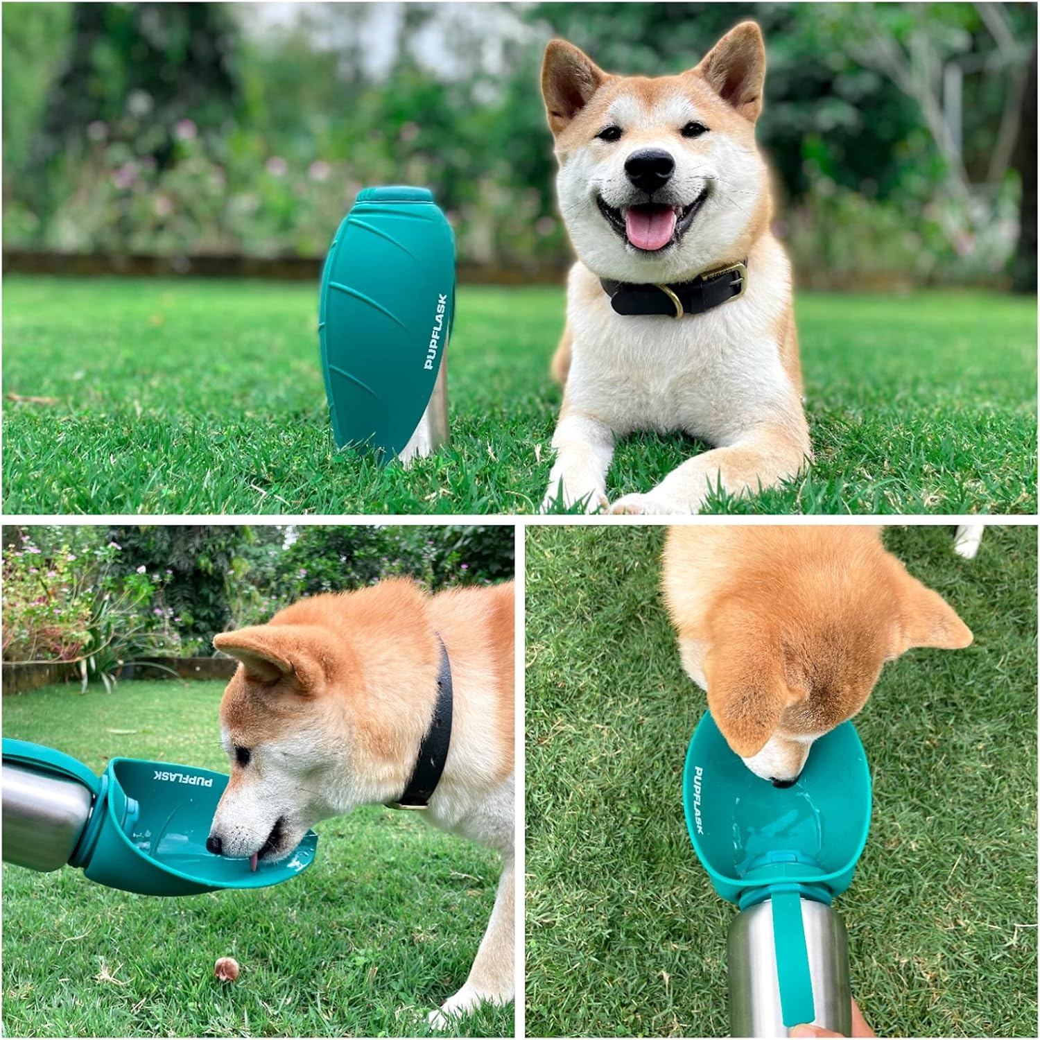 About this item HAPPY, HYDRATED PETS make the best traveling companions, and the PupFlask goes wherever you and your furry friend venture. Reversible leaf-shaped bowl lays flat over bottle when not in use. QUICK & EASY TO USE — Quickly flip up the silicone top to create a large cup, easily flip the silicone top back down when finished drinking. No wasted water, no messy, no extra bowl necessary. PERFECT SIZE - Holds 27 oz fresh water in a durable stainless steel bottle. The thick, extra large silicone cup quickly provides your pups with fresh water when travelling, walking, or any other adventures. Its the perfect travel bottle for pets. 100% FOOD SAFE AND ECO-FRIENDLY MATERIALS - 100% food grade silicone bowl cup. Odorless, and never holds a smell after use. Our extra large silicone collapsible cup for dogs, safely provides your pets with fresh water when traveling away from home. › See more product details