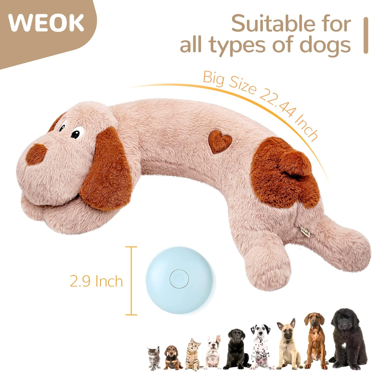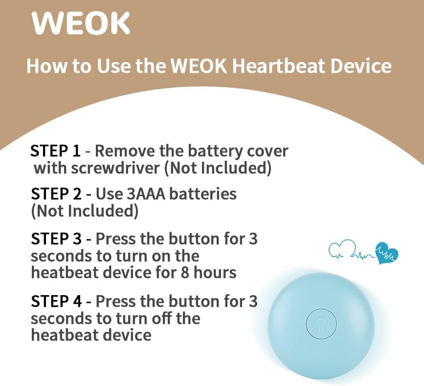 Anxiety Relief: The heartbeat puppy toy simulates an atmosphere of accompany, it can help puppies and cats to relief the separation anxiety, loneliness, go through the tough time and adapt the new home or other complex environment. it is a good behavioral training aid toy which could comfort your puppies sleep better.đđImportant tips for heartbeat device: Press and hold the switch long enough, it works; Press and hold the switch long enough, it stops. Behavioral Training Aid Toy: With a simulation true pulsing heartbeat module, the puppy heartbeat toy simulates an environment that the pets are not alone and someone is with them. it is a good companion and a sleep training aid tool for your puppies and pets. Heartbeat Simulator Module: The heartbeat Simulator need 3 AAA batteries(No battery included in the package). Press the button, then the heartbeat module works. Easy to operate. Durable and Washable: The puppy plush toy is made of comfortable and high quality fabrics, support machine washable on gentle cycle, just remember to remove the heartbeat simulator before cleaning. Our Service: we hope to provides the best company and comfort to puppies, cats. If you have any question, please do not hesitate to contact us. We will feedback to you ASAP. âș See more product details