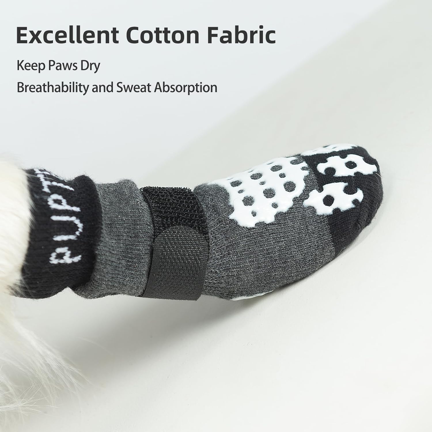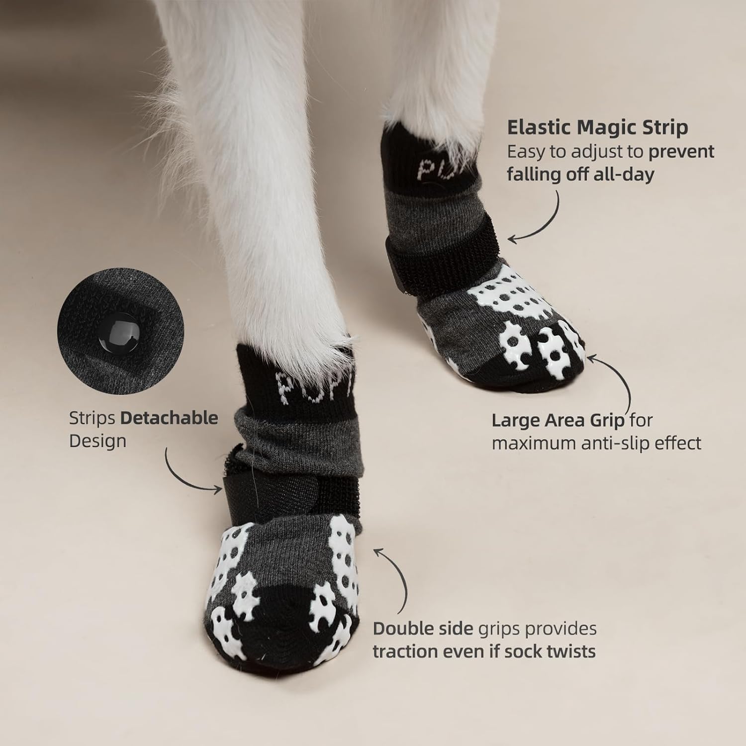 About this item : 2.9"-3.3" paw width for Size Large. This dog's socks are stretchy. We suggest choosing the smaller size if the dog's paw width is between two sizes. We have a total of five sizes for choice (XXS-XXL), which are suitable for small, medium large dogs. Please make sure to measure your pet before purchase : In addition to giving better traction to your dog, dog socks can protect your furniture, such as hardwood floors, wooden tables, sofas, etc., from being scratched by your dog's sharp claws. Besides, dog socks protect your dog's paws. It can be against heat on hot pavement, cold and road salt in winter, sore paws, and wear. But also as protection against a torn claw or cuts and wounds, to prevent licking. These socks are ideal for senior dogs : Each side of the sock has (Paw pattern Grip) which can offer extra traction when your dog is walking on the smooth floor. Even if the socks twist, they will still work. Besides, the design of the double-sided grip makes the socks a longer life. When the grip on one side is worn and does not have the anti-slip effect, you can let the dog wear the other side to play a new anti-slip effect : Dogs like walking around in the house, if the socks don't have any fixed measures, the socks will fall again and again. In order to improve this defect, our socks have sticky straps which are adjustable and removable. You can adjust it according to your dog's feet, and you can remove it when you need to wash the socks. It's very convenient to use. Since then, the socks will not fall off repeatedly : Our socks are touches very soft and comfortable, also the material has elasticity which can let your dog's paw feel not too tight, and not easy to fade or tear. Besides, the socks are breathable which won't too stuffy in the summer. Our socks are a great alternative to bulky dog booties › See more product details