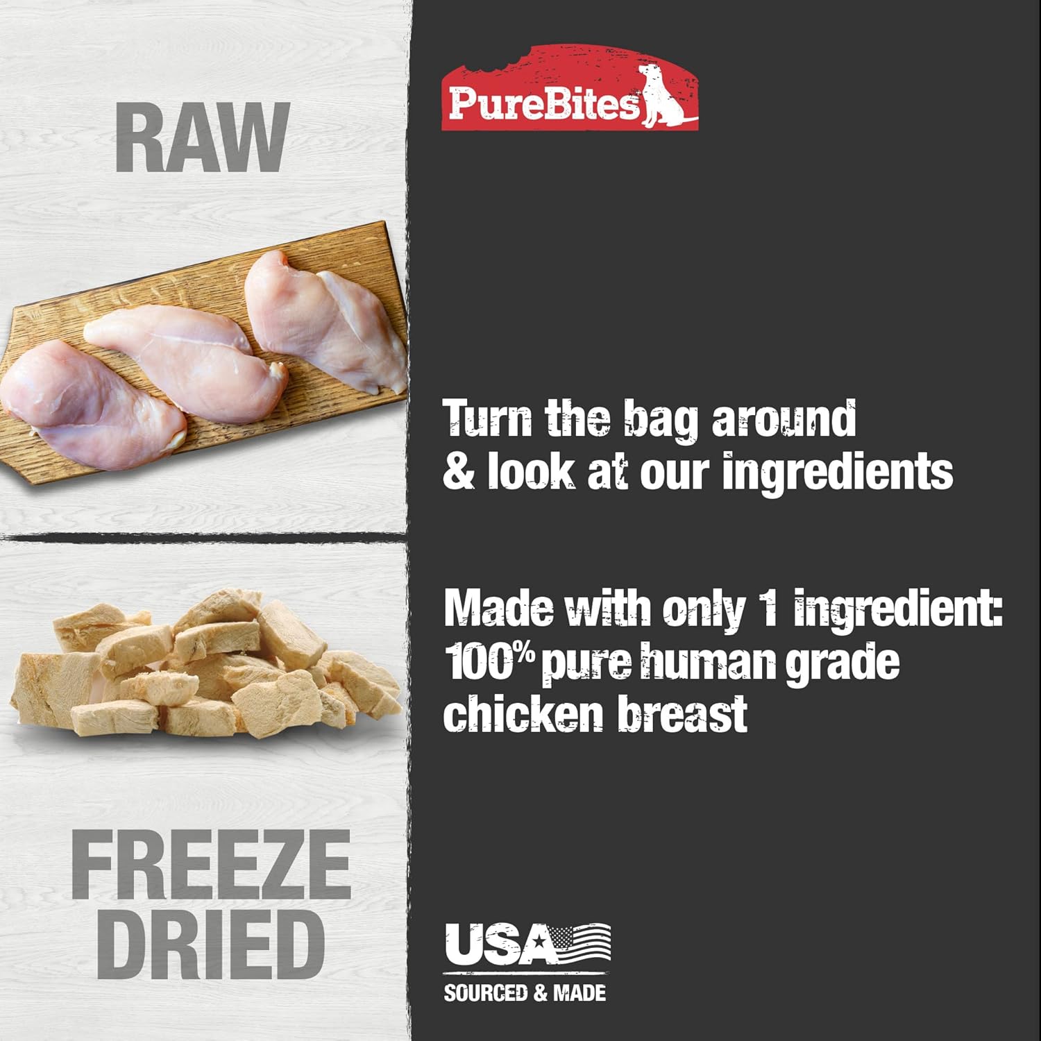 About this item Go ahead, look at our ingredients; made with only 1 simple human grade ingredient: 100% pure chicken breast; proudly sourced and freeze dried RAW in the USA; a great high-value treat, topper, or training aid for your dog Made fresh & pure, using a delicate freeze drying process that helps preserve fresh RAW whole food; with 1.9lb of RAW chicken breast and 325 treats per 8.6oz bag, our bags are packed with more protein and nutrients Dogs love the taste of PureBites! 100% natural, high in protein, low in calories (only 3 calories per average treat) and nothing added like colors, fillers, or sweeteners PureBites are ideal for dogs with diabetes, allergies, other health issues, or dogs that are on a restricted diet; limited ingredient treats or toppers allow pet parents the peace of mind knowing exactly what their furry loved ones are eating everyday In an effort to do our part, PureBites freeze dried treats are packaged in recyclable bags that we can recycle today for a better tomorrow; all PureBites treats, food, mixers, and toppers are always backed by our 100% money-back satisfaction guarantee › See more product details